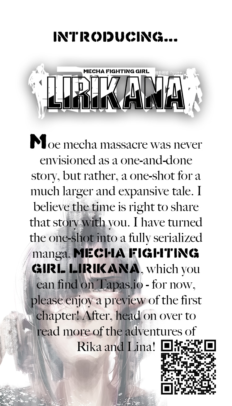 Long time no see! I want to sincerely thank all Moe Mecha Massacre readers for supporting me. You guys are an AWESOME community! I hope you guys are ready for more, cuz I've got a ton of awesome adventures planned! Please support MECHA FIGHTING GIRL LIRIKANA!