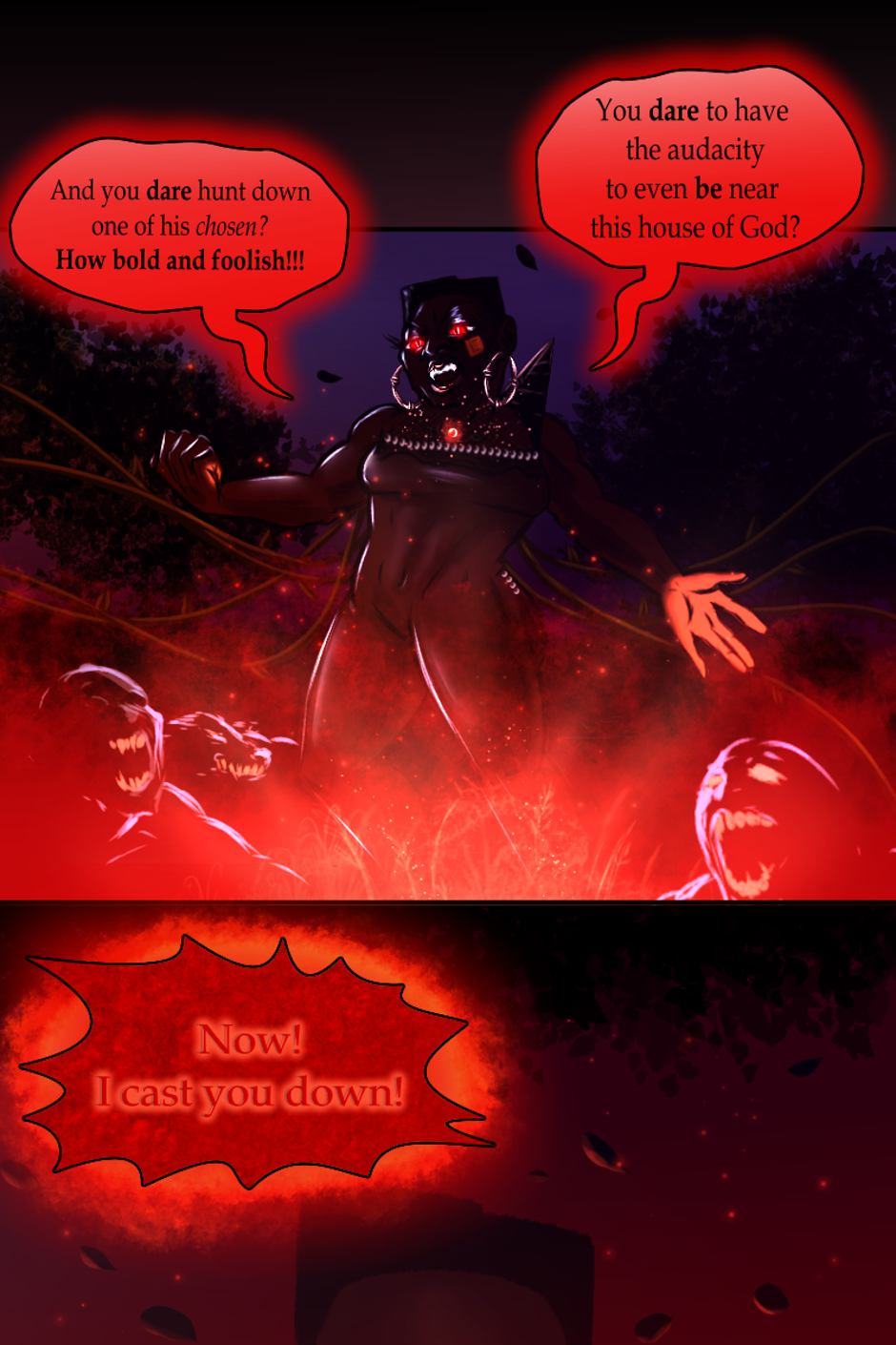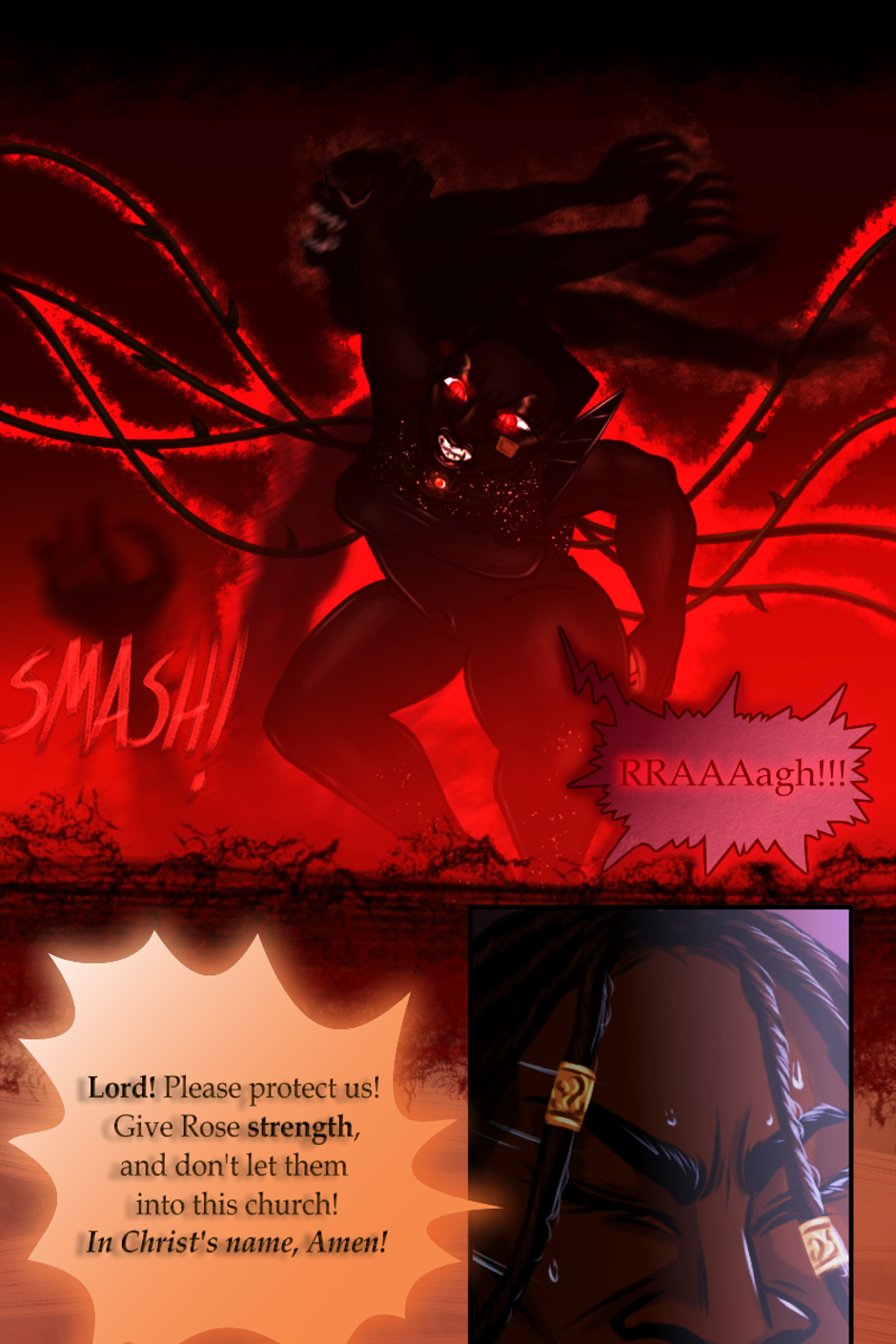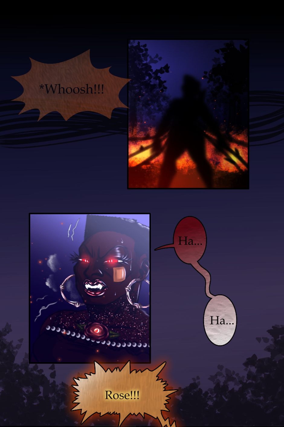 Battle ensues outside of Little Love Chapel. All Rev. Alexandre can do is watch and pray. He's never seen demons in the waking life right before his eyes like this. They were grotesque and disturbing. Rose tore them down one after another. Physically fighting them wasn't enough. She had to cast them out with the Holy Spirit. She felt Alexandre's prayers, and it gave her more strength to finish them. Her disdain and hatred for evil ignited the fire. They were burnt up in the Holy flames and sent back to hell. The last of Rose's energy was used up, as the ambers of the flames went with the wind, she collapsed in the Chapel's yard.