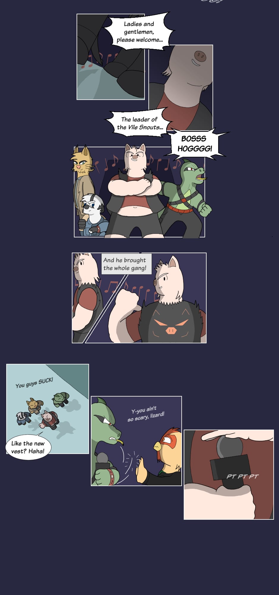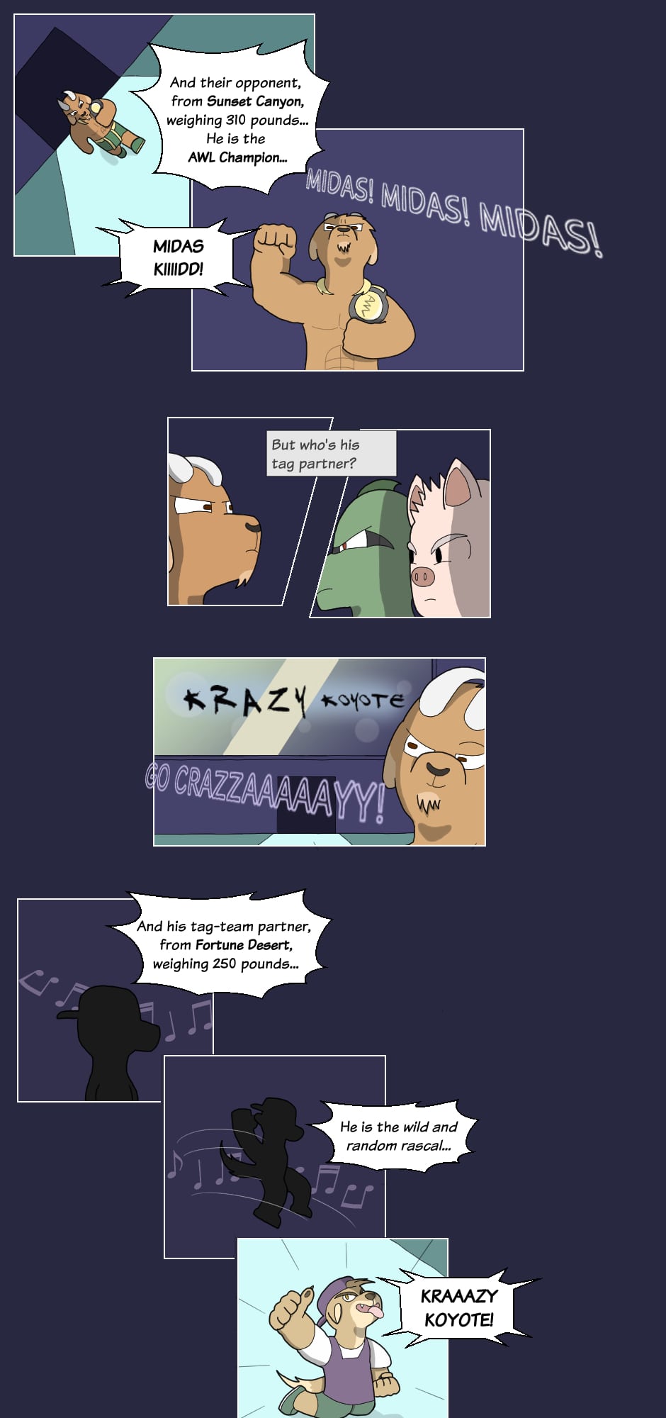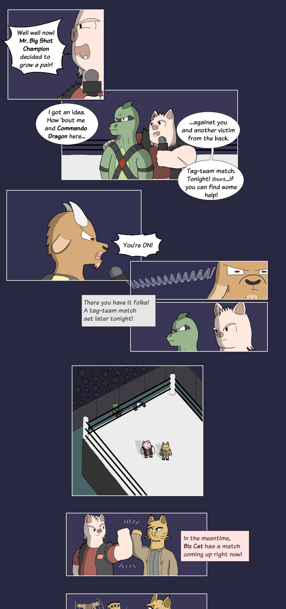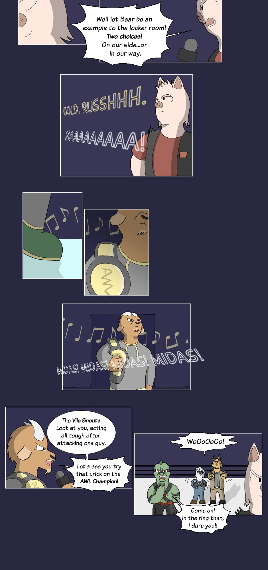 But outside the ring though...name's Gus Orikson; a completely opposite pig from earlier. Eh, guess you can say I kinda go with the flow. You'll see me hanging around these guys most of the time. Heh heh, they're always up to something.