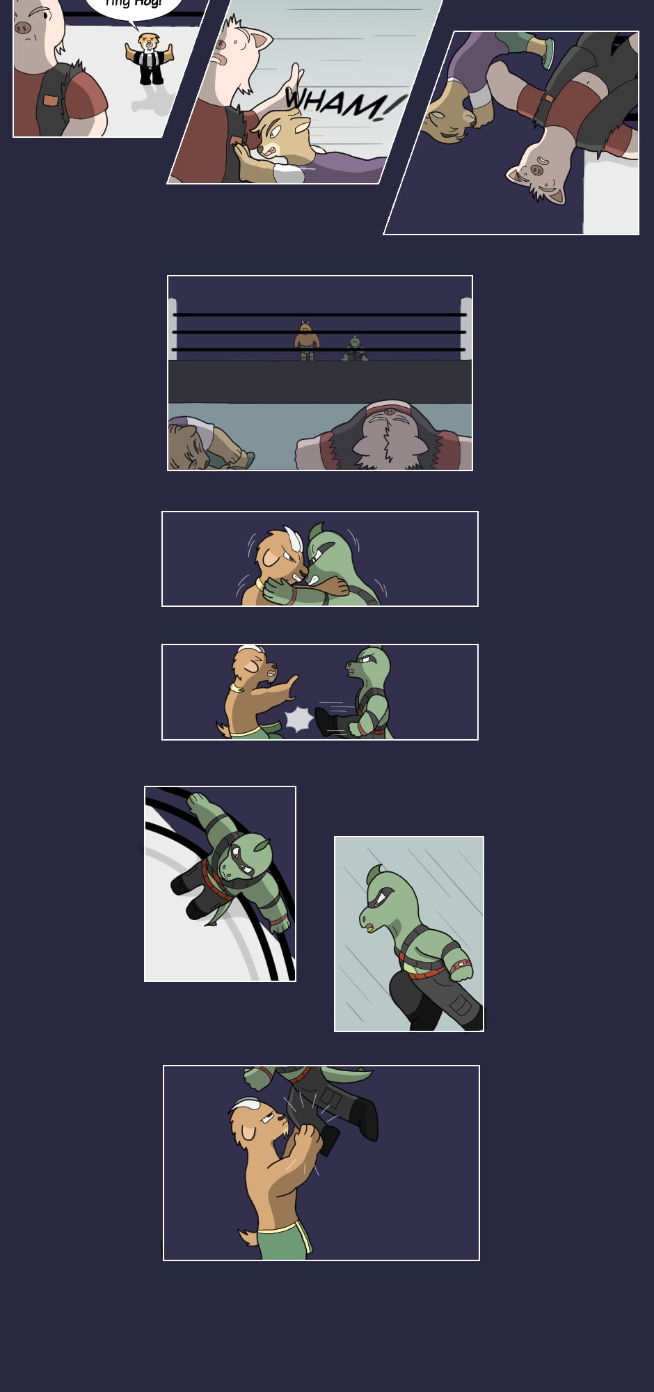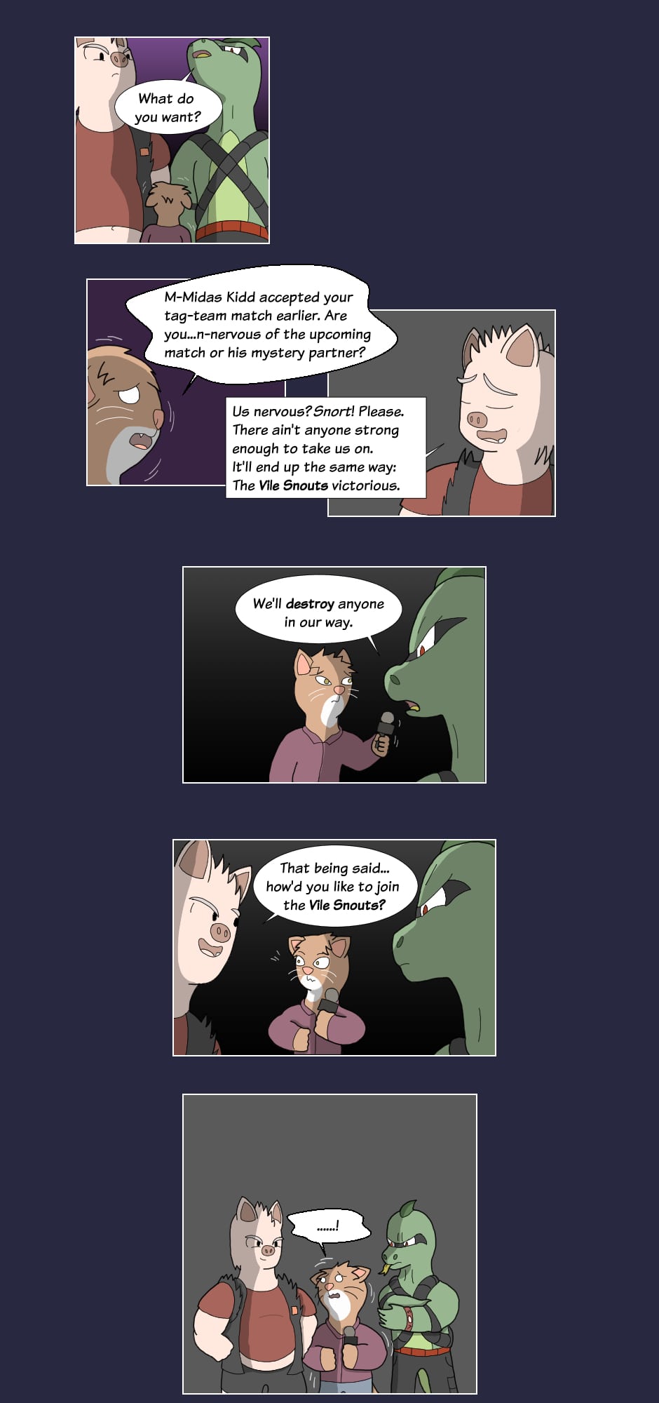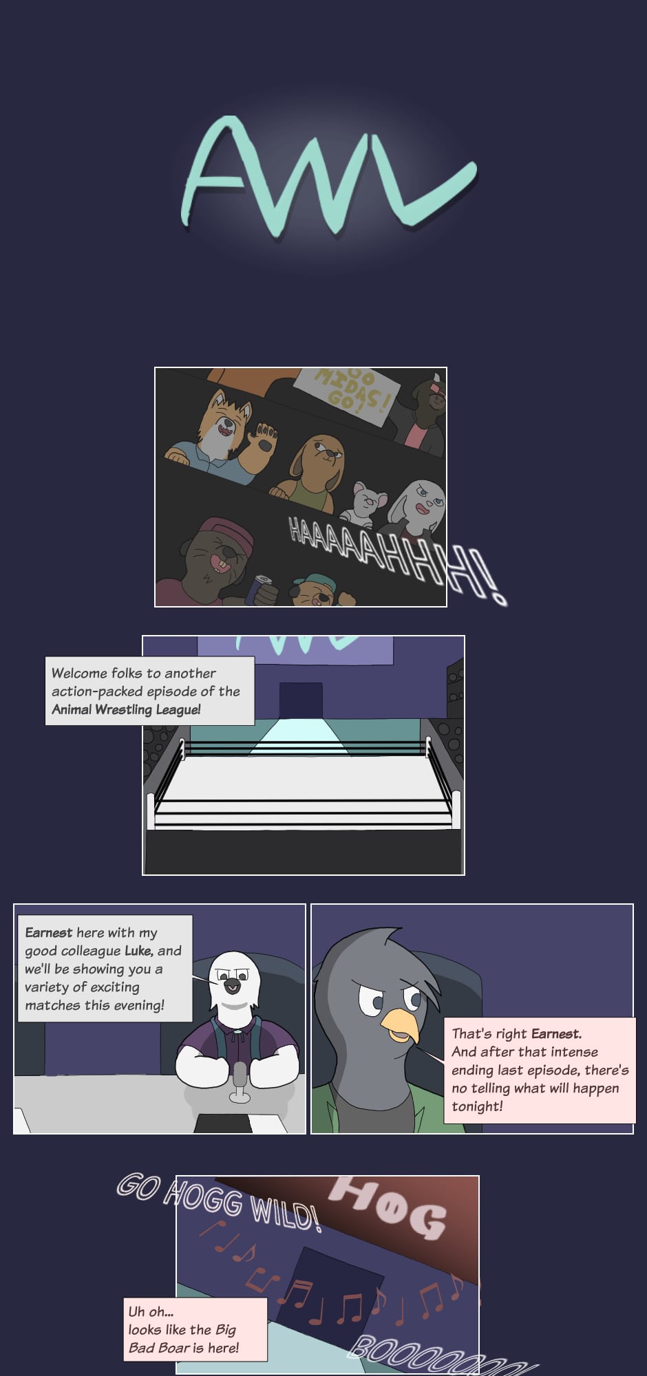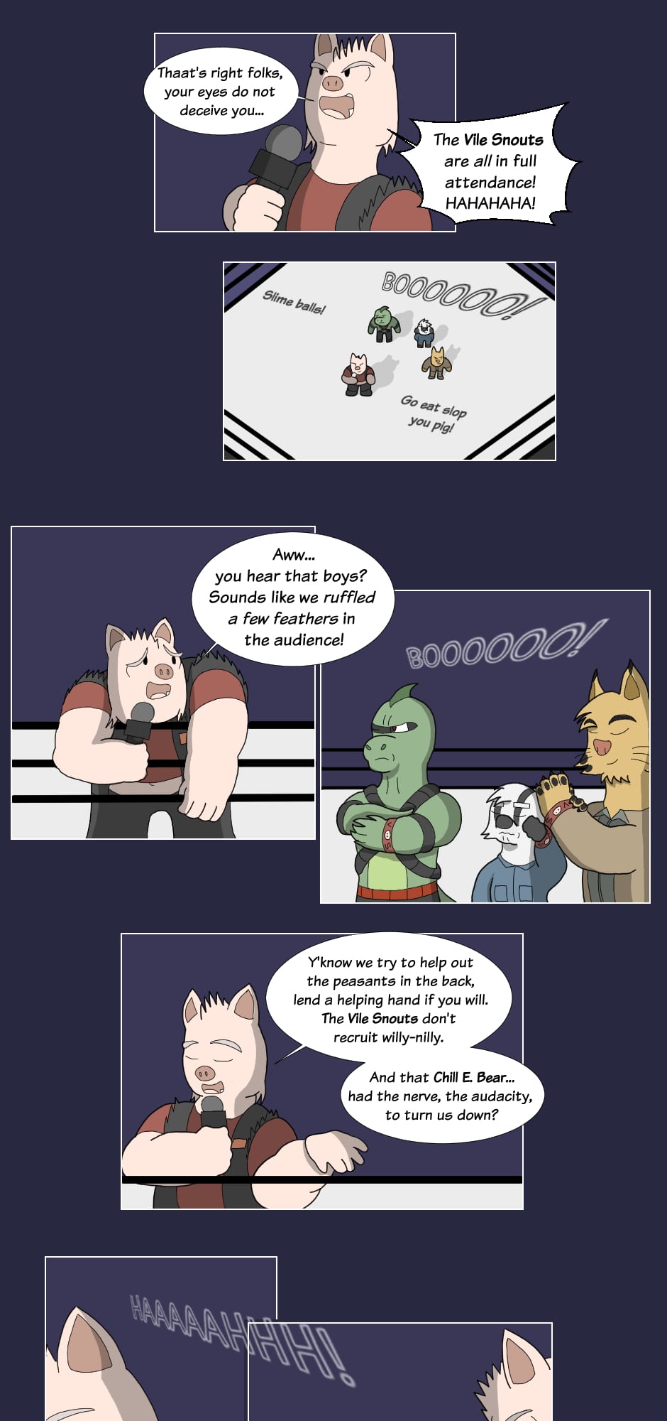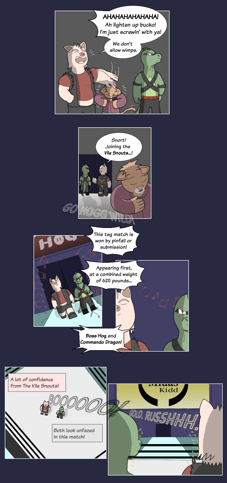"Hey how's it goin'? They call me Boss Hog: the big, bad leader of the Vile Snouts. Along with Commando Dragon, Trash Can Badger, and Biz Cat; we're infamous for our antics across the entire Animal Wrestling League. Interfering in matches, attacking outside the ring, or just plain cheatin': the Vile Snouts win by any means...!