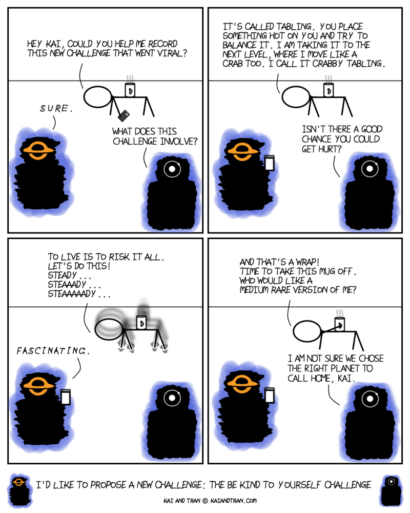 A comic about alien immigrants by a resident alien immigrant. You know how our thoughts are chaotic about certain things and organized about others? Kai and Tran are alien beings that embody each of those qualities. Watch them as they navigate our world and learn our human ways. These are short-gag comics and are updated weekly. Follow us on Instagram (@kaiandtran) for extra content.