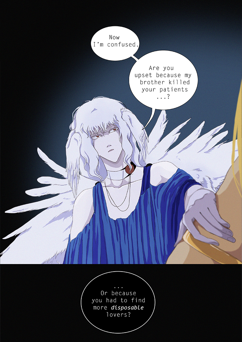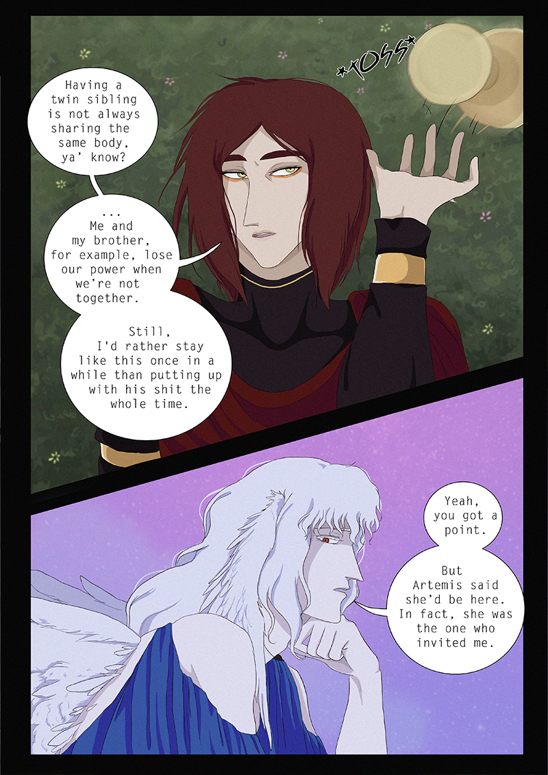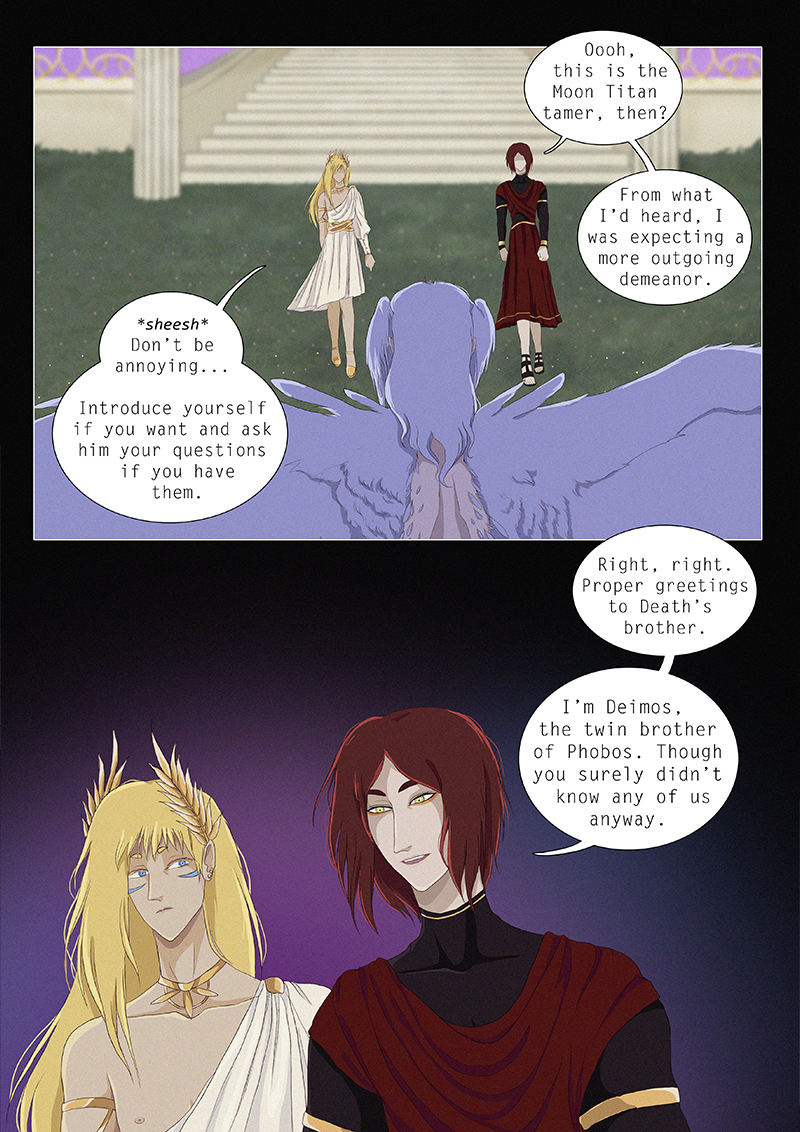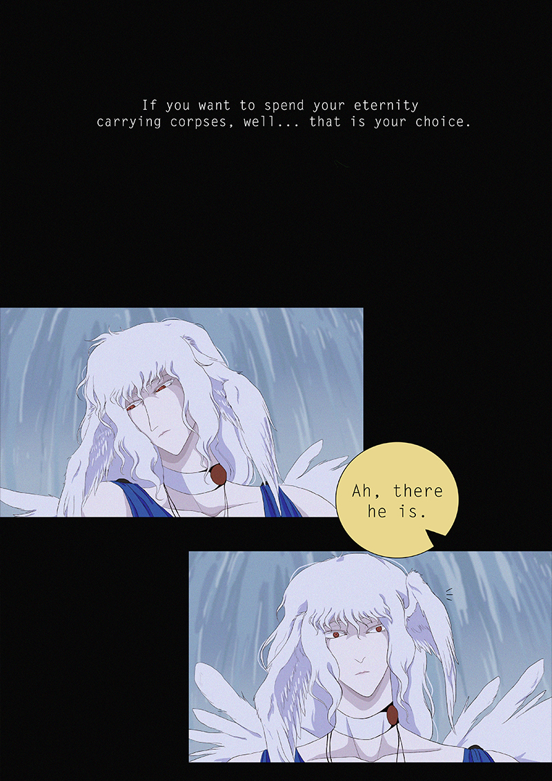 Hypnos and Thanatos share the same face, the same strength and a close bond in spite of their opposite personalities: While Sleep is gentle and embraced through his friendly nature, Death has grown cold and self-absorbed under the weight of his endless duty.
