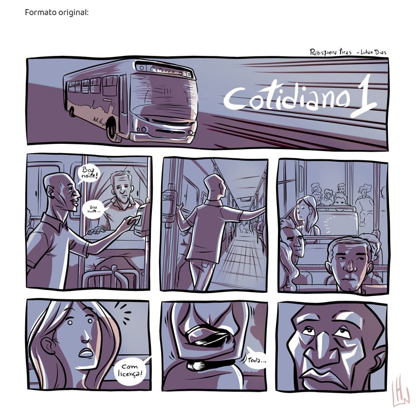 Aquilo que a gente vê todo dia e finge que não é nada demais. Obs: A primeira tira que fiz desse projeto, lá em 2014 quando as preguiças gigantes ainda andavam pela Terra. A primeira e única até 2020 quando comecei de fato a série de tirinhas.
