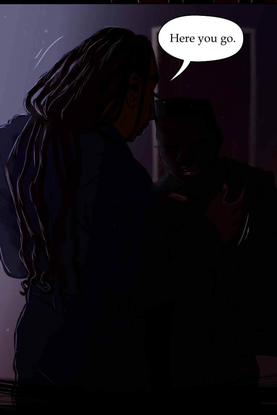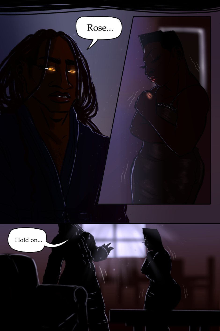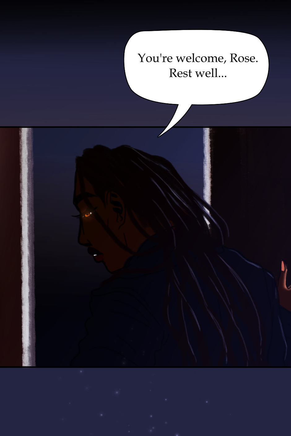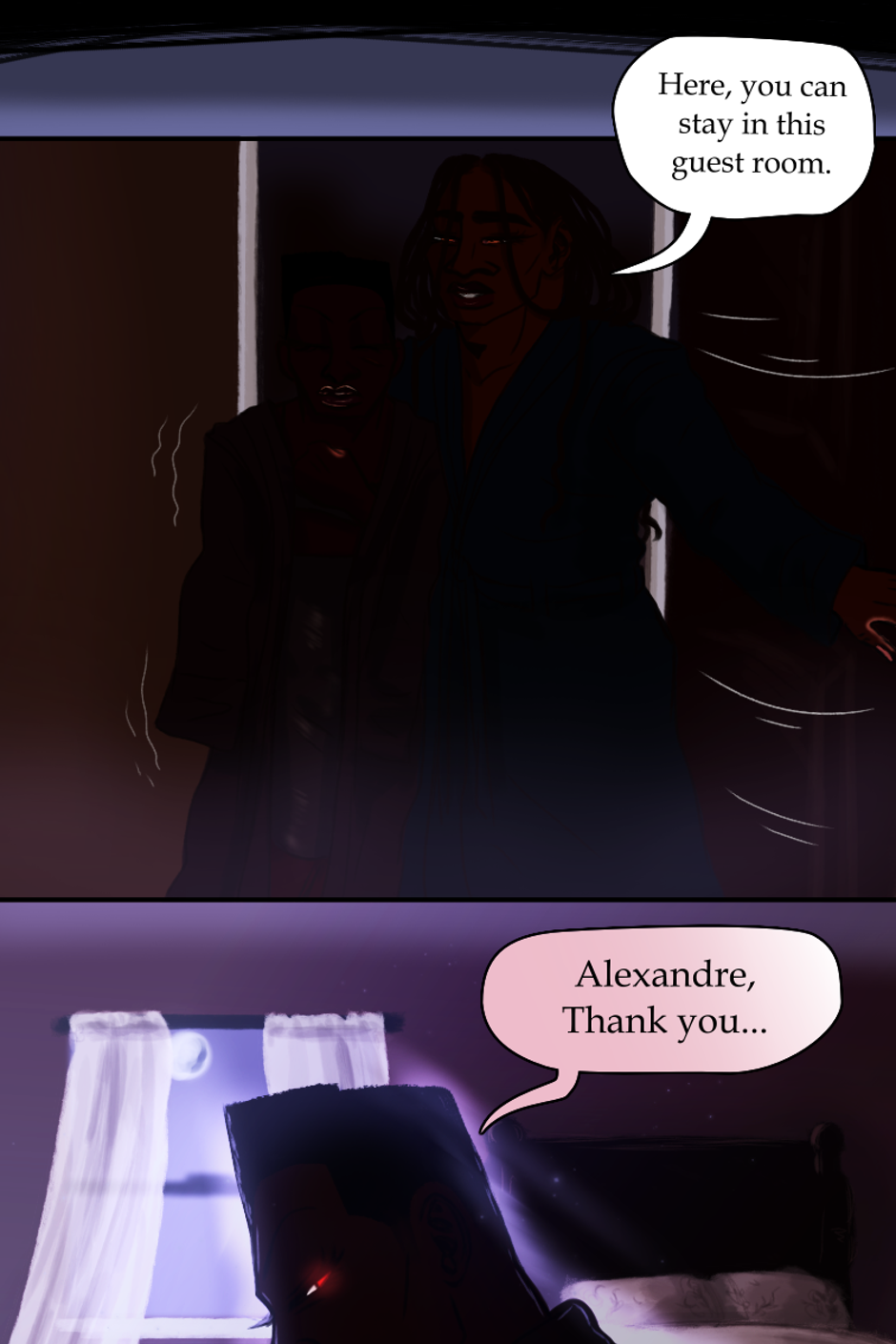 When settling down after the eventful night, Rev. Alexandre returns to the living room to find Rose missing from the couch. As soon as he questions her whereabouts, the bathroom door opens. He is faced with a barely awake, shivering Rose. He gives her a robe and escorts her to the guest room where she is welcome to stay. Rose spares the last of her awakened state to thank Alexandre before calling it a night.