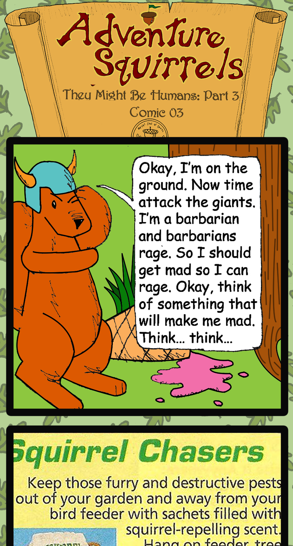 Hail and well met! In a smaller world within our own mundane one, there lies a world of wondrous magic, dire monsters, and epic quests that forge legendary heroes... or so they think, meet the Adventure Squirrels. A comic about a nutty party of rodents having Don Quixote -like misadventures in the city park. It's a new comic sure to please longtime fans of RPGs and fantasy in general, while being clean and charming for younger folk. Join Olney the wizard, Skiurid the ranger/rogue, and Ekorre the barbarian on a quest for acorns and XP. Huzzah!