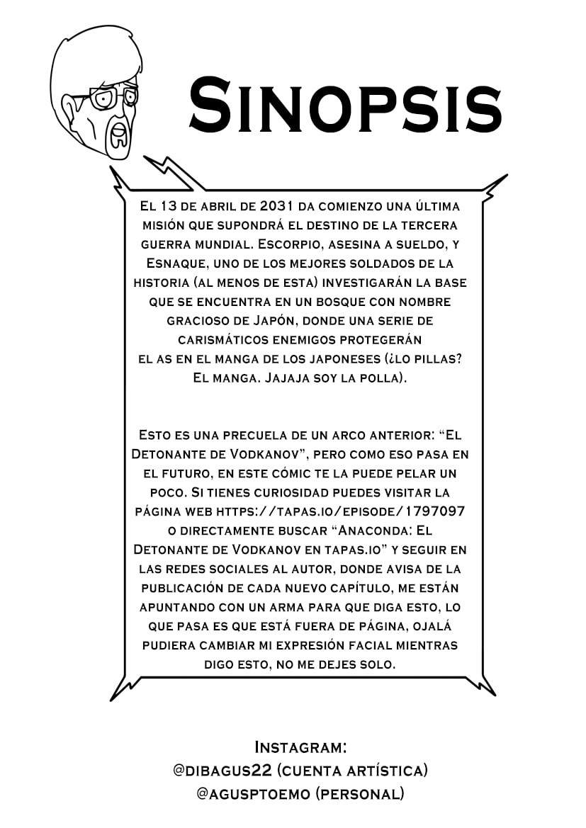 Esto es una precuela de un arco anterior: “El Detonante de Vodkanov”, pero como eso pasa en el futuro, en este cómic te la puede pelar un poco. Si tienes curiosidad puedes visitar la página web https://tapas.io/episode/1797097 o directamente buscar “Anaconda: El