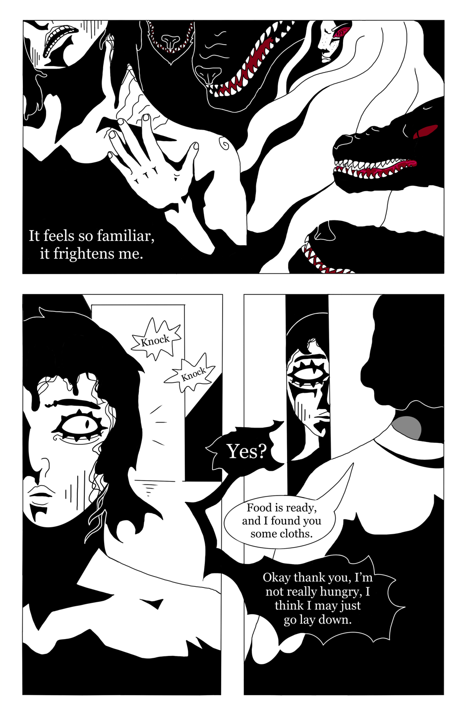 Panel 1 - a shot of Monroe’s neck, their head bent to one side. They run their hand along their exposed neck where the scar is. Next to them in the frame are representations of their thoughts, a figure in white with long hair and a red eye accompanied by four black dog snouts. Text reads. “It feels so familiar, it frightens me” - Panel 2 - a half shot of Monroe’s face as they look behind them in response to someone knocking on the door twice. - Panel 3 - Monroe cracks open the door and peeks out, they are met by Antonio. Monroe says “Yes?” Antonio says “Food is ready, and I found you some cloths” Monroe responds “Okay, thank you. I’m not really hungry, I think I may just go lay down.”