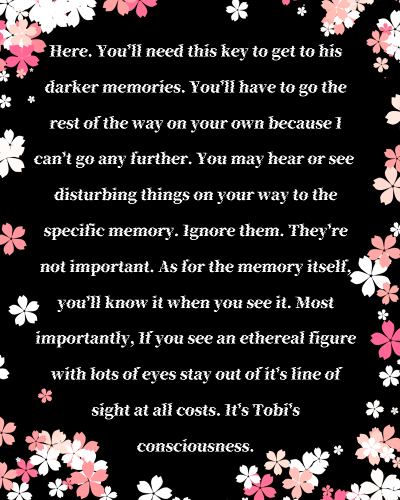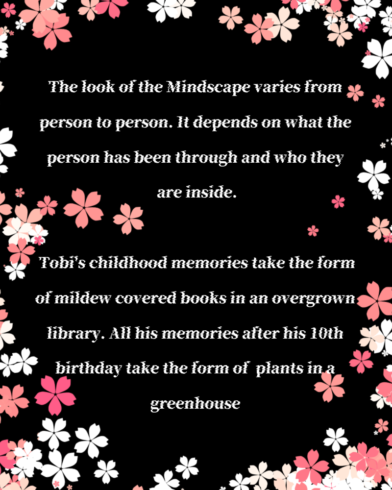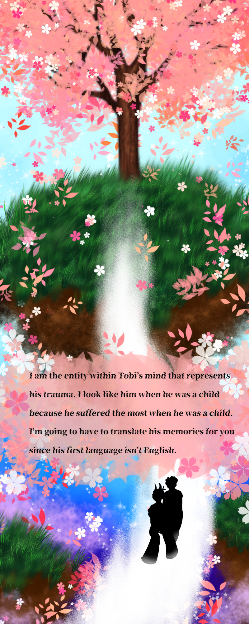 The Tree in the beginning is meant to be an almond tree since personality wise Tobi is like an almond; if treated wrong is bitter and deadly and if treated right is subtly sweet