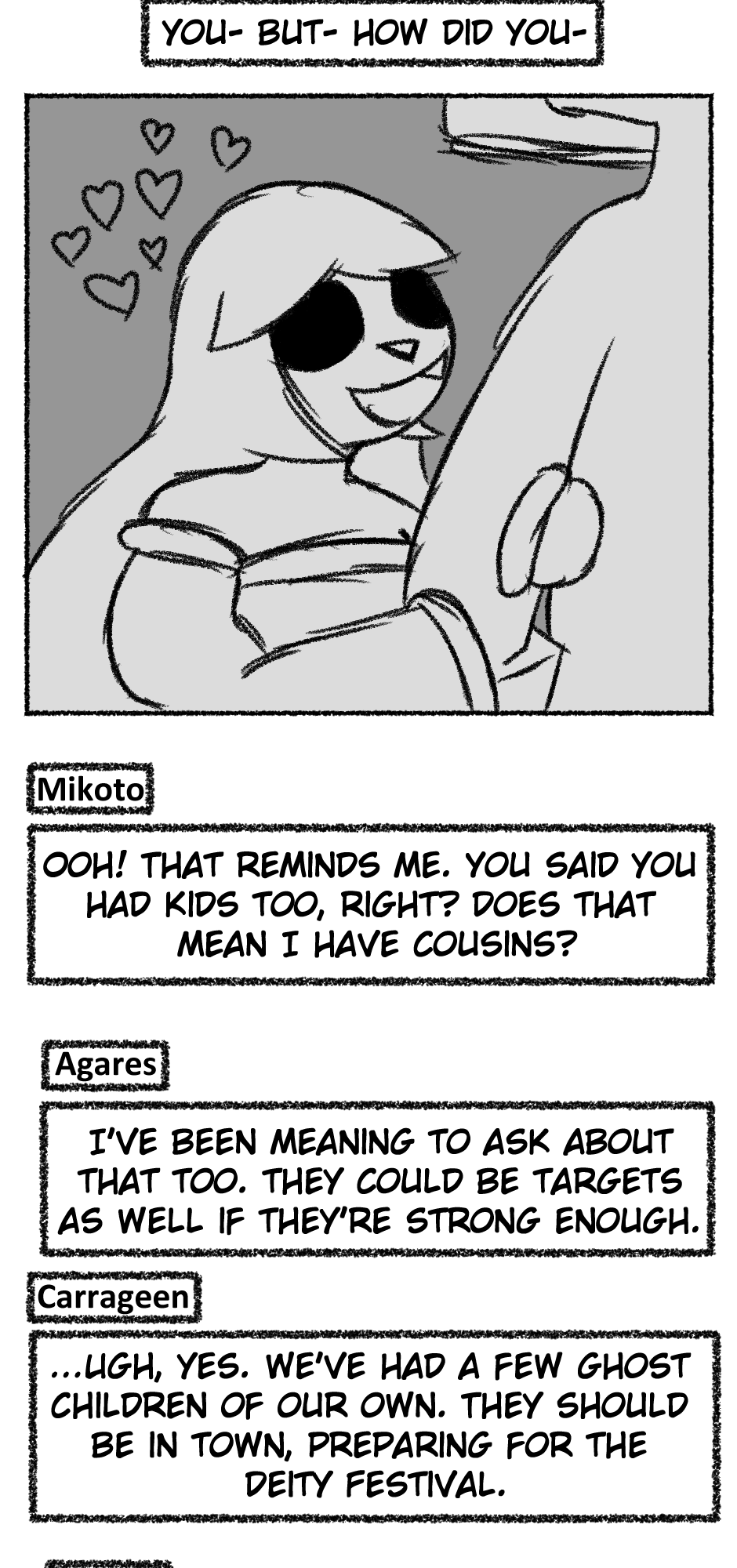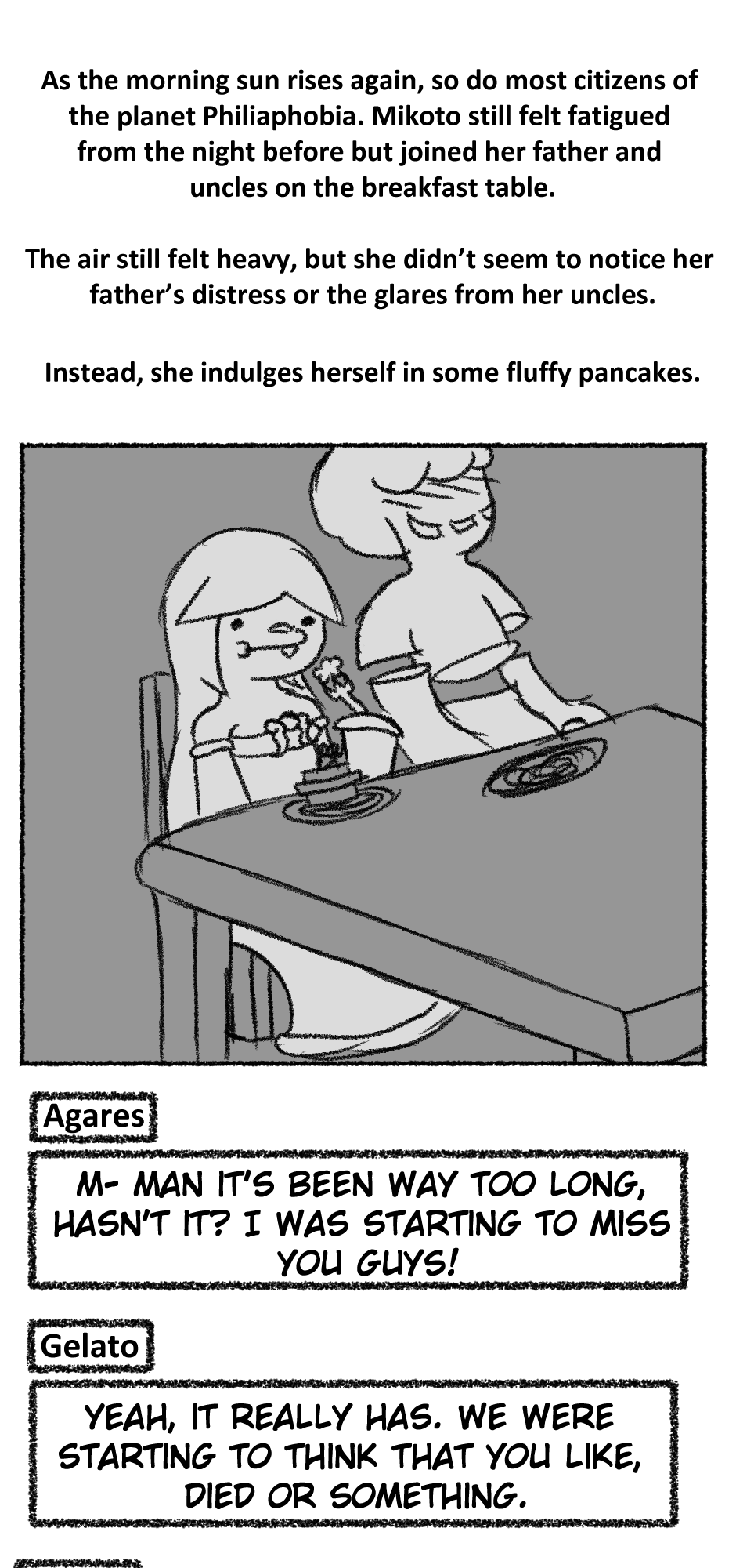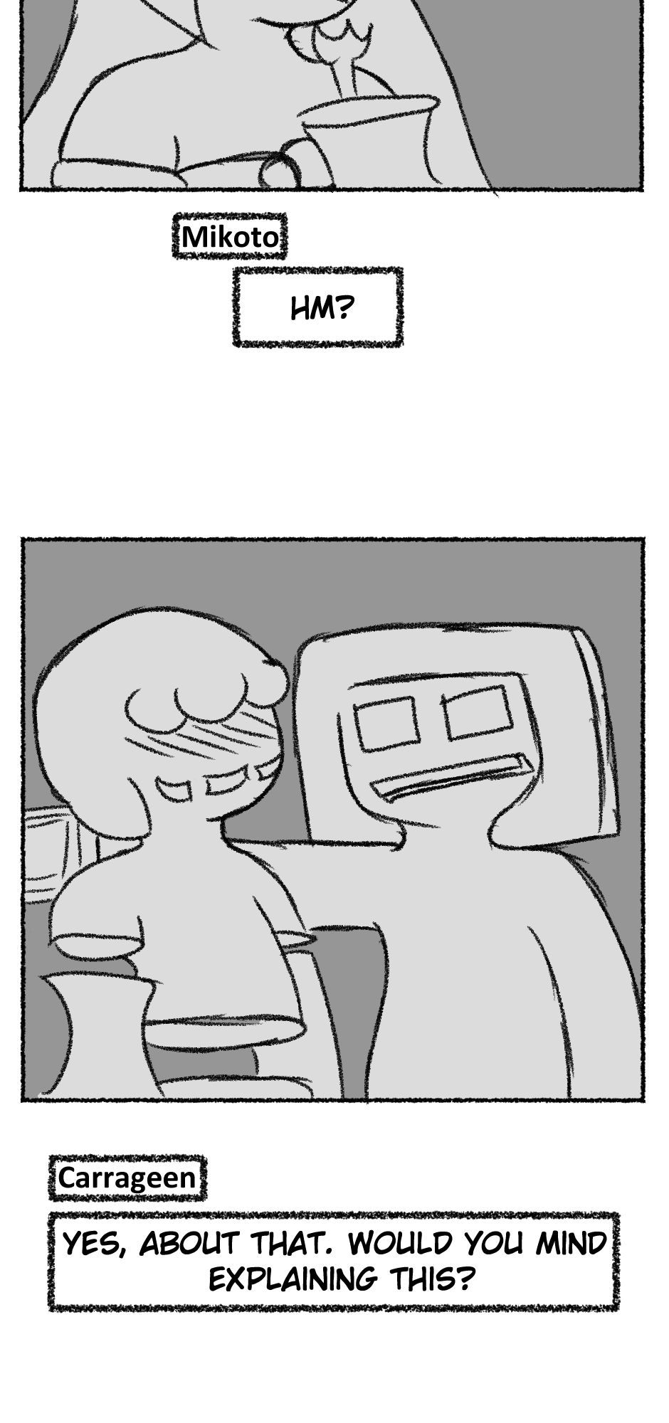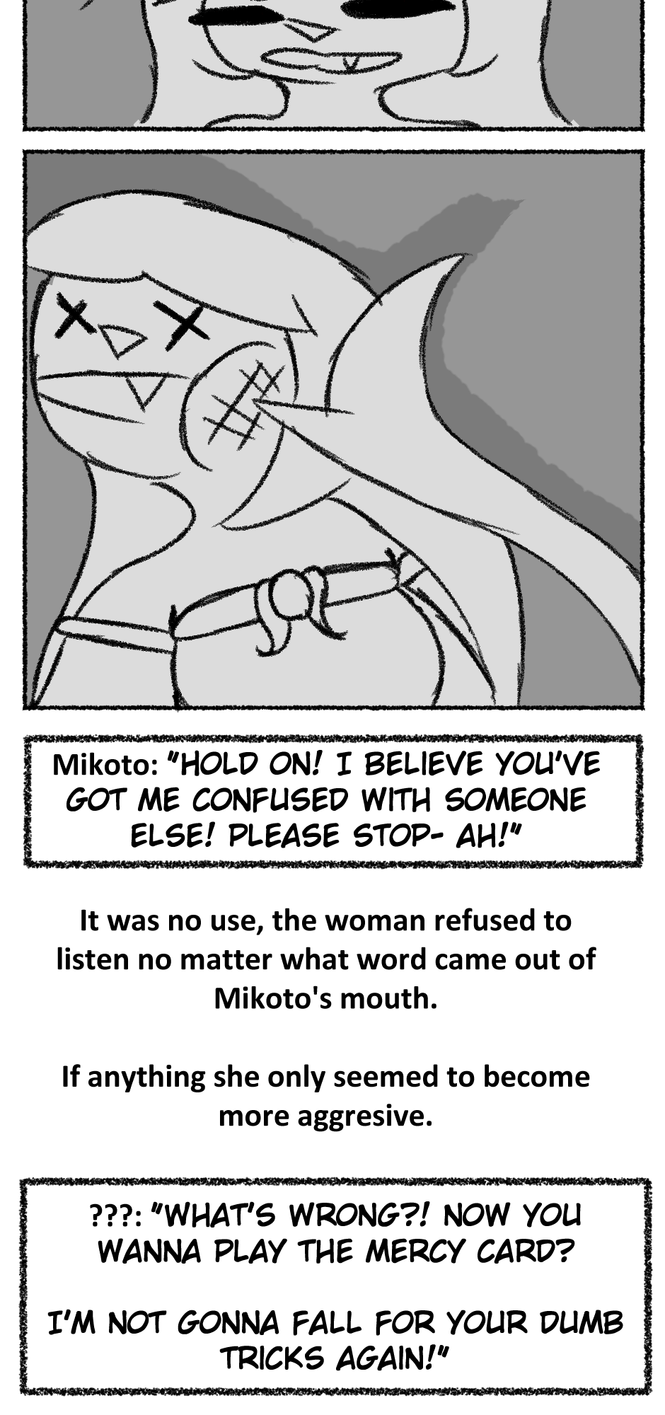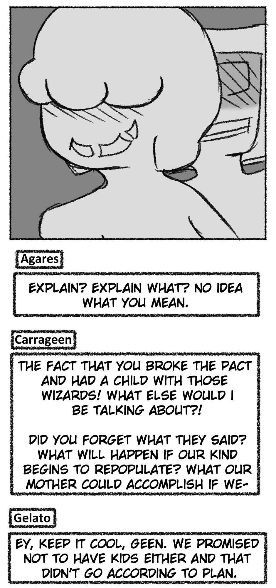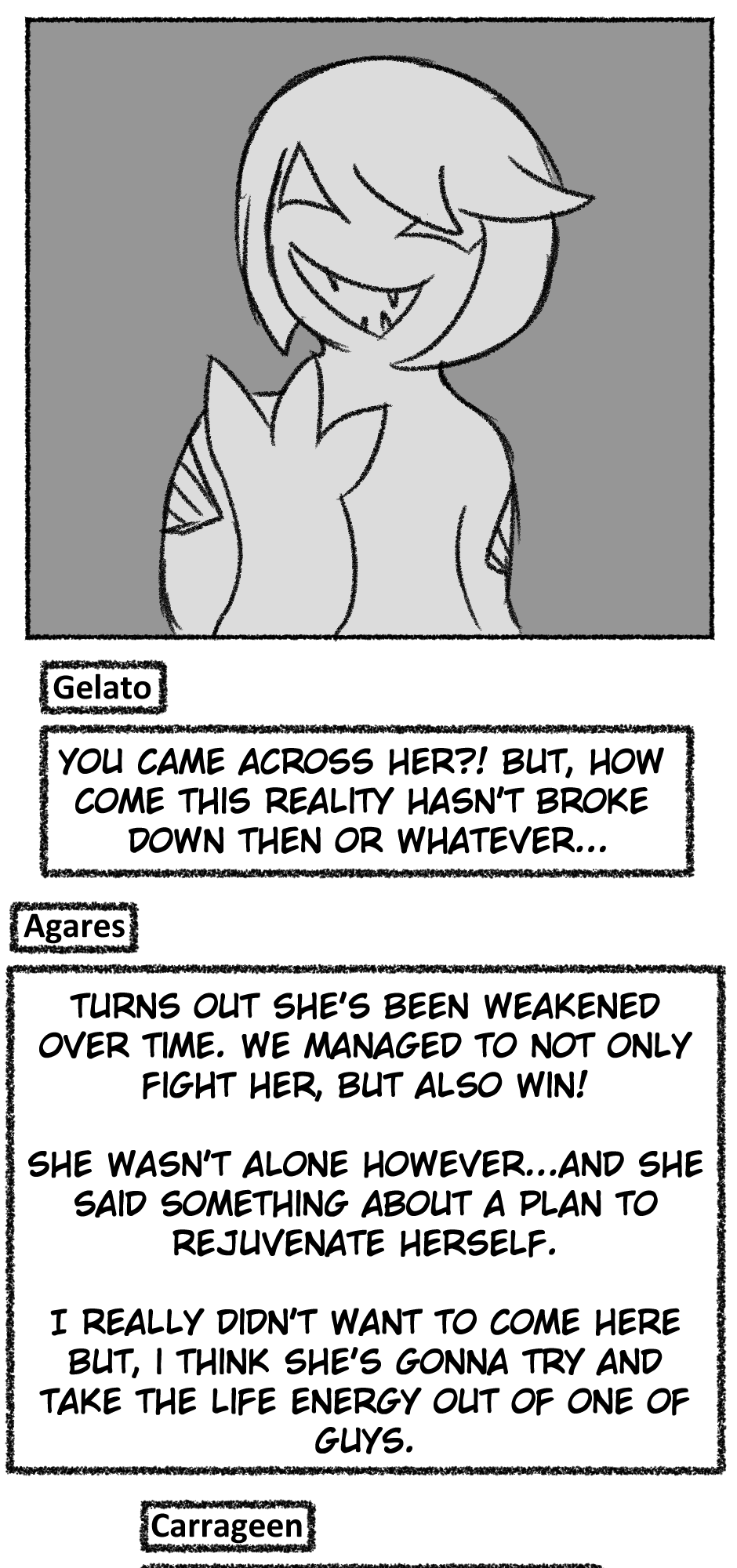 This one is...So messy. I didn't figure out anything about the story, I didn't even have a script. I just drew whatever based off loose thoughts in my head.