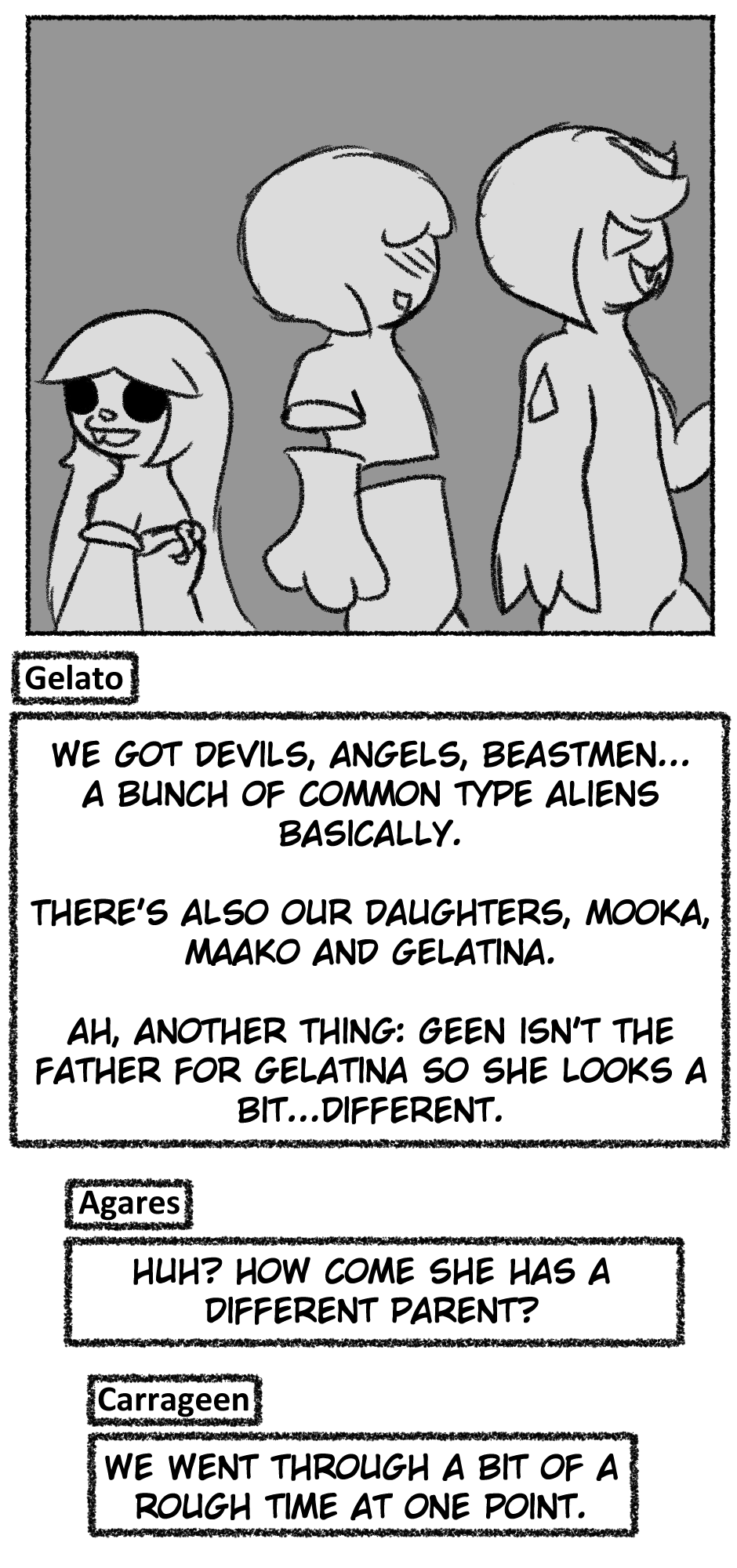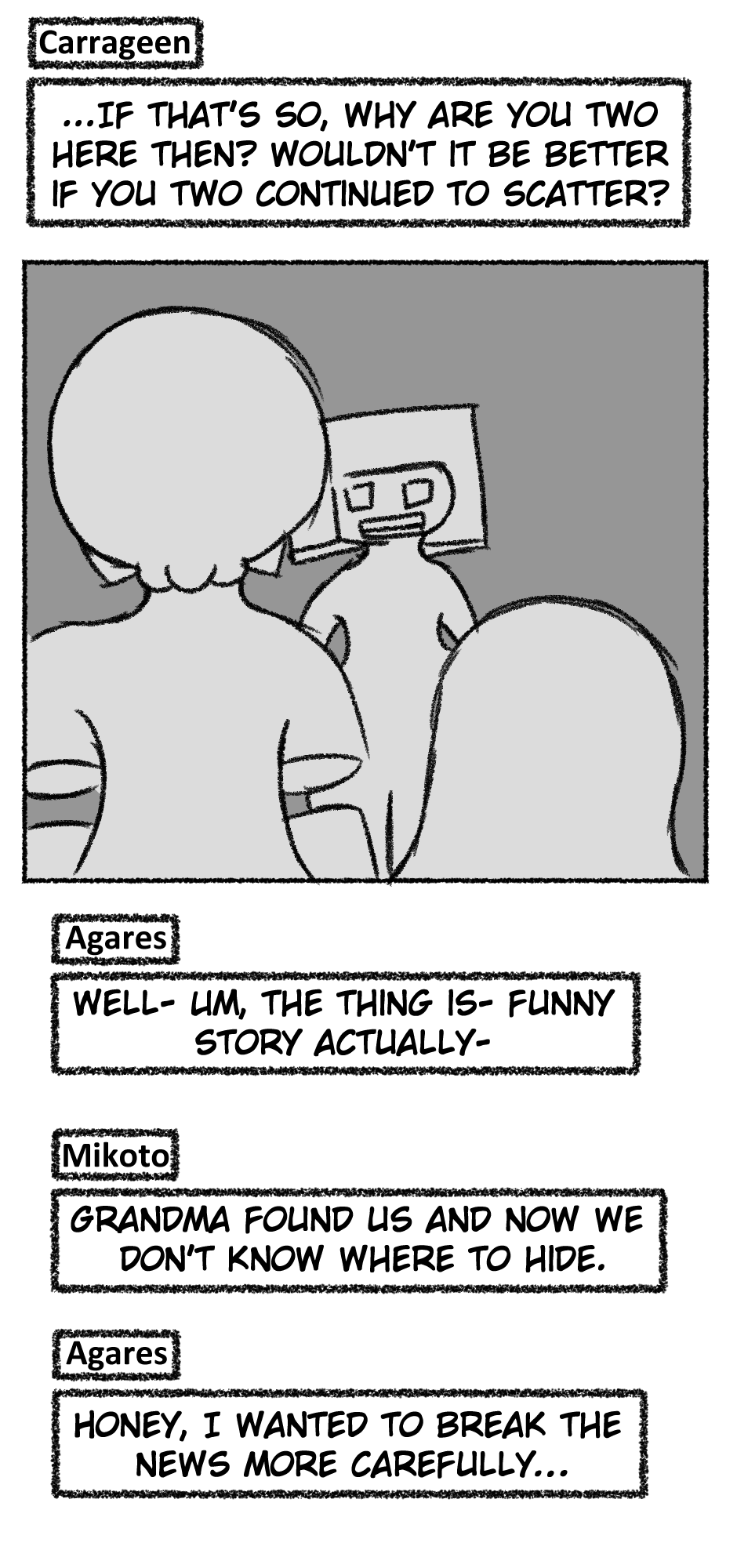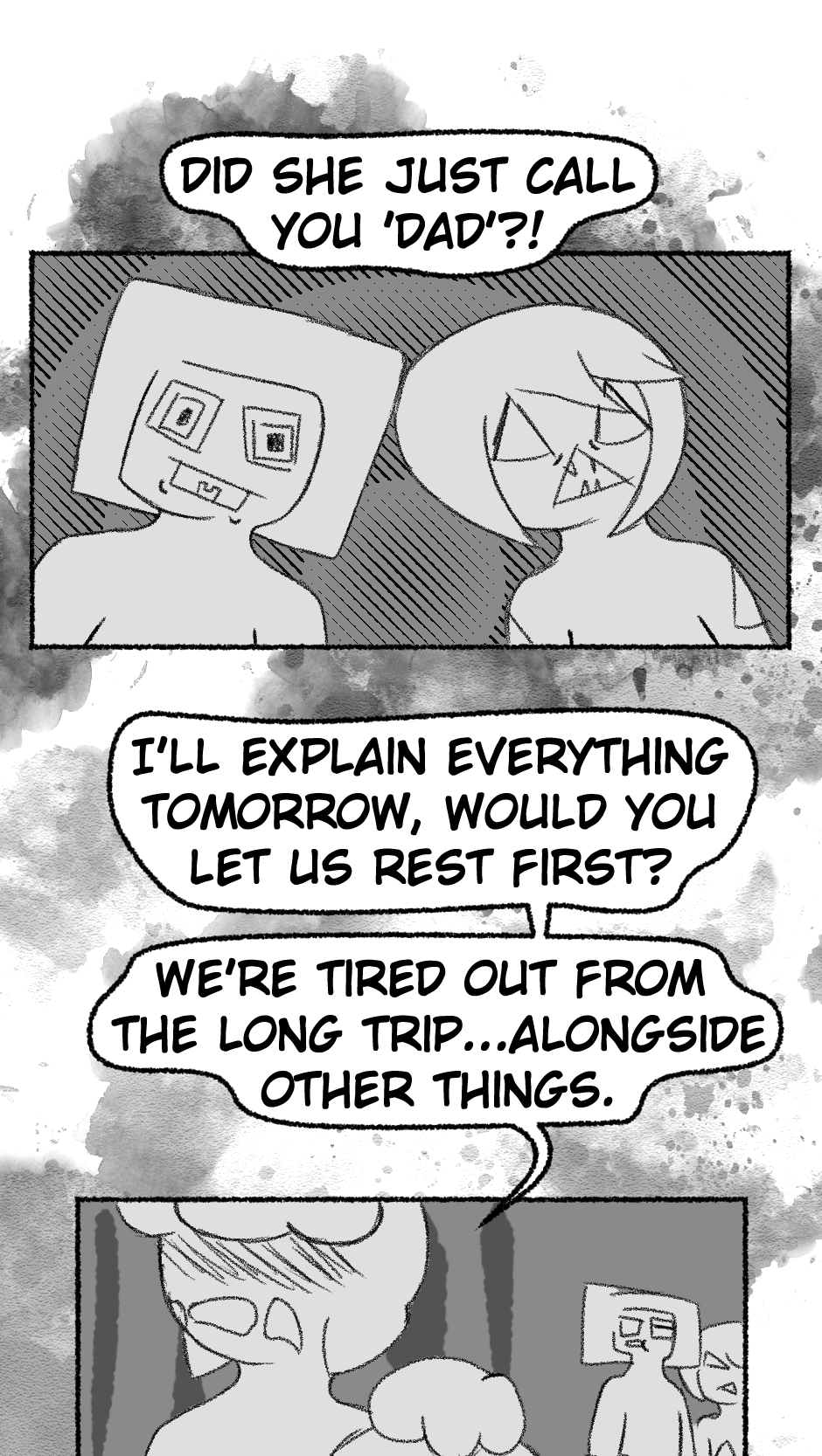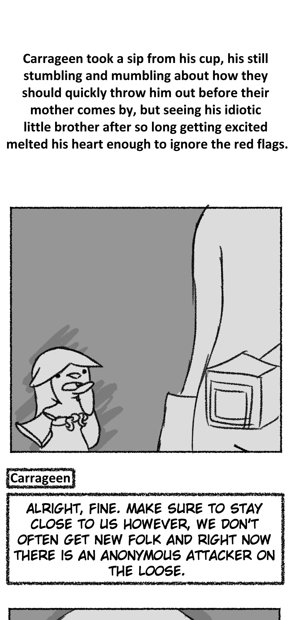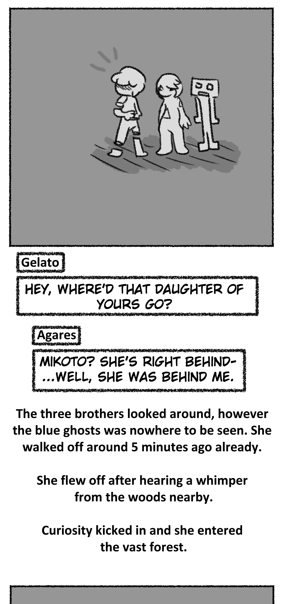 This one is...So messy. I didn't figure out anything about the story, I didn't even have a script. I just drew whatever based off loose thoughts in my head.