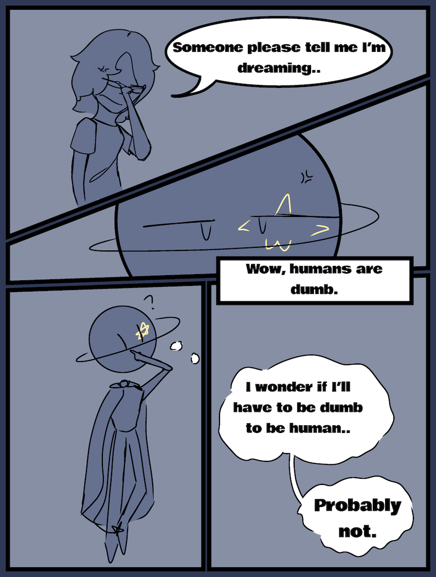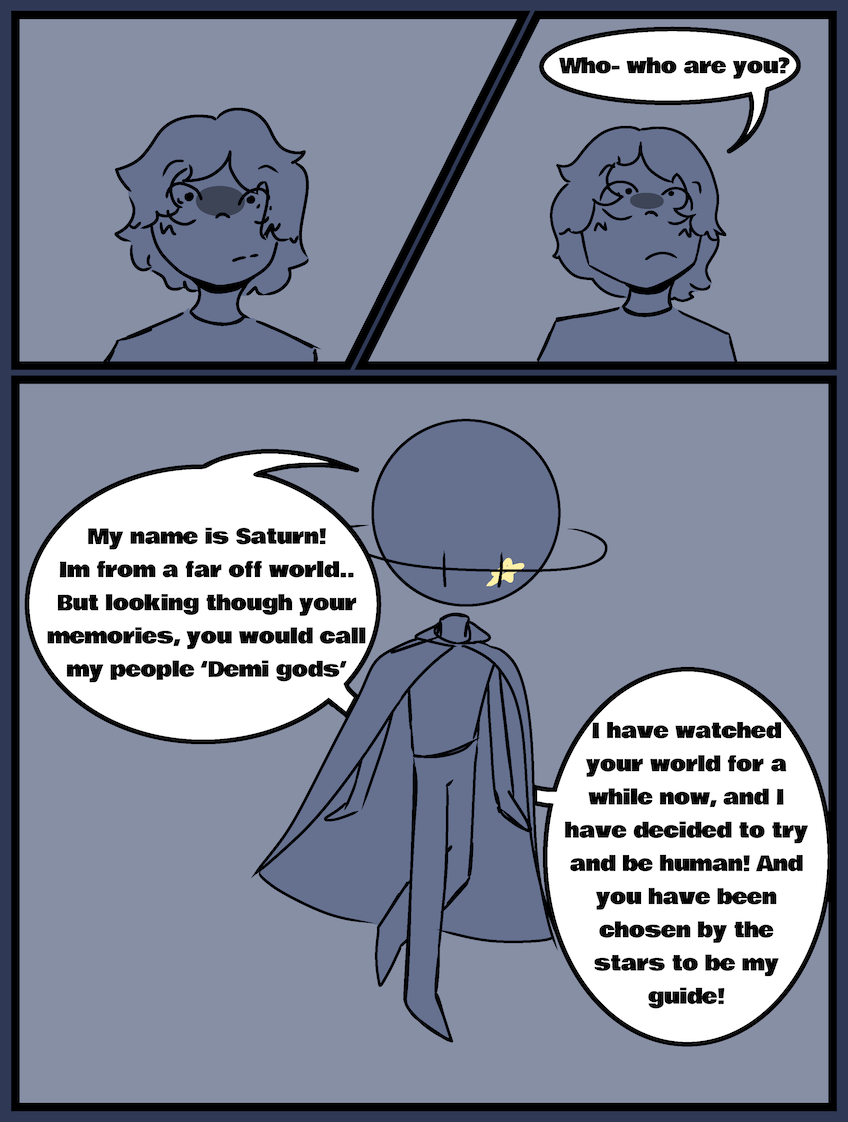 Saturn, a being from another world was teleported into Ghostty's backyard in the middle of the night. Saturn's mission is to learn how to be human, but will Ghostty learn the true reason Saturn is there? Up dates are about every other week (on Saturdays)