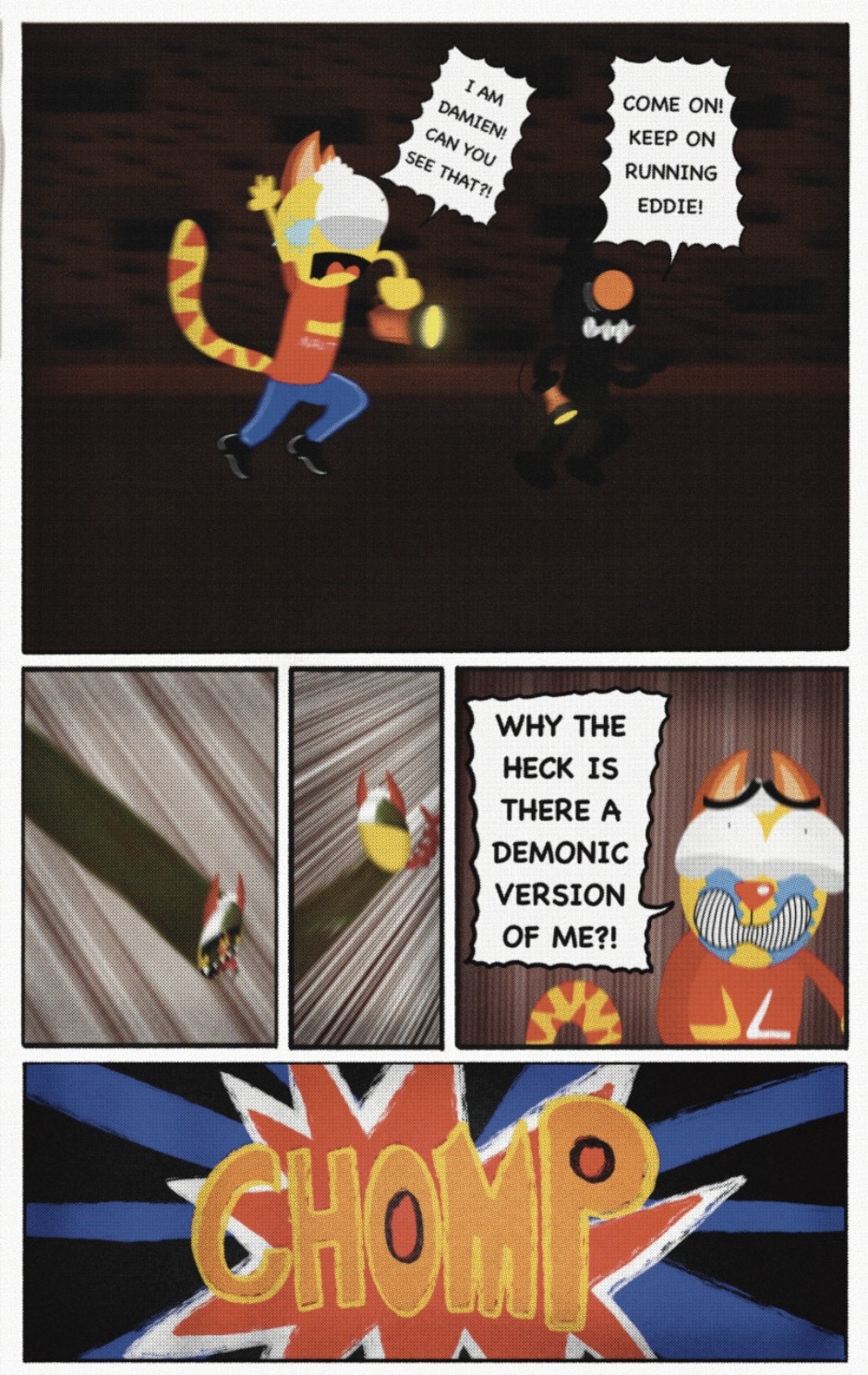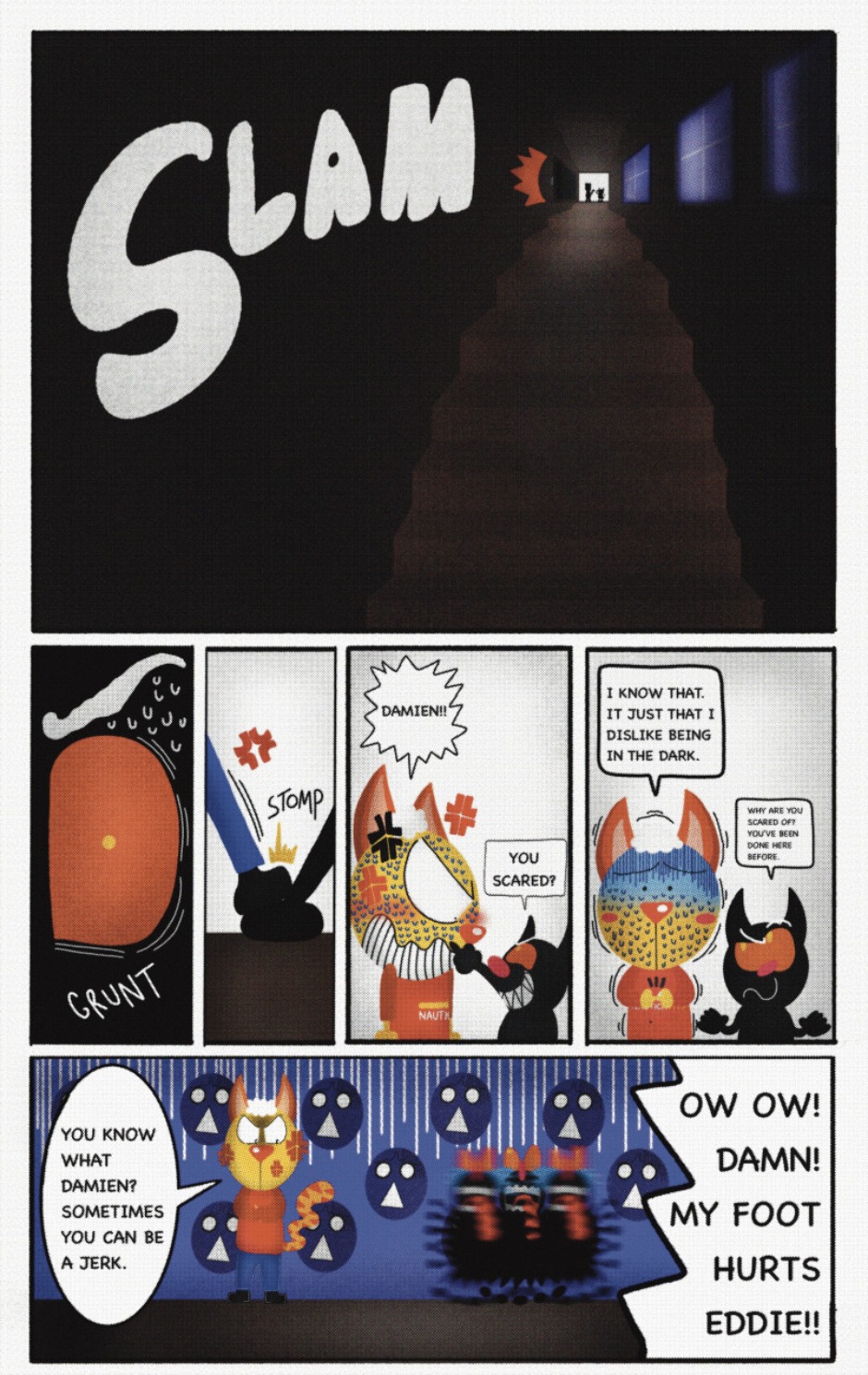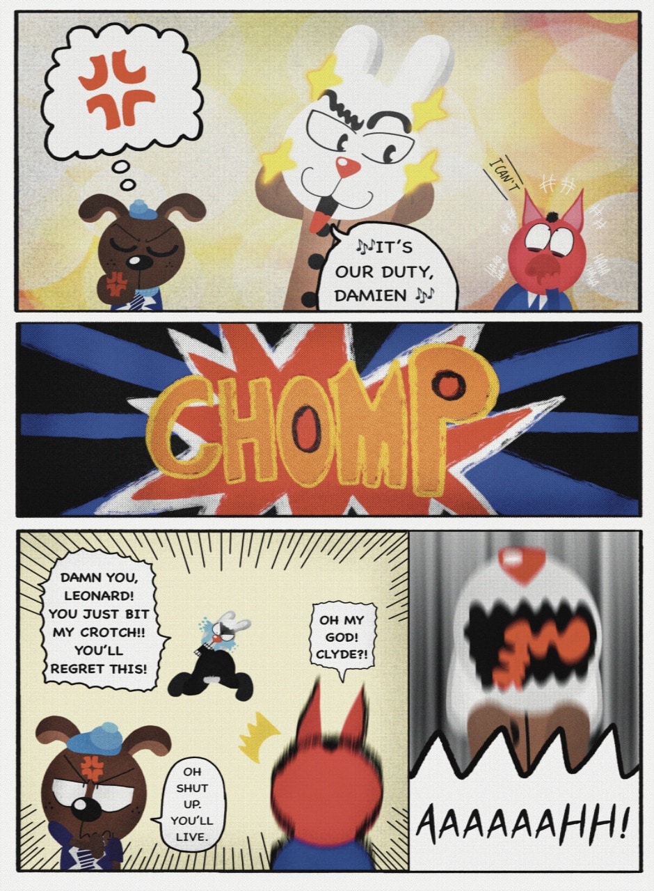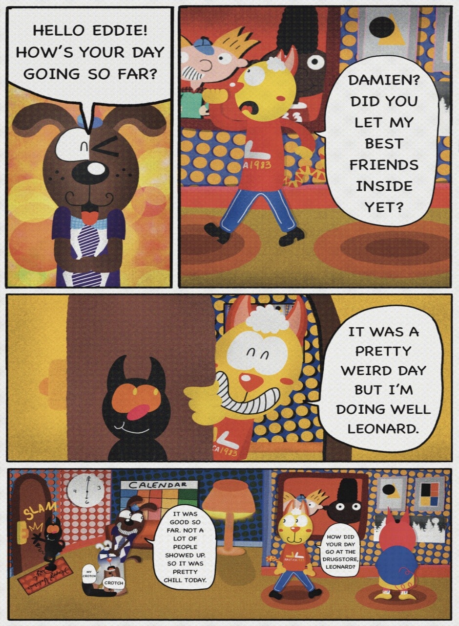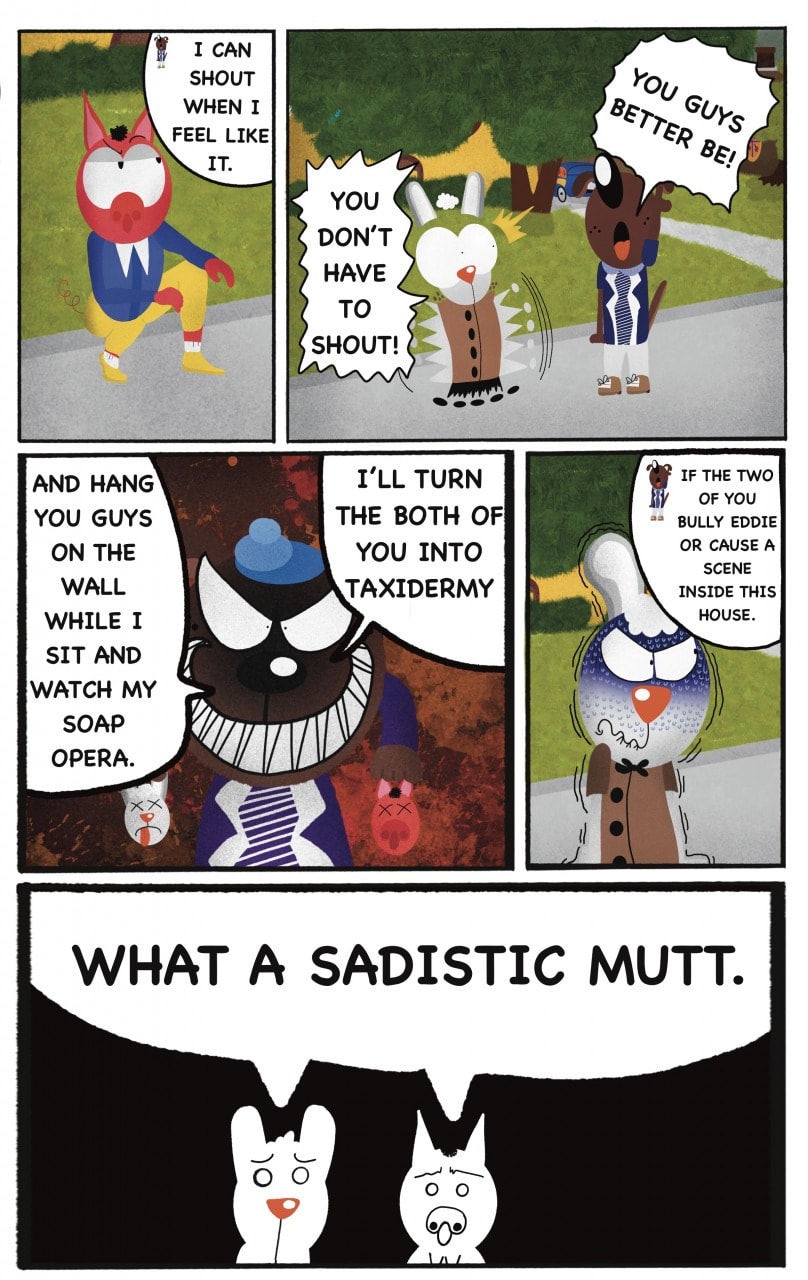 The Cat In Fear, also known as Kyōfu No Neko (恐怖の猫) in Japanese, is a American-Japanese influenced children’s slapstick horror comedy (horredy) manga-inspired comic cartoon aimed at older children (10-12 years of age) that revolves around a group of adults (24-year-old kind-hearted, caring yet cowardly American yellow cat Eddie, 35-year-old grumpy, sarcastic, no-nonsense with a heart of gold Swahili-American brown dog Leonard, 25-year-old brash, arrogant, impulsive French-American rabbit Clyde & 18-year-old studious and intelligent Canadian pig Hunter) who, along with their demon friend from Hell named Damien, reside in the city of High Point, North Carolina where they have to cope with their everyday fears on a regular basis whether it’s mundane or supernatural situations.