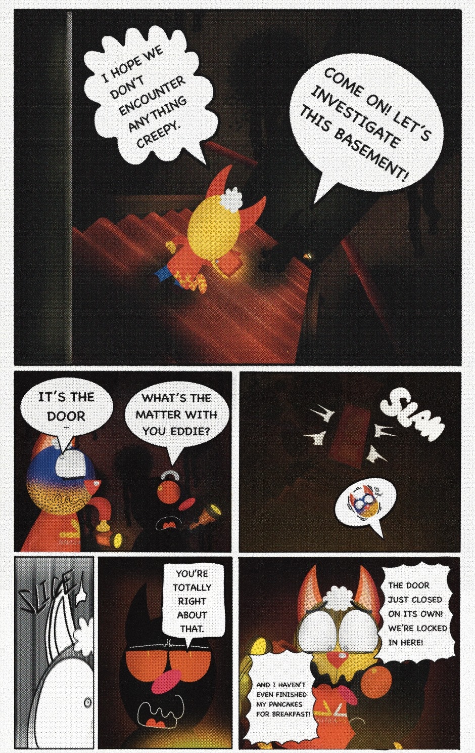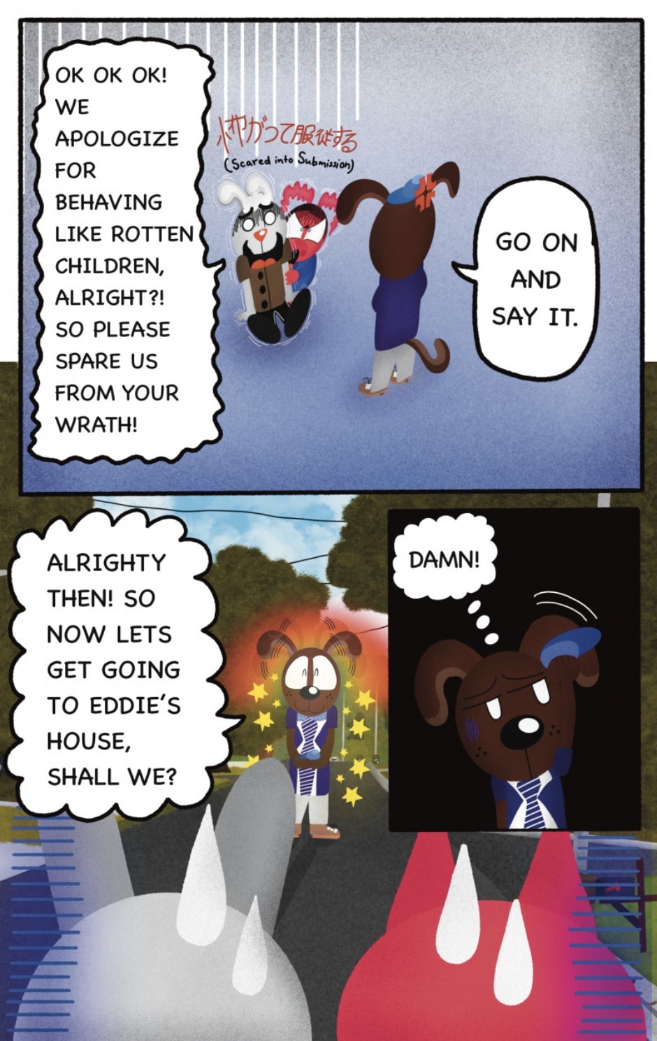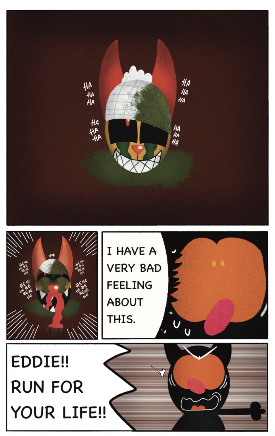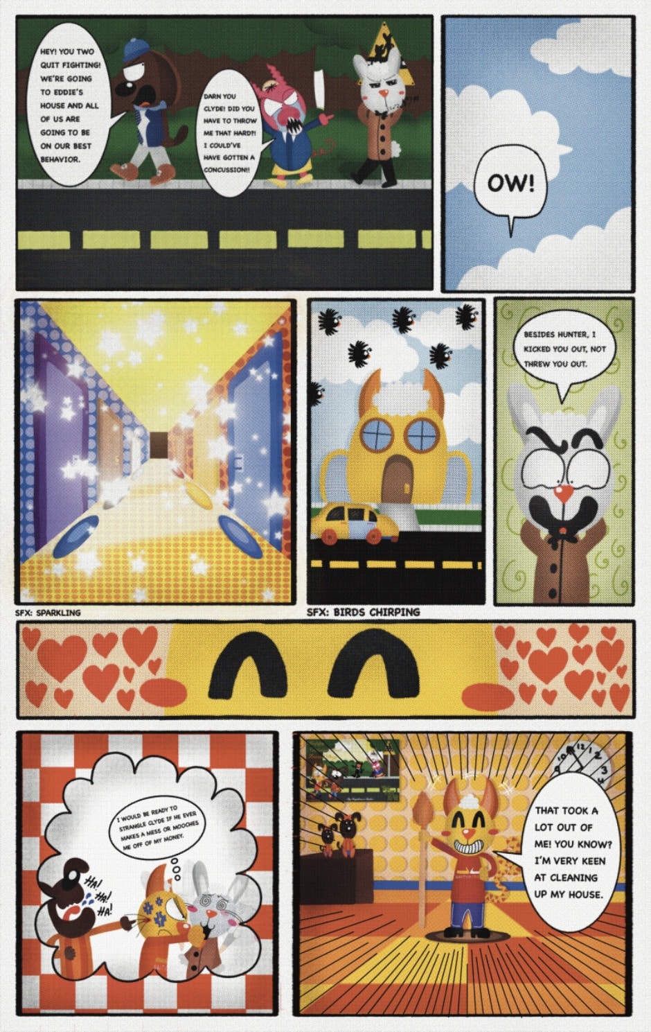 The Cat In Fear, also known as Kyōfu No Neko (恐怖の猫) in Japanese, is a American-Japanese influenced children’s slapstick horror comedy (horredy) manga-inspired comic cartoon aimed at older children (10-12 years of age) that revolves around a group of adults (24-year-old kind-hearted, caring yet cowardly American yellow cat Eddie, 35-year-old grumpy, sarcastic, no-nonsense with a heart of gold Swahili-American brown dog Leonard, 25-year-old brash, arrogant, impulsive French-American rabbit Clyde & 18-year-old studious and intelligent Canadian pig Hunter) who, along with their demon friend from Hell named Damien, reside in the city of High Point, North Carolina where they have to cope with their everyday fears on a regular basis whether it’s mundane or supernatural situations.
