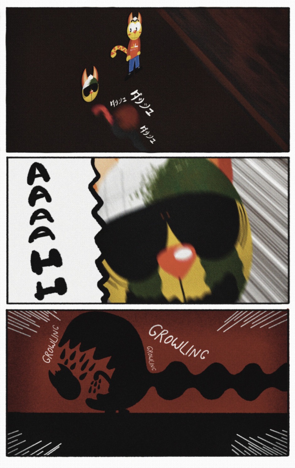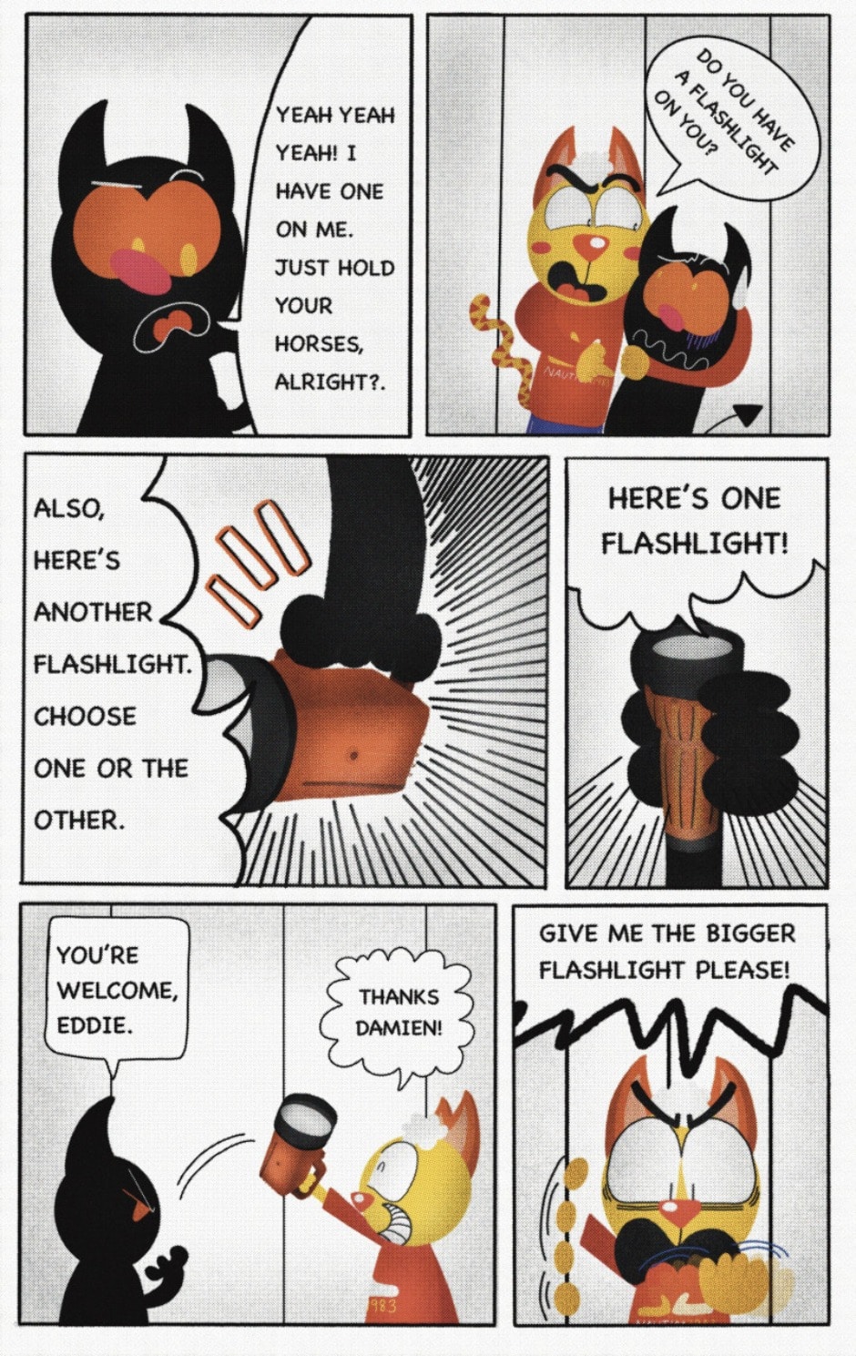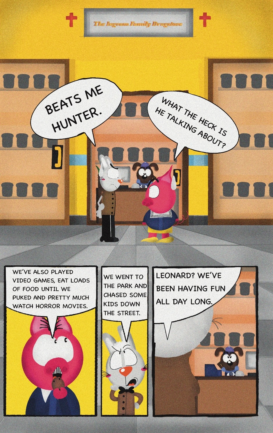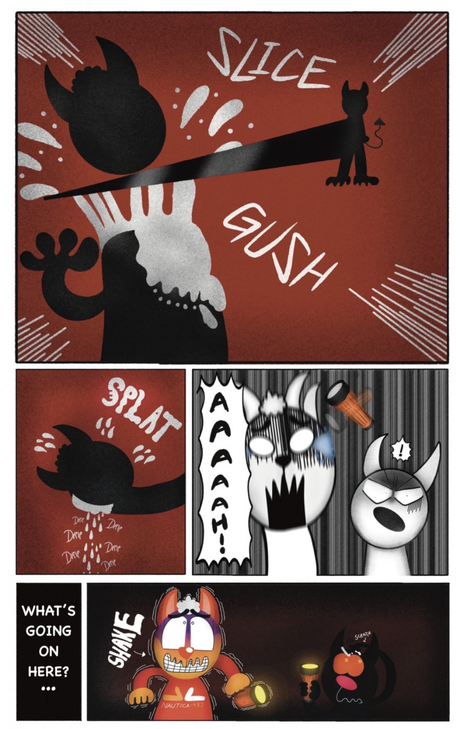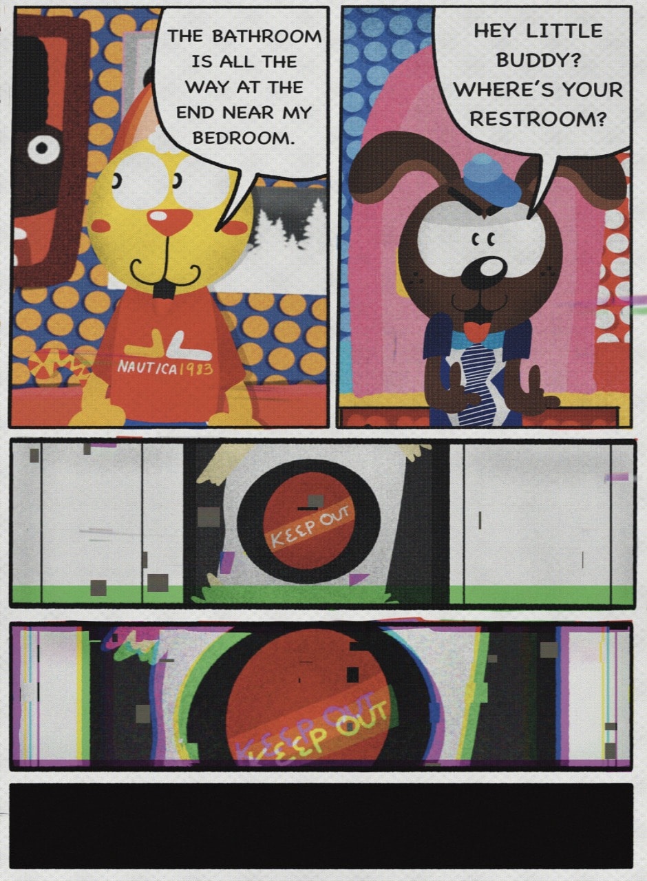 The Cat In Fear, also known as Kyōfu No Neko (恐怖の猫) in Japanese, is a American-Japanese influenced children’s slapstick horror comedy (horredy) manga-inspired comic cartoon aimed at older children (10-12 years of age) that revolves around a group of adults (24-year-old kind-hearted, caring yet cowardly American yellow cat Eddie, 35-year-old grumpy, sarcastic, no-nonsense with a heart of gold Swahili-American brown dog Leonard, 25-year-old brash, arrogant, impulsive French-American rabbit Clyde & 18-year-old studious and intelligent Canadian pig Hunter) who, along with their demon friend from Hell named Damien, reside in the city of High Point, North Carolina where they have to cope with their everyday fears on a regular basis whether it’s mundane or supernatural situations.