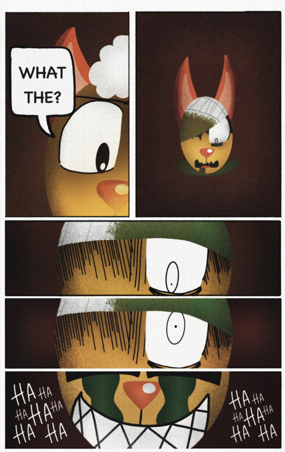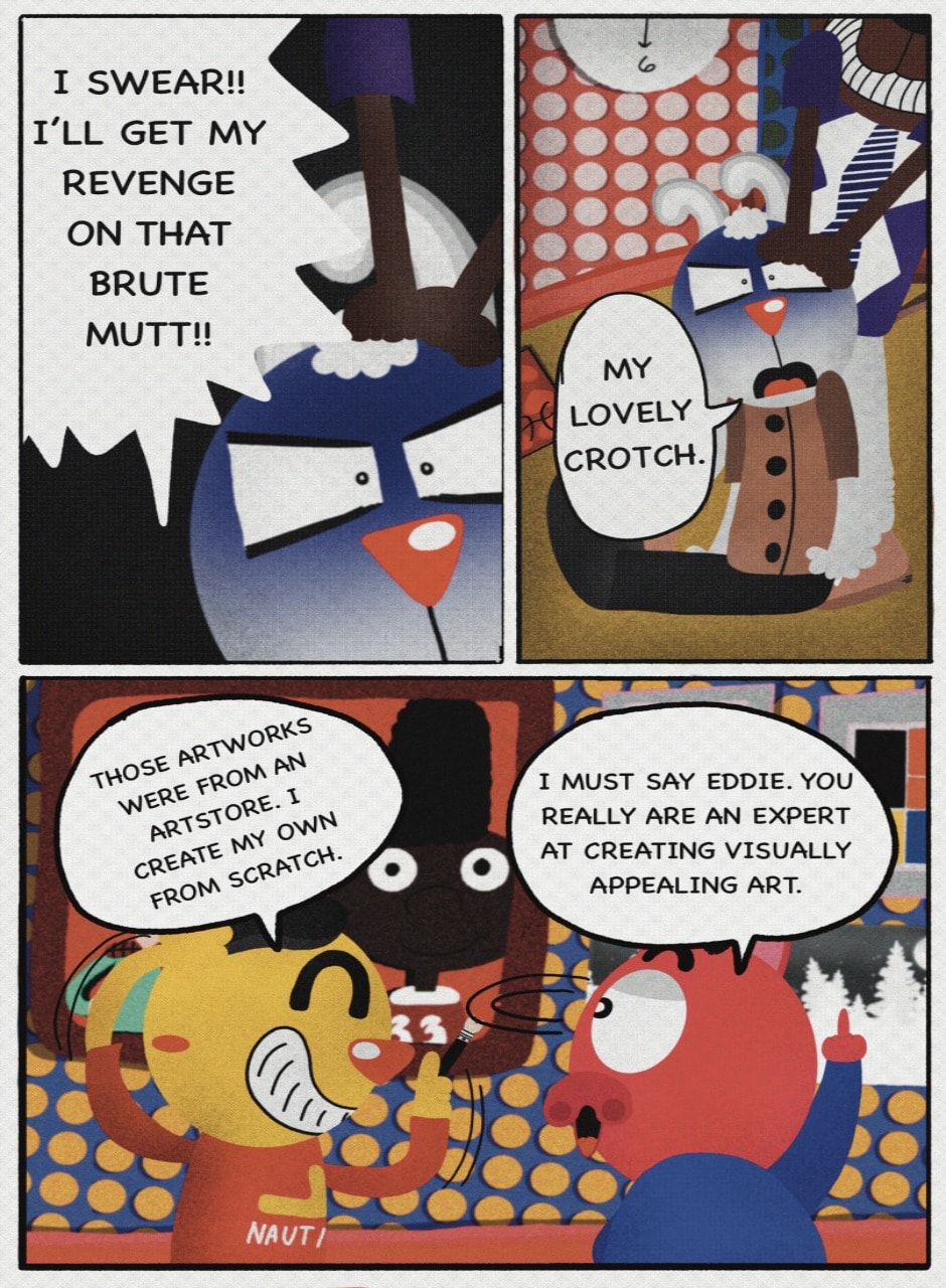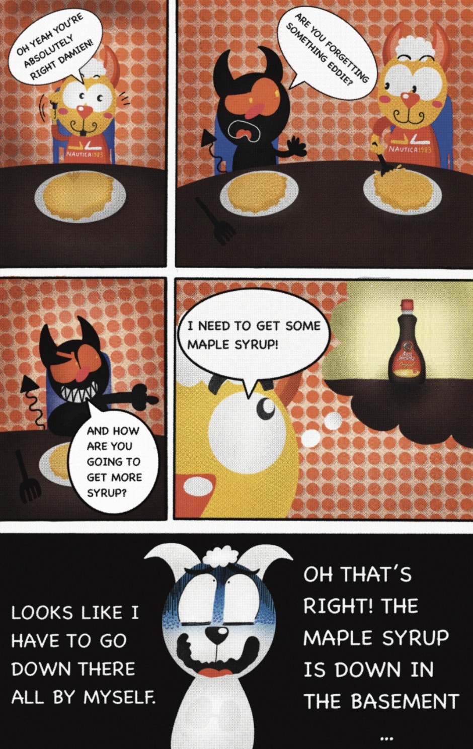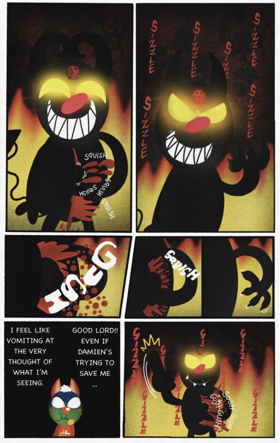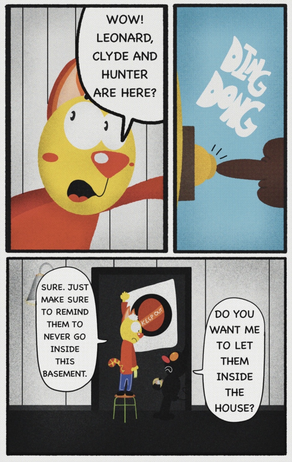 The Cat In Fear, also known as Kyōfu No Neko (恐怖の猫) in Japanese, is a American-Japanese influenced children’s slapstick horror comedy (horredy) manga-inspired comic cartoon aimed at older children (10-12 years of age) that revolves around a group of adults (24-year-old kind-hearted, caring yet cowardly American yellow cat Eddie, 35-year-old grumpy, sarcastic, no-nonsense with a heart of gold Swahili-American brown dog Leonard, 25-year-old brash, arrogant, impulsive French-American rabbit Clyde & 18-year-old studious and intelligent Canadian pig Hunter) who, along with their demon friend from Hell named Damien, reside in the city of High Point, North Carolina where they have to cope with their everyday fears on a regular basis whether it’s mundane or supernatural situations.
