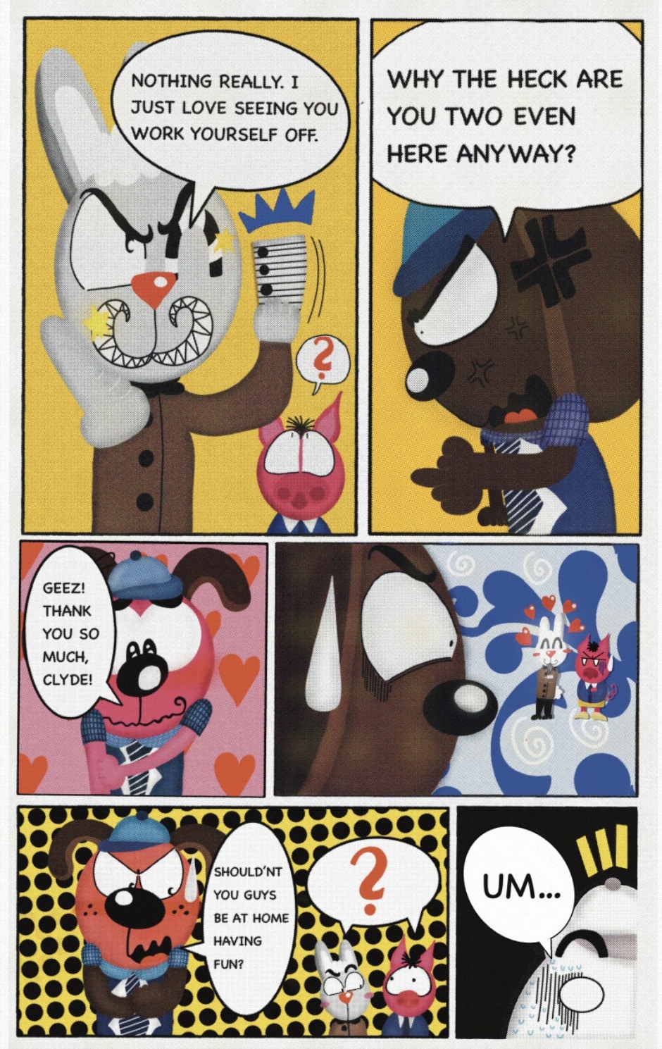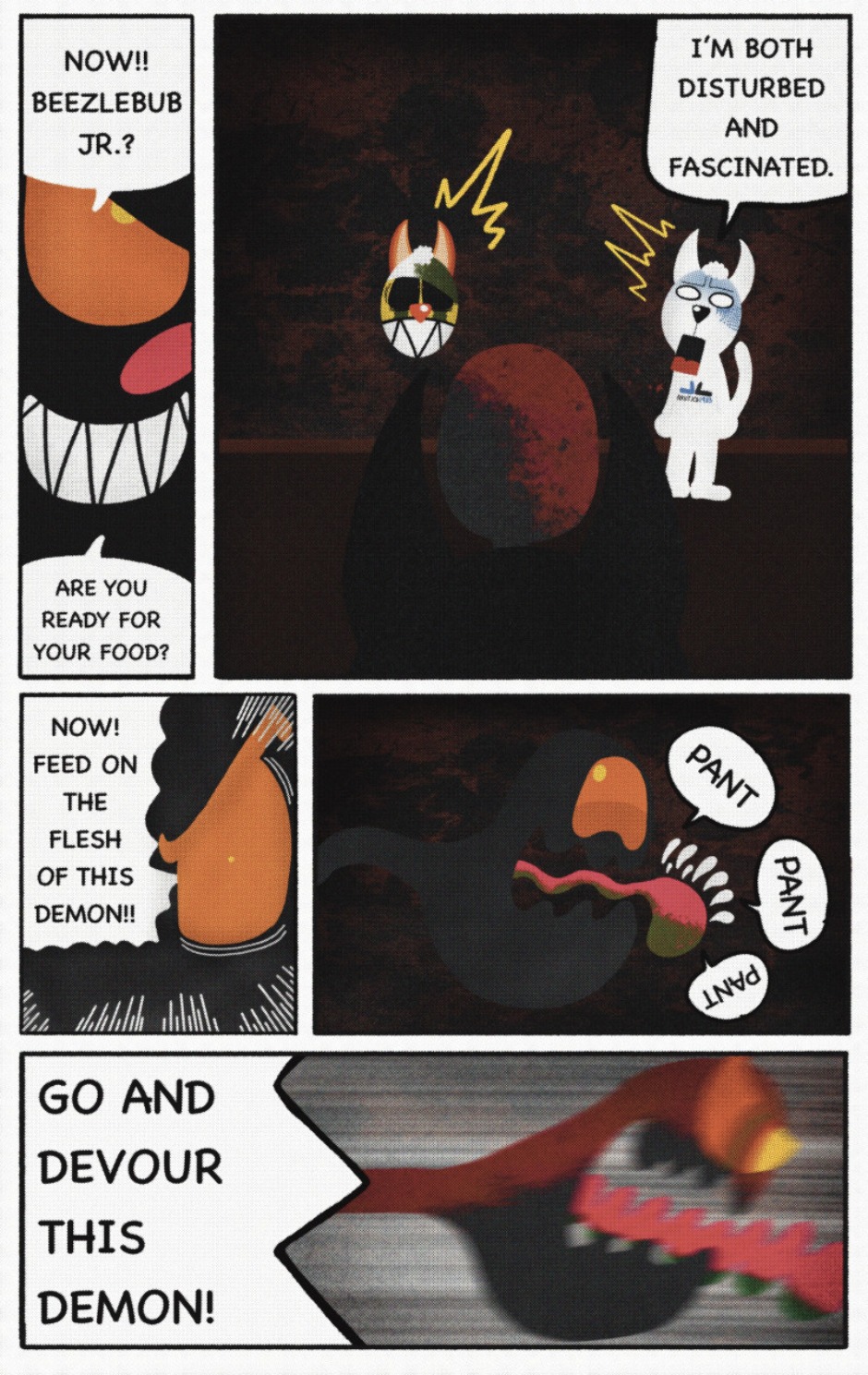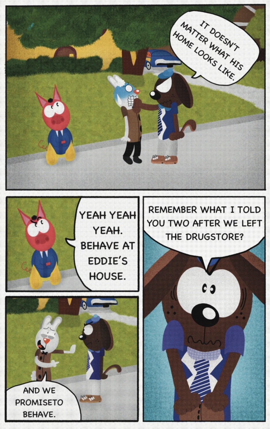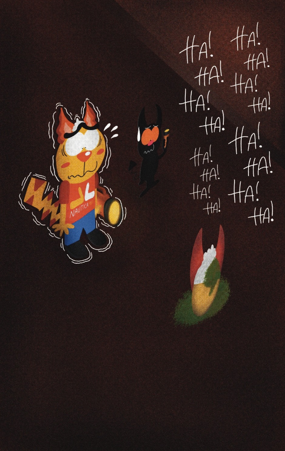 The Cat In Fear, also known as Kyōfu No Neko (恐怖の猫) in Japanese, is a American-Japanese influenced children’s slapstick horror comedy (horredy) manga-inspired comic cartoon aimed at older children (10-12 years of age) that revolves around a group of adults (24-year-old kind-hearted, caring yet cowardly American yellow cat Eddie, 35-year-old grumpy, sarcastic, no-nonsense with a heart of gold Swahili-American brown dog Leonard, 25-year-old brash, arrogant, impulsive French-American rabbit Clyde & 18-year-old studious and intelligent Canadian pig Hunter) who, along with their demon friend from Hell named Damien, reside in the city of High Point, North Carolina where they have to cope with their everyday fears on a regular basis whether it’s mundane or supernatural situations.