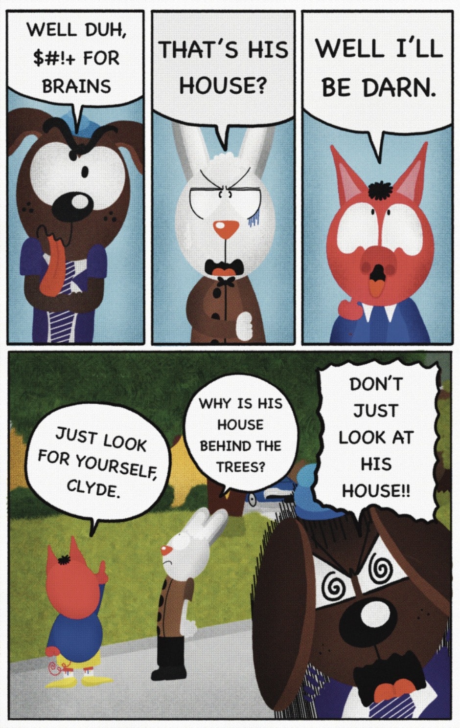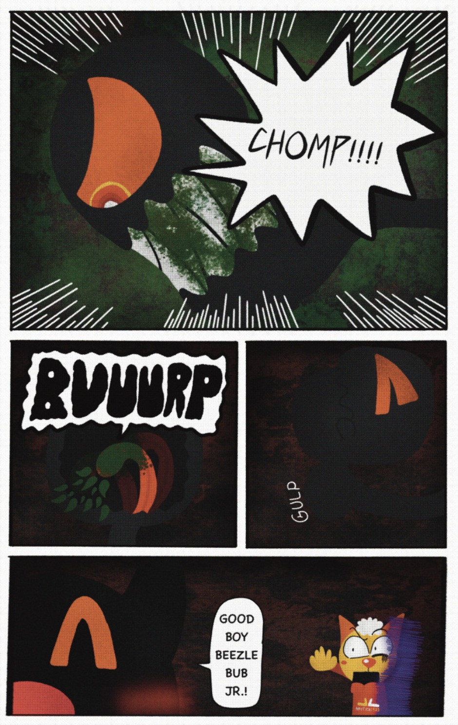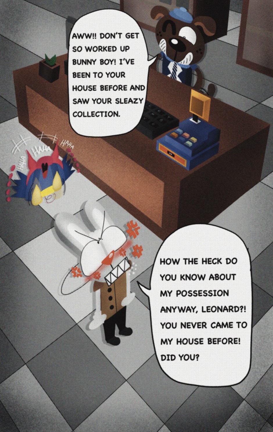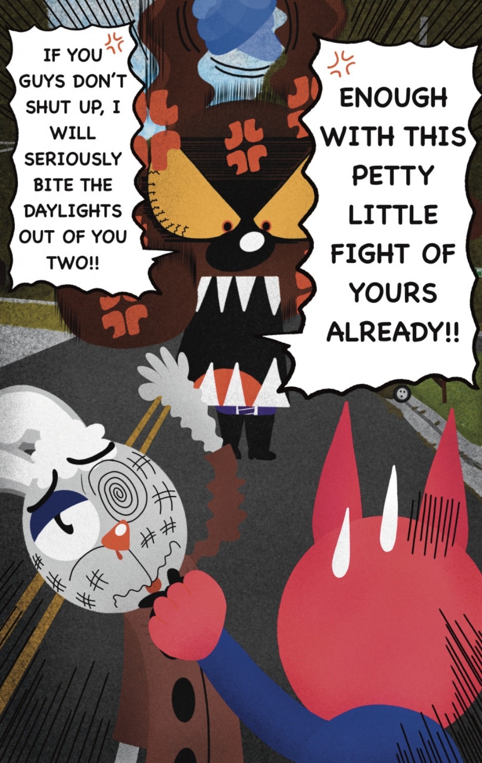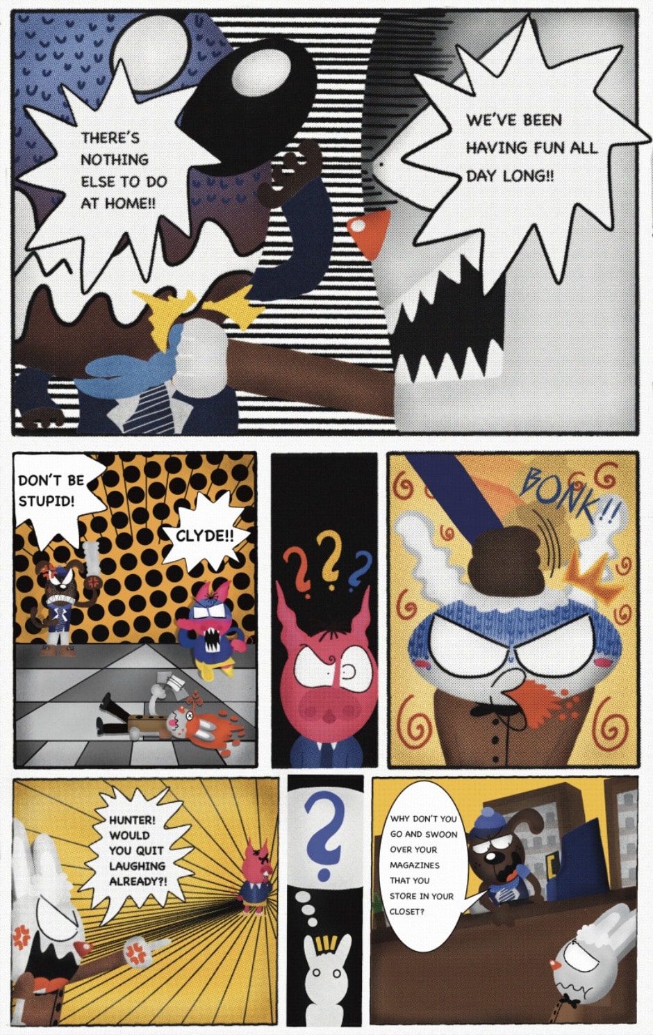 The Cat In Fear, also known as Kyōfu No Neko (恐怖の猫) in Japanese, is a American-Japanese influenced children’s slapstick horror comedy (horredy) manga-inspired comic cartoon aimed at older children (10-12 years of age) that revolves around a group of adults (24-year-old kind-hearted, caring yet cowardly American yellow cat Eddie, 35-year-old grumpy, sarcastic, no-nonsense with a heart of gold Swahili-American brown dog Leonard, 25-year-old brash, arrogant, impulsive French-American rabbit Clyde & 18-year-old studious and intelligent Canadian pig Hunter) who, along with their demon friend from Hell named Damien, reside in the city of High Point, North Carolina where they have to cope with their everyday fears on a regular basis whether it’s mundane or supernatural situations.