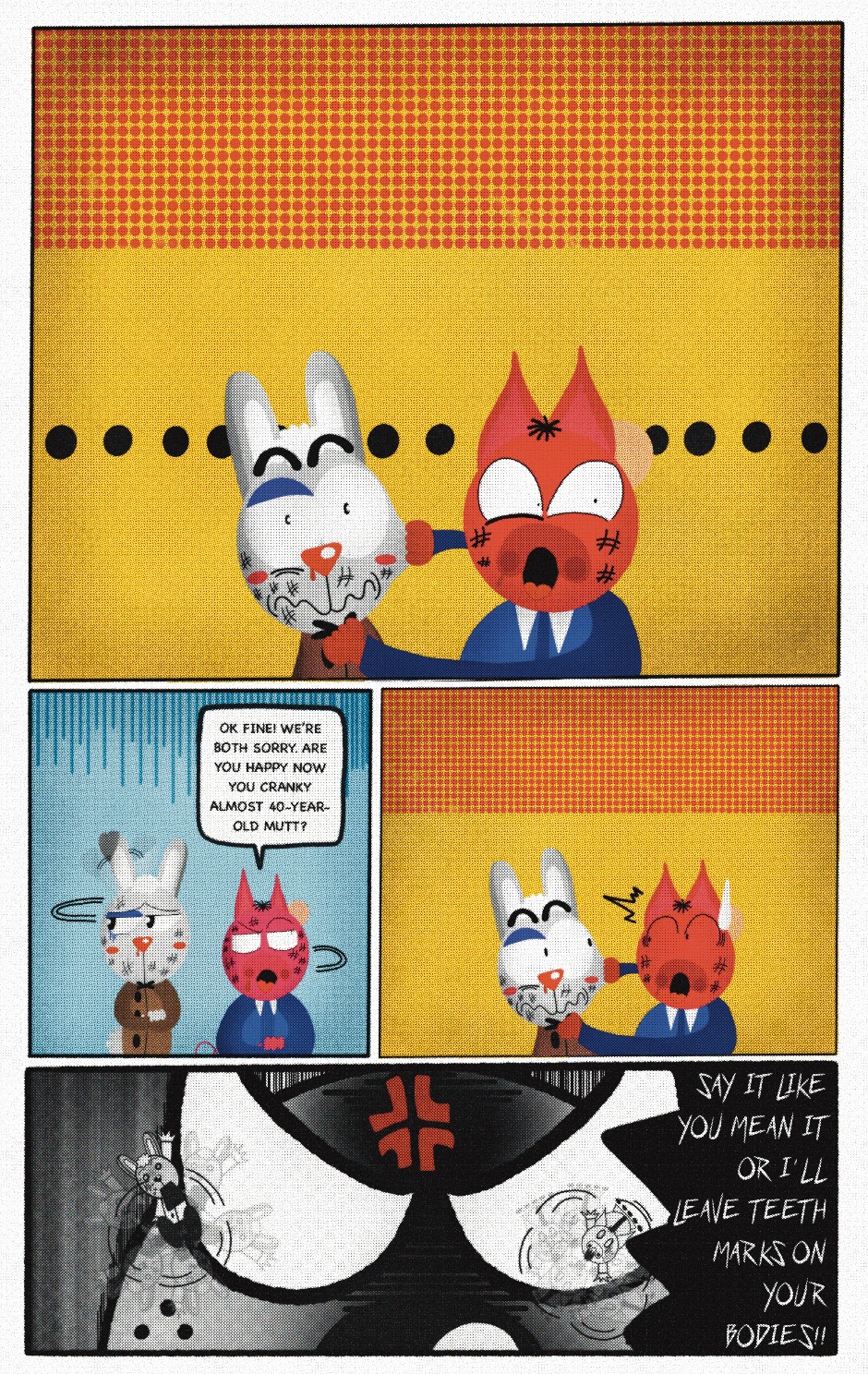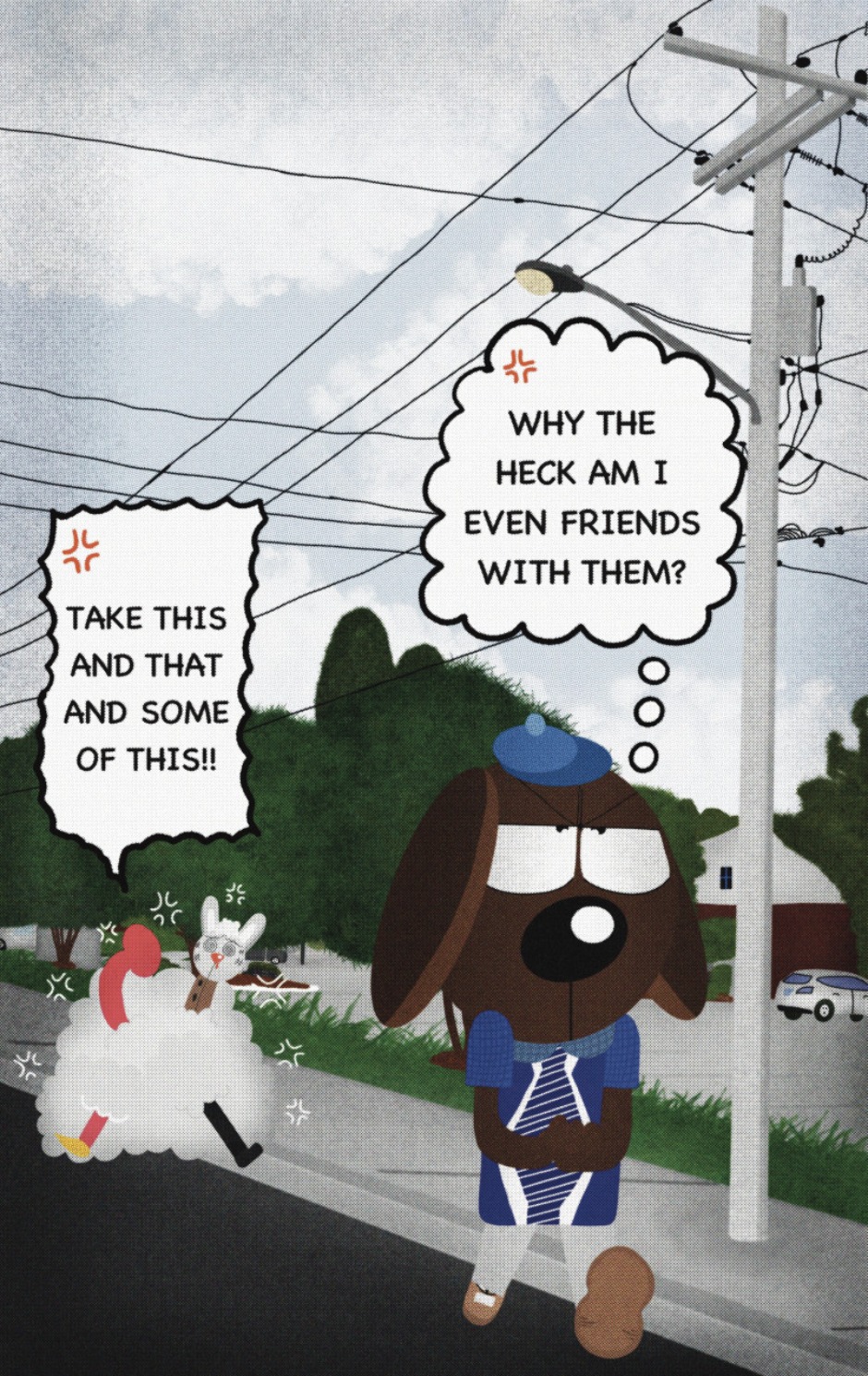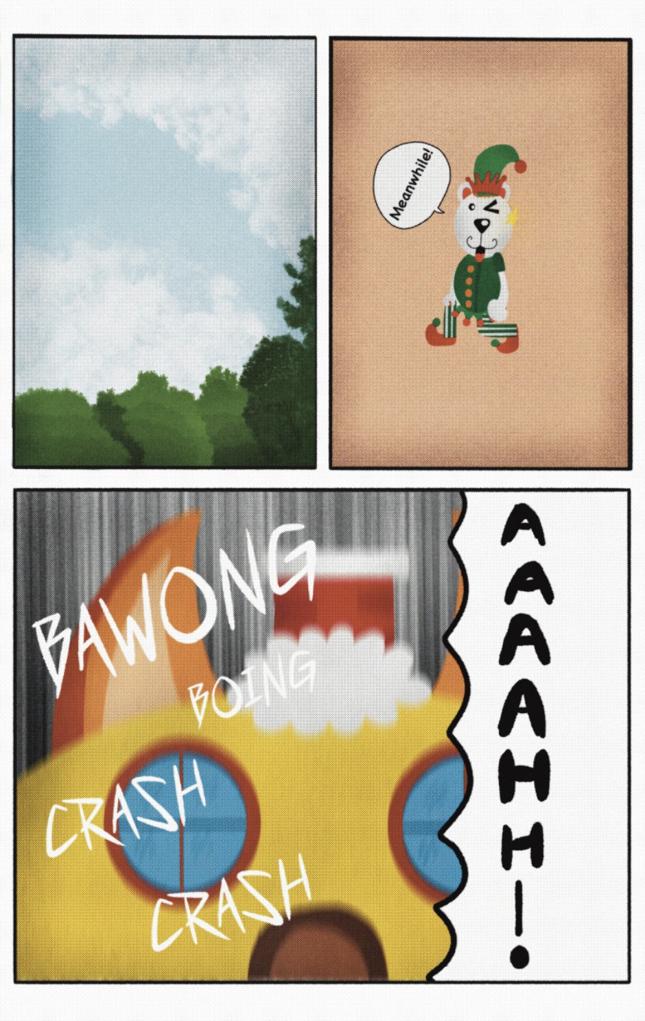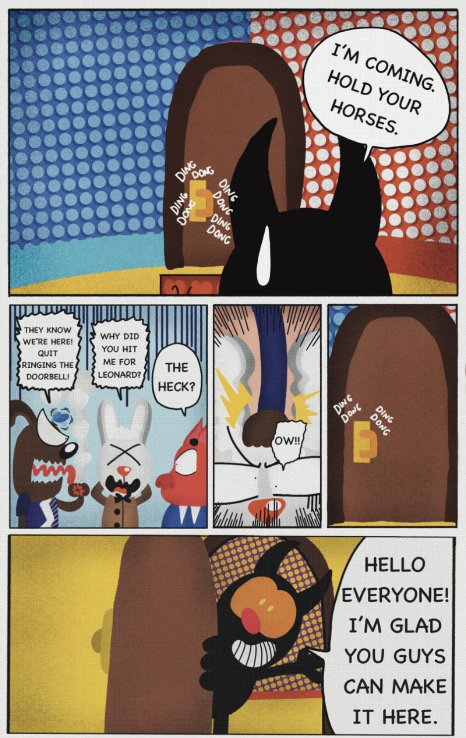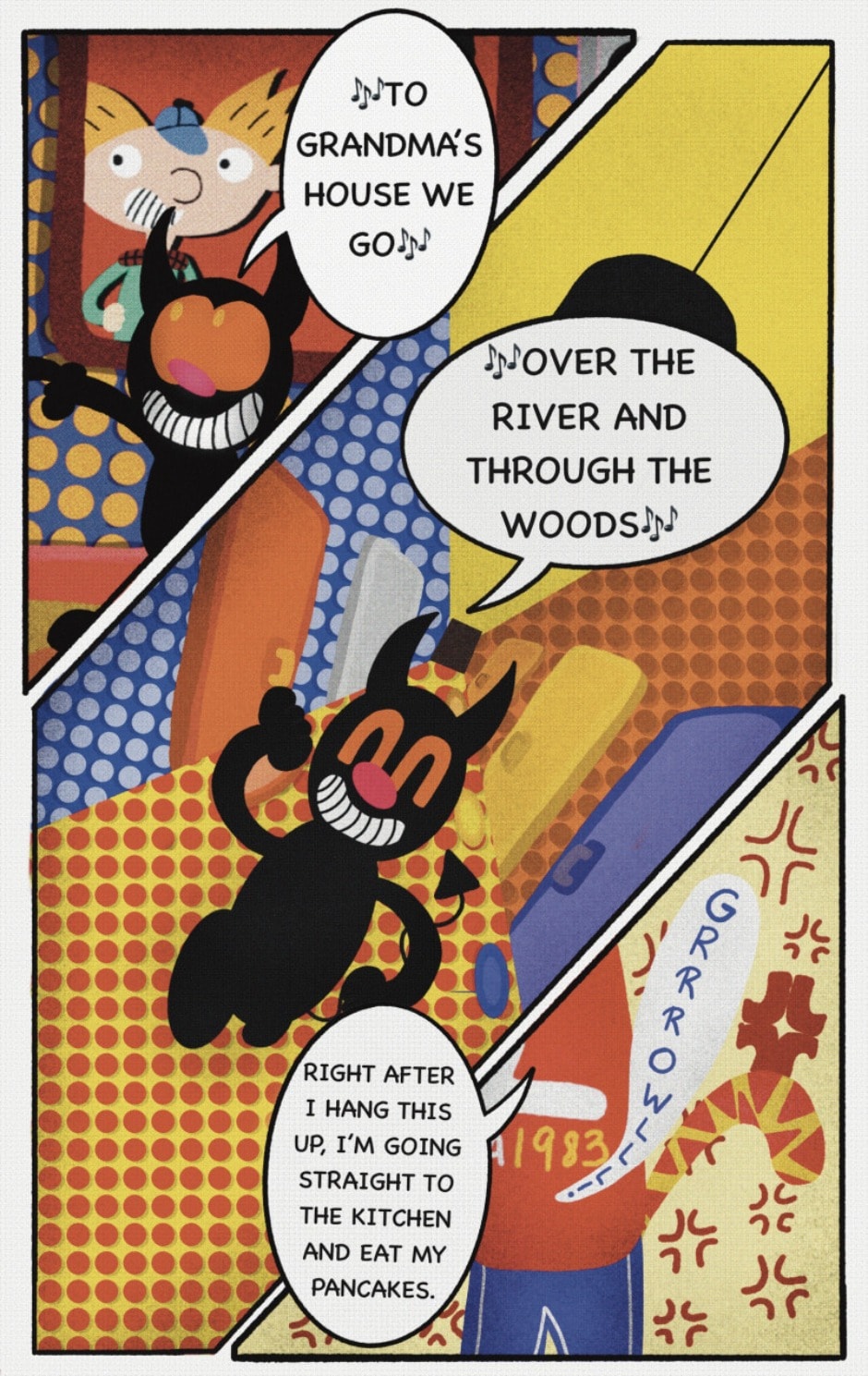 The Cat In Fear, also known as Kyōfu No Neko (恐怖の猫) in Japanese, is a American-Japanese influenced children’s slapstick horror comedy (horredy) manga-inspired comic cartoon aimed at older children (10-12 years of age) that revolves around a group of adults (24-year-old kind-hearted, caring yet cowardly American yellow cat Eddie, 35-year-old grumpy, sarcastic, no-nonsense with a heart of gold Swahili-American brown dog Leonard, 25-year-old brash, arrogant, impulsive French-American rabbit Clyde & 18-year-old studious and intelligent Canadian pig Hunter) who, along with their demon friend from Hell named Damien, reside in the city of High Point, North Carolina where they have to cope with their everyday fears on a regular basis whether it’s mundane or supernatural situations.