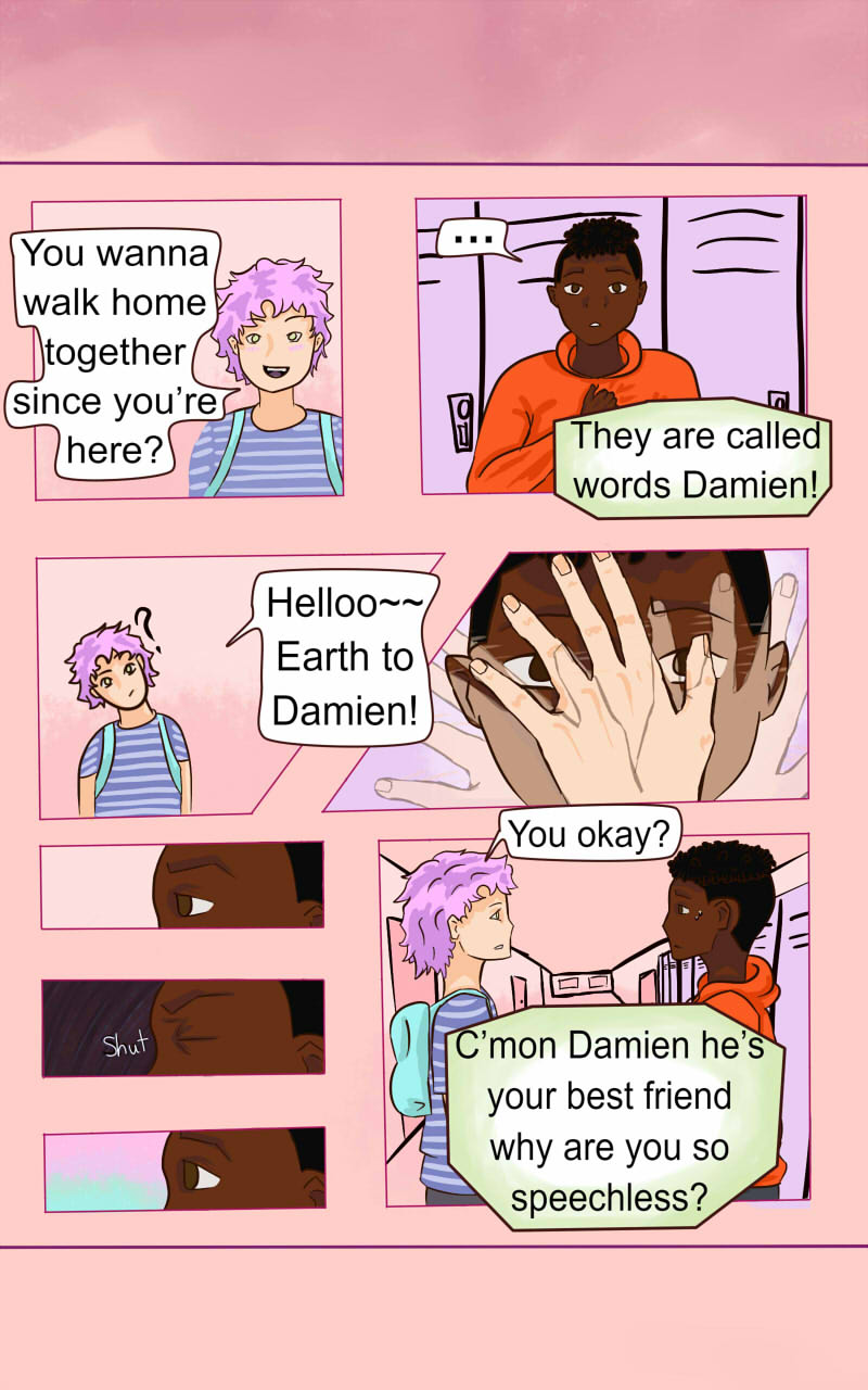 Gay Panic ~~ ACTIVATE!!! Well if you want to be technical Damien's gay panic is almost always activated so really it just intensifies. I also apologize for the random hiatus without notice a lot of life stuff happened all at once so it was hard to work on the story, but I am back and you should expect more regular-ish updates.