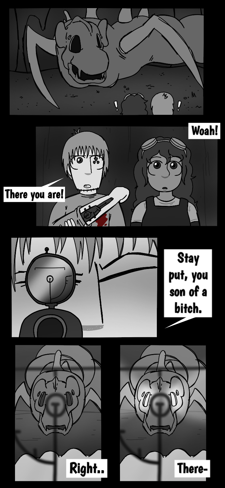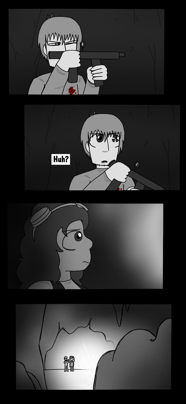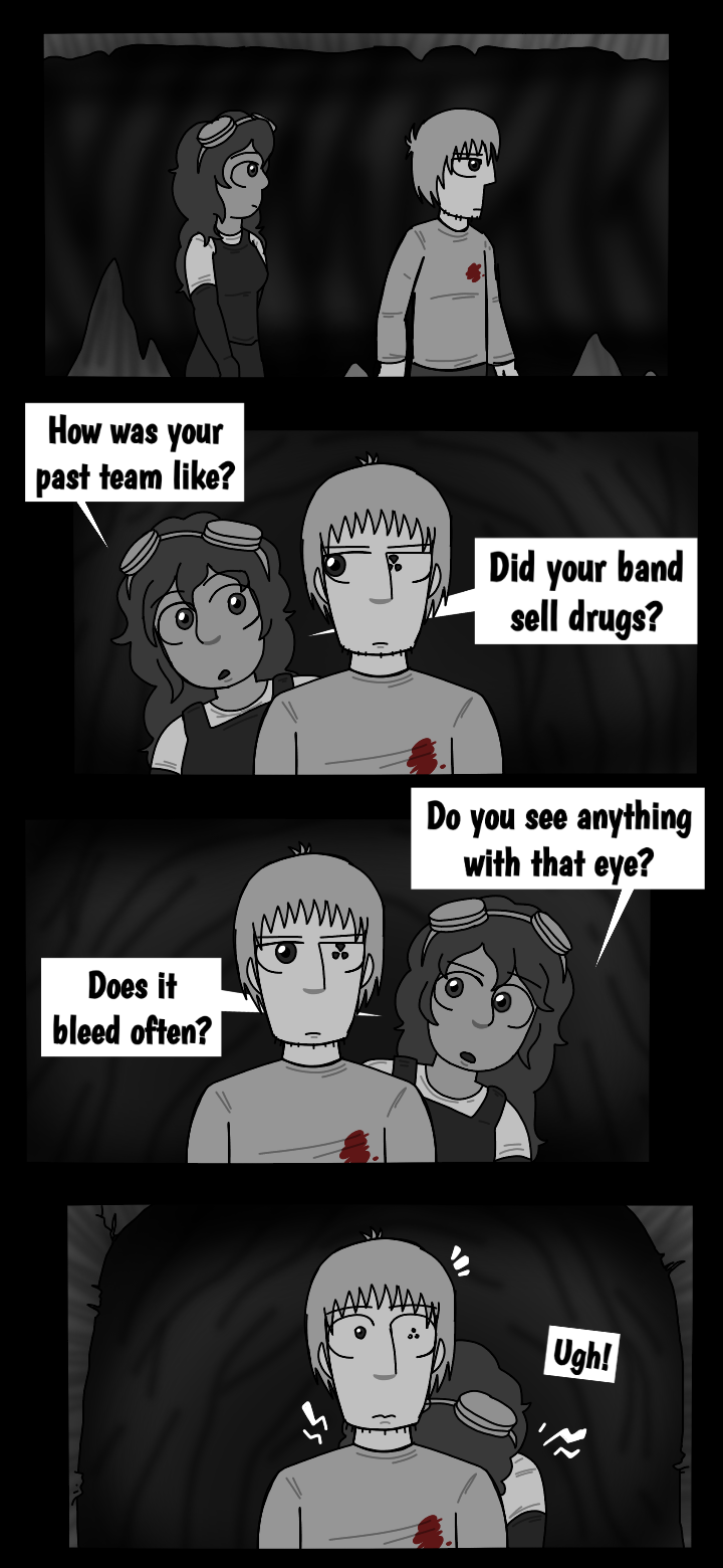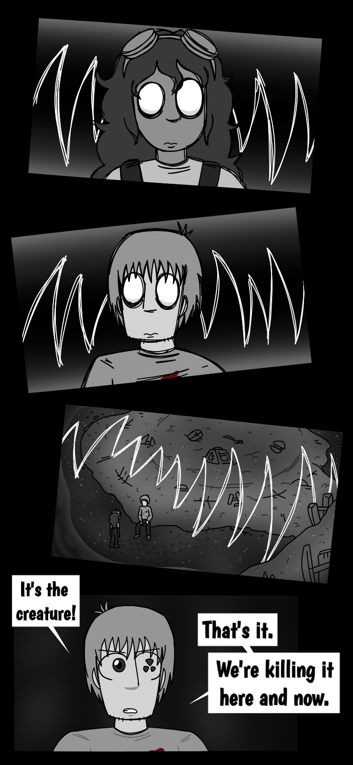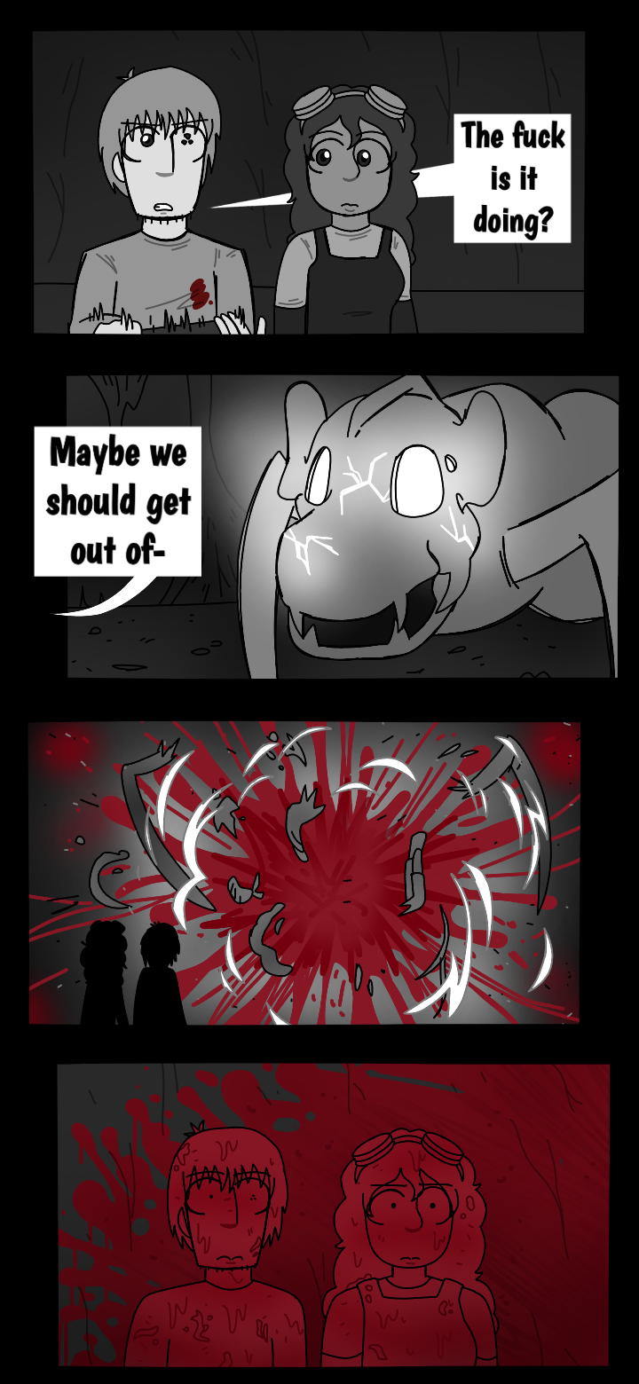 While walking through the cave, Orone reveals to Mark that the fact of him being a wanted criminal is not as unpopular, as he thought. She later starts getting curious about Mark's backstory, asking him questions to which he doesn't seem pretty interested to give a reply to. In the end, they find the monster, it seems that it has swallowed the ship fragment. Mark is ready to shoot the creature down, right before it exploding in hundreds of pieces, resulting in a blood bath for them both. The explosion was caused the creature's digestive acids dissolving the protective material surrounding the piece swallowed.