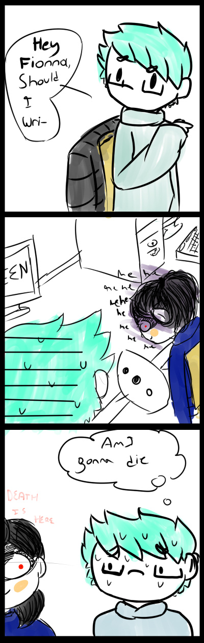 Final exams are in like 2 weeks. I only have two exams thanks to Comm. Tech and Civics/Careers not having exams. Some friends, however, I don't think are as lucky. (FionnaEatsCake [ http://tapastic.com/eatingyourcake ] is in this, btw. We're in TGJ2O together and im p sure we're gonna cry for the next week over summatives OTL)