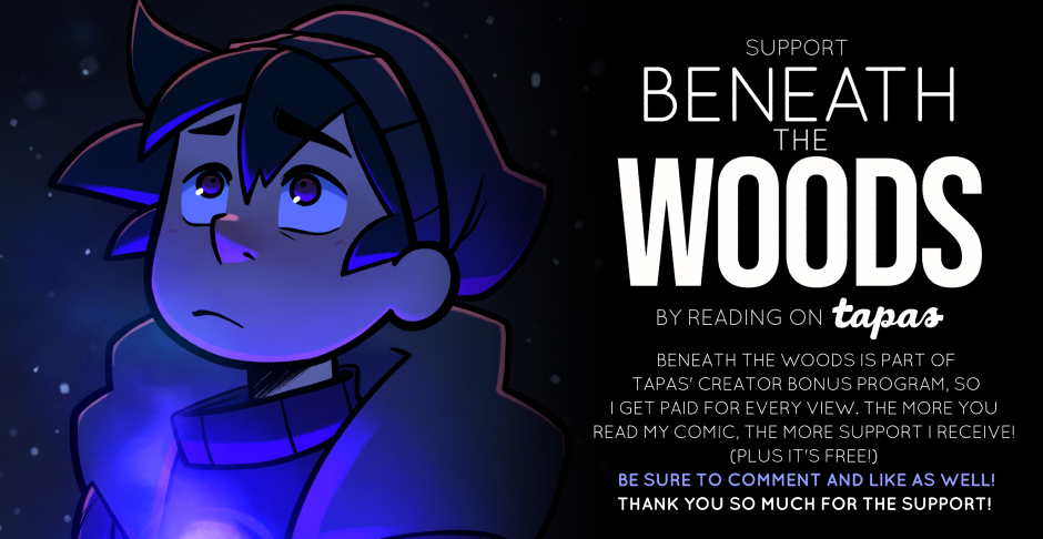 🌌 If you enjoy Beneath the Woods, please consider leaving a comment, liking the page, or subscribing to the comic! BtW is apart of Tapas' Creator Bonus Program, so the more you comment and like the comic, the more support I receive, which means more frequent updates and other goodies down the line! 🌌
