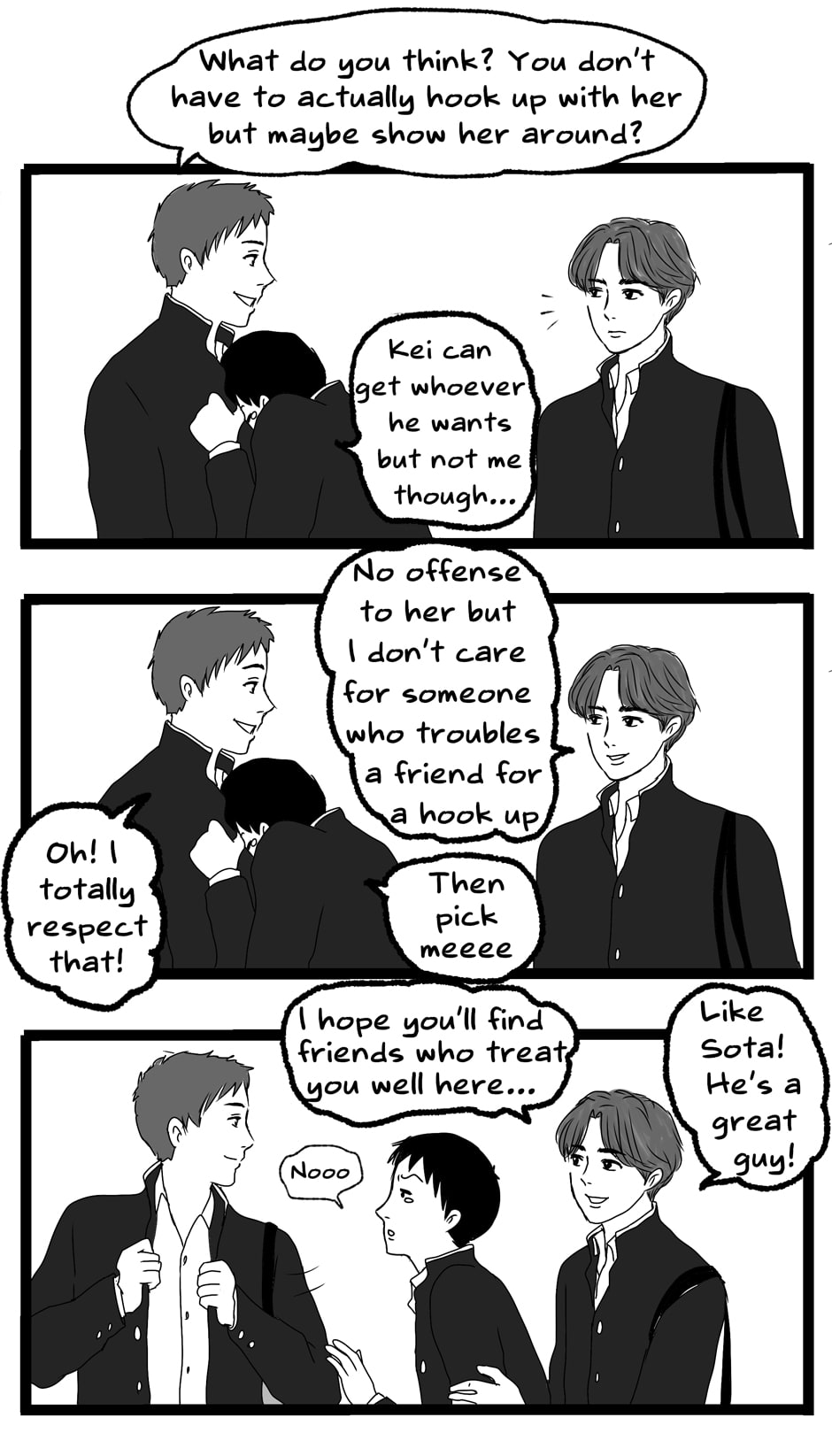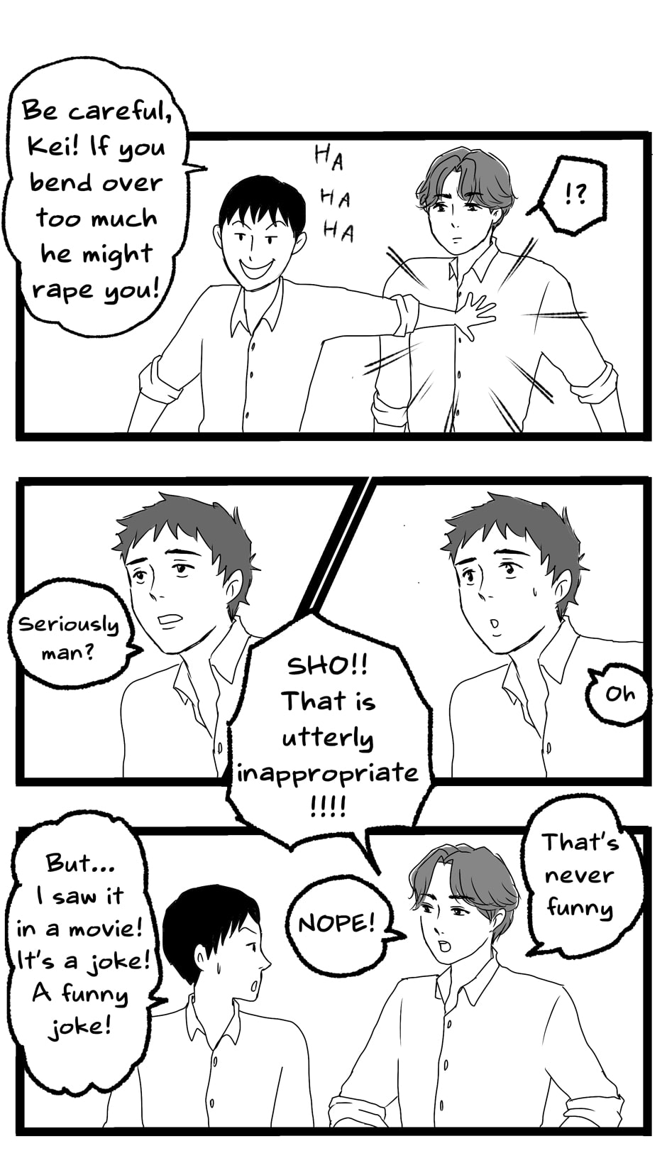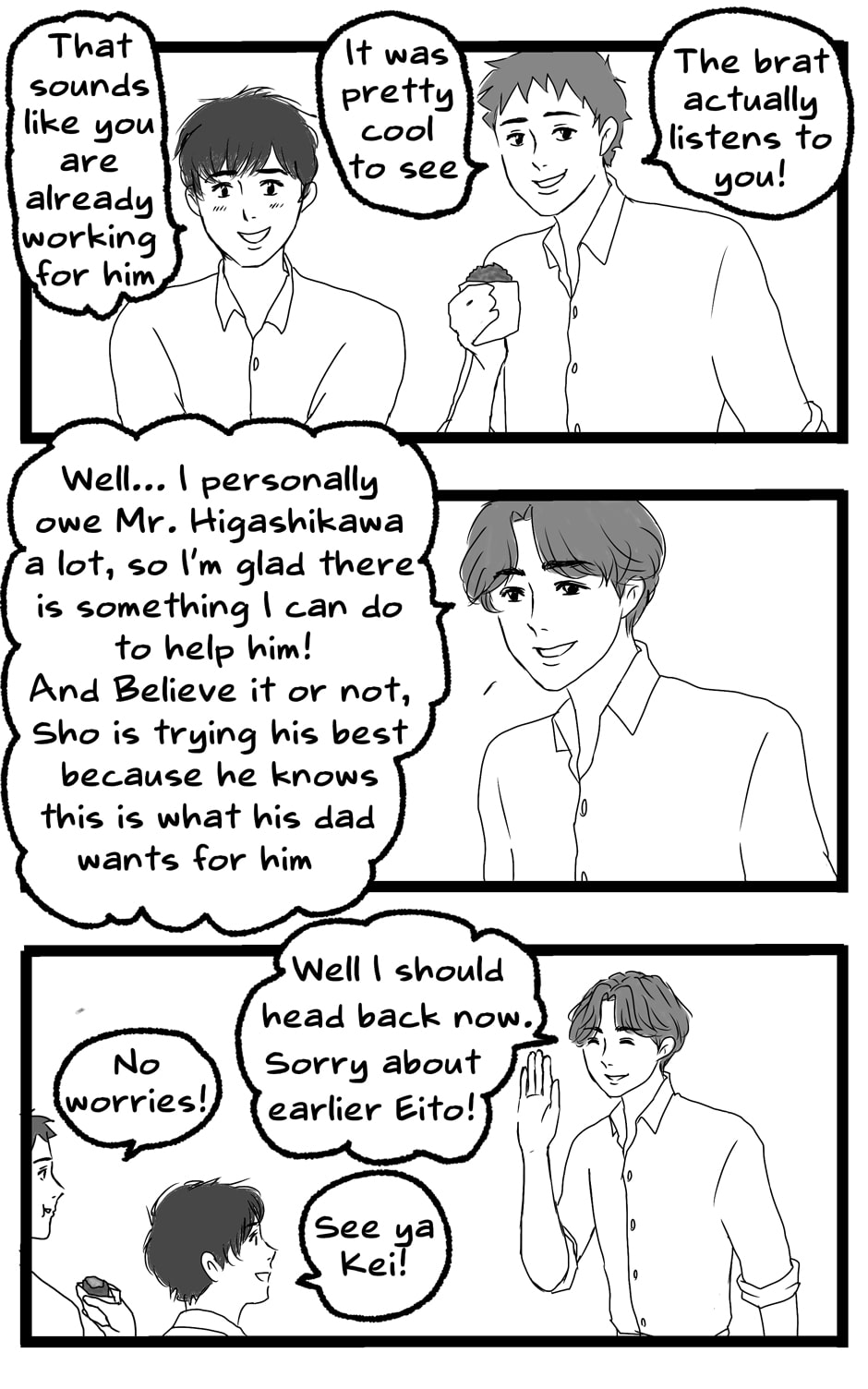 It seems as though Sho has some mental condition or something to be this socially inept... It's good that at least he's not evil and Kei looks out for him. 👌