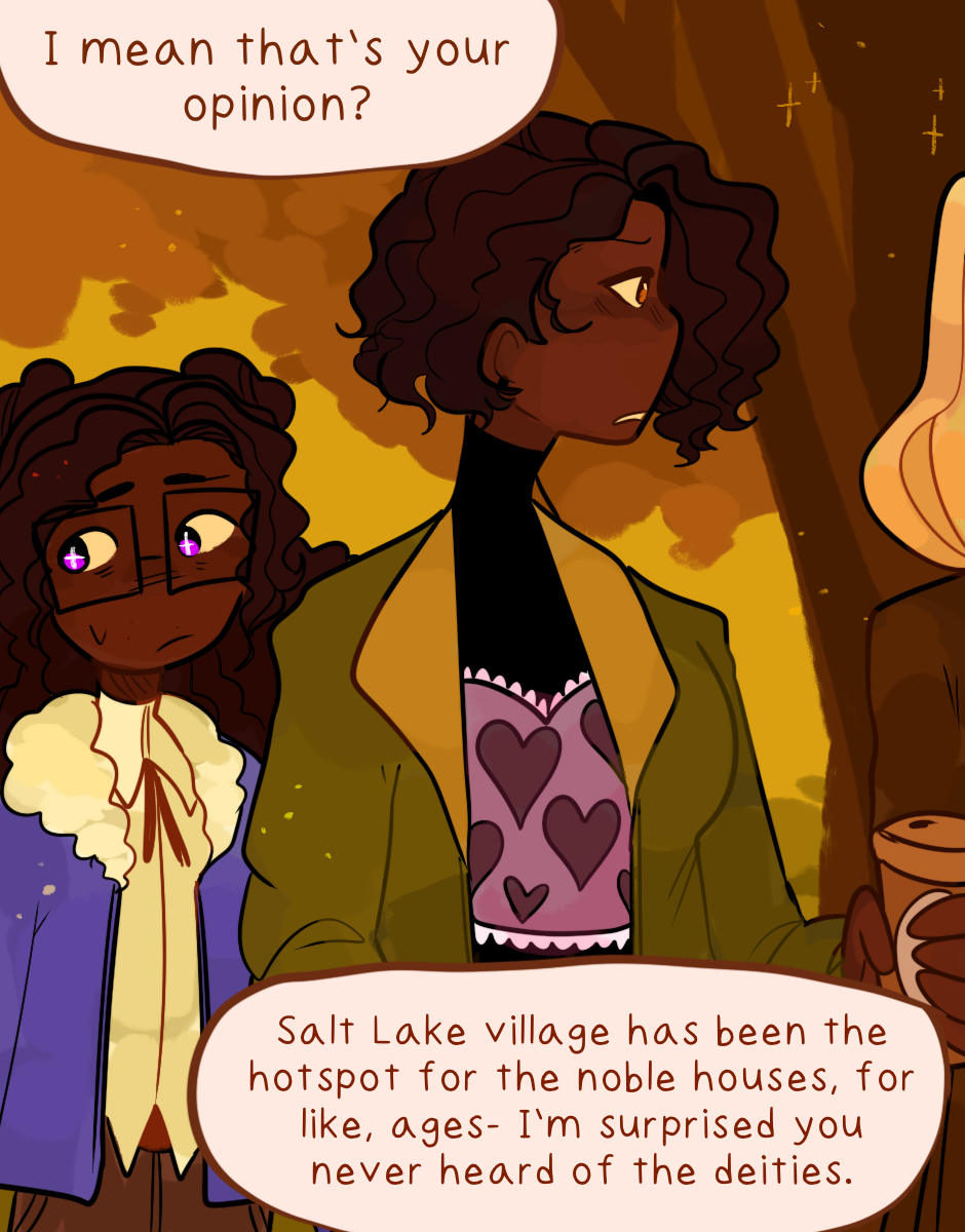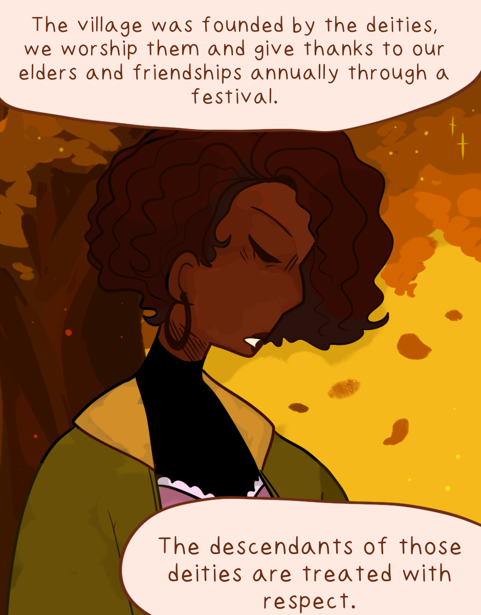 It's always interesting to connect fantasy things to irl things. The "descendants of deities" being the nobles that run the village is called the divine right of kings, in which a ruler was claimed to be placed on the throne by God. Historically speaking, this has not ended well and I doubt it will here either.