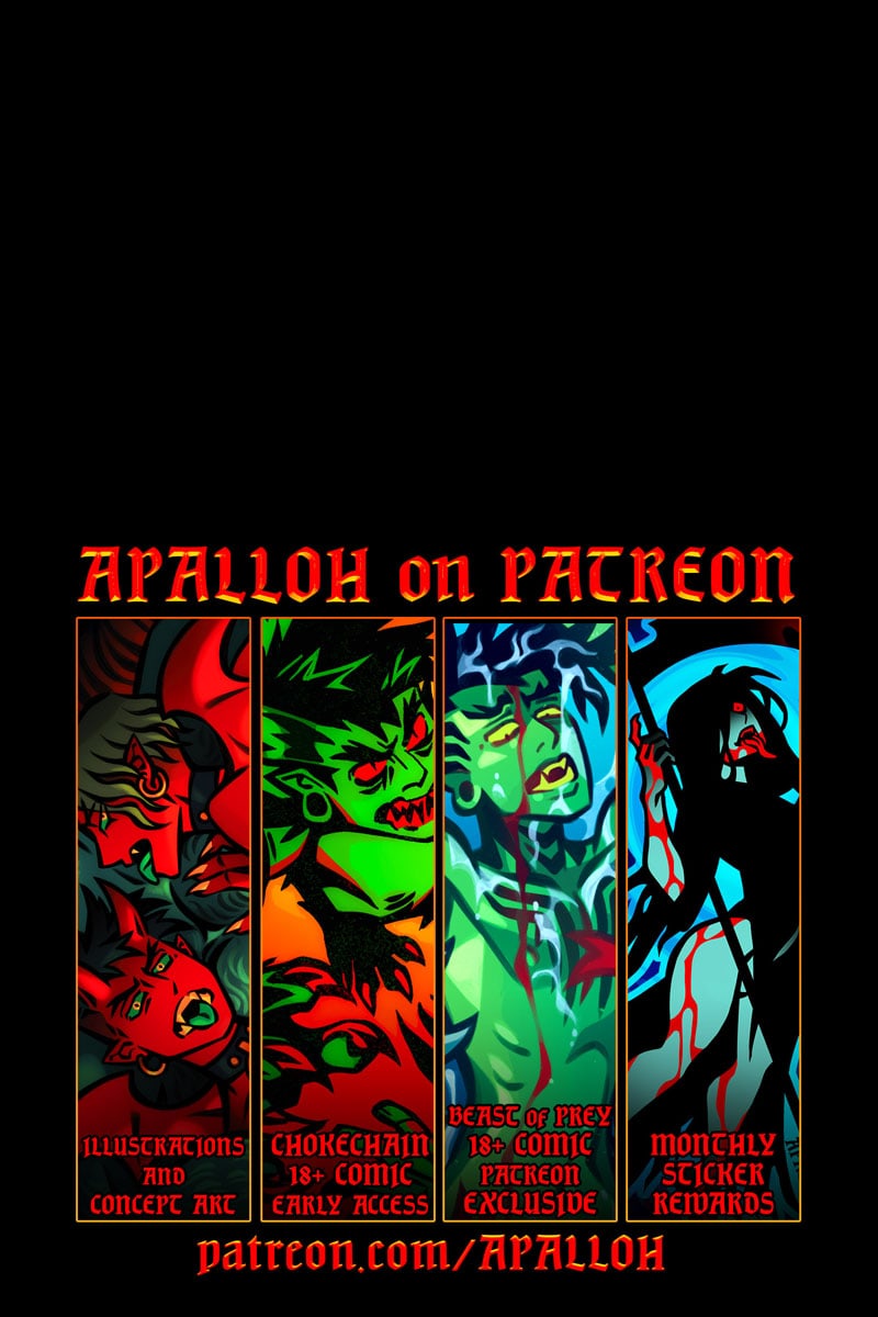Support Apalloh on Patreon to read CHOKECHAIN uncensored + gain early access to updates! www.patreon.com/Apalloh CW: swearing, alcohol, intoxication, manipulation, consensual but leans heavily on dubc0n, violence, biting, blood, gore, nudity, graphic sex, restraints, submission/dominance, animal-like anatomy, teratophilia --- *dom mode initiated*