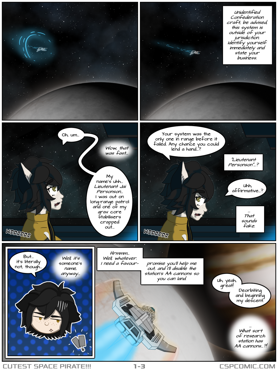 Cutest Space Pirate!!! is an action/ecchi sci-fi webcomic about spaceships, aliens, and flirty catboys! Primarily a sci-fi exploration and reluctant redemption story set in the semi-distant future, protagonist Jaimie's natural charisma often adds suggestive overtones to his adventures on the untamed Frontier.