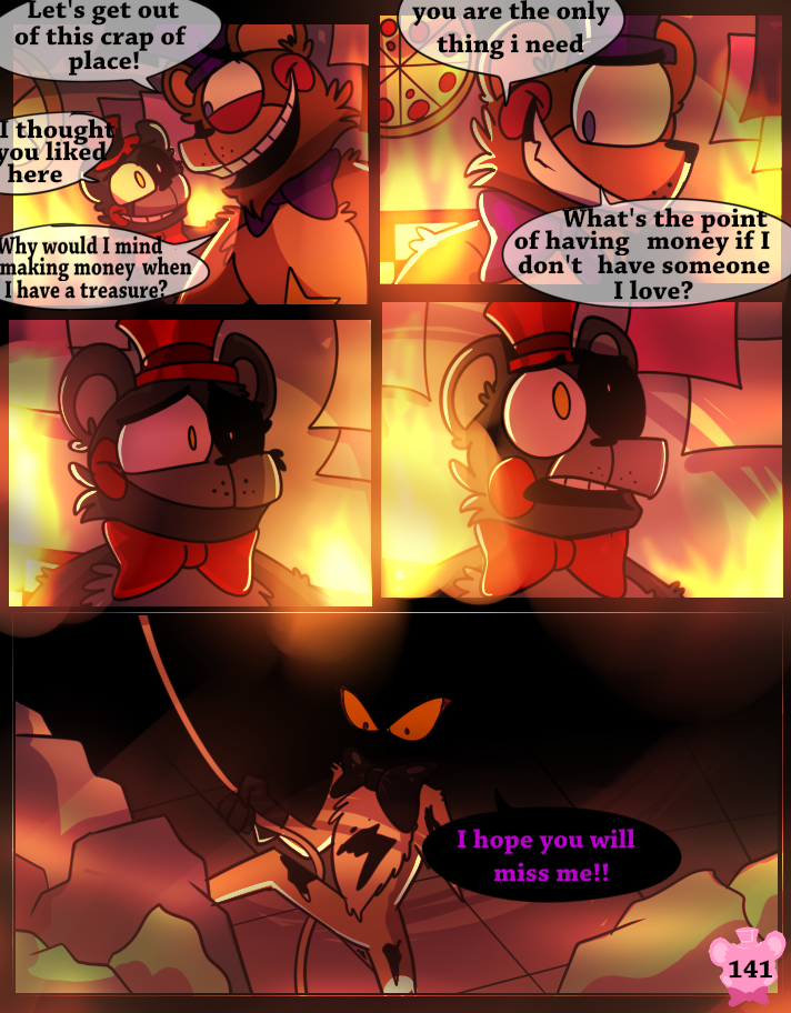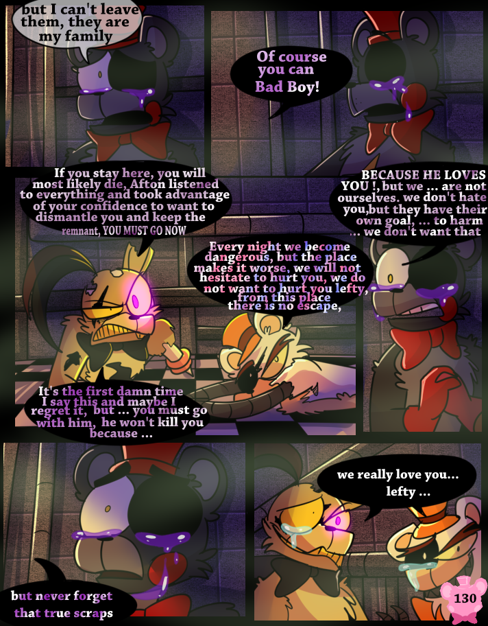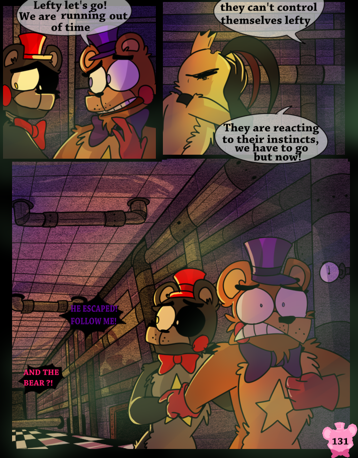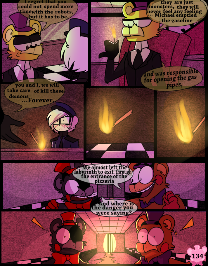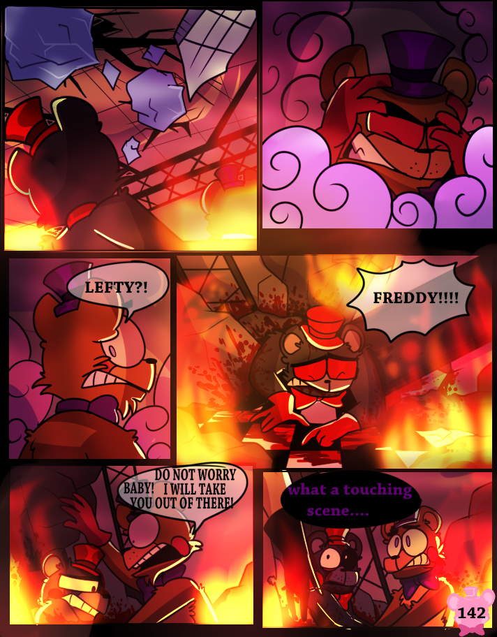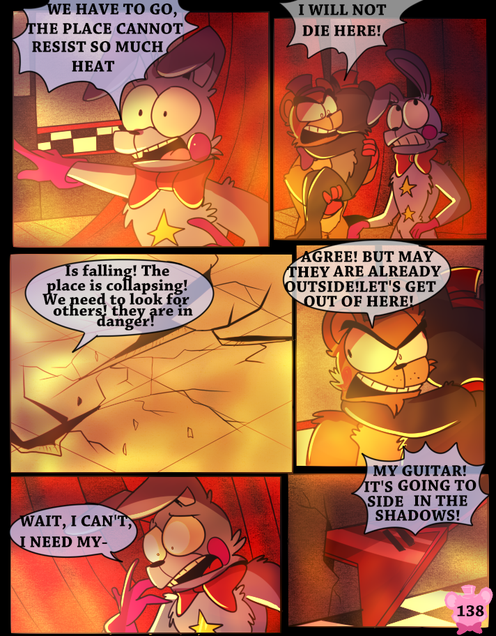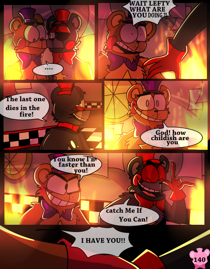 Something has possessed the Scraps, making them act like monsters. A lucky break allows Lefty and Rockstar Freddy to get out of the maze, but the place goes up in flames.