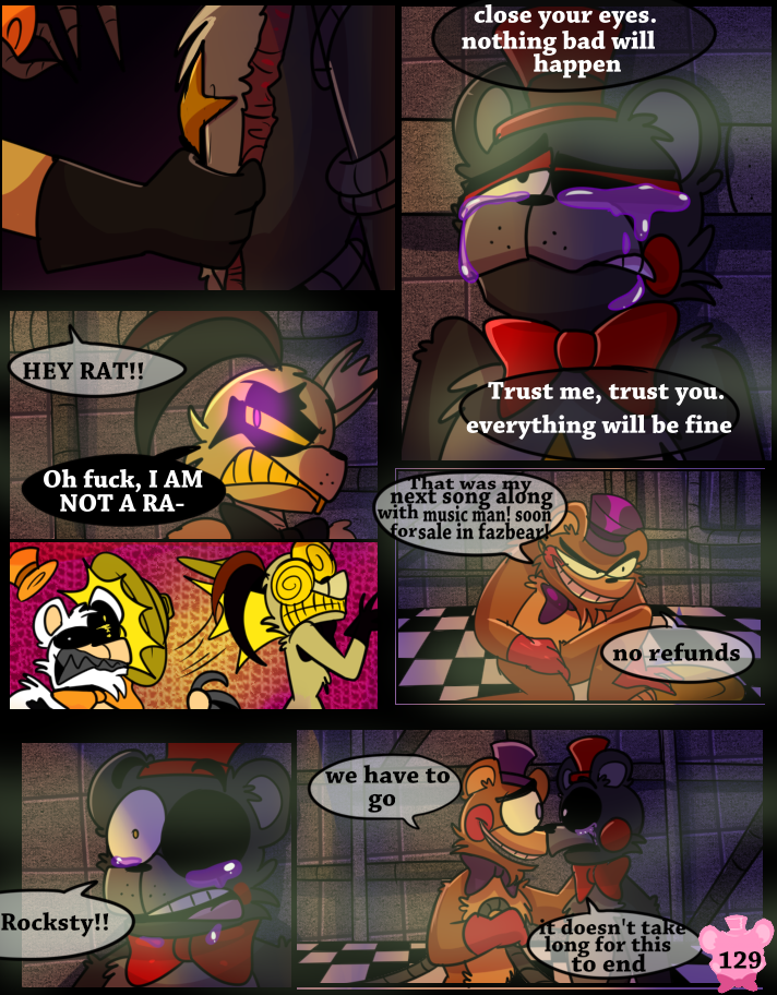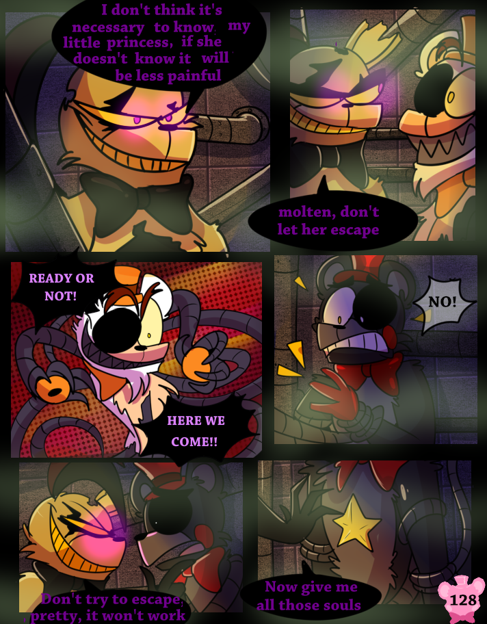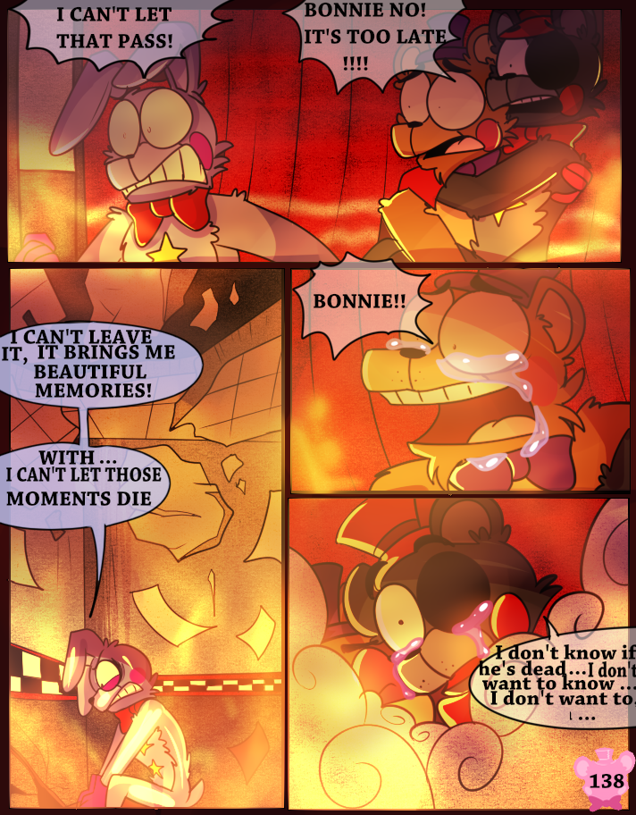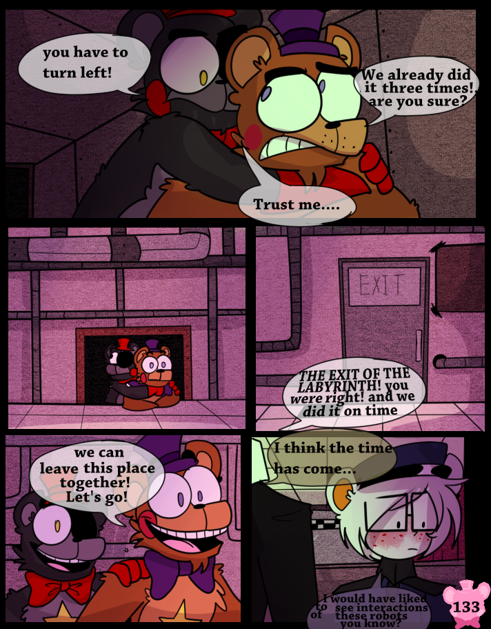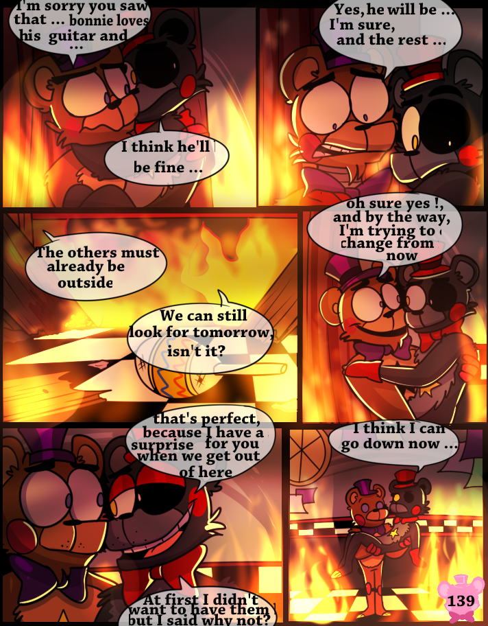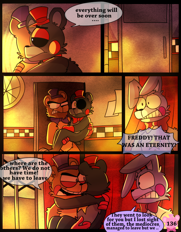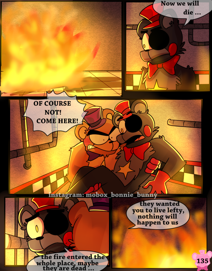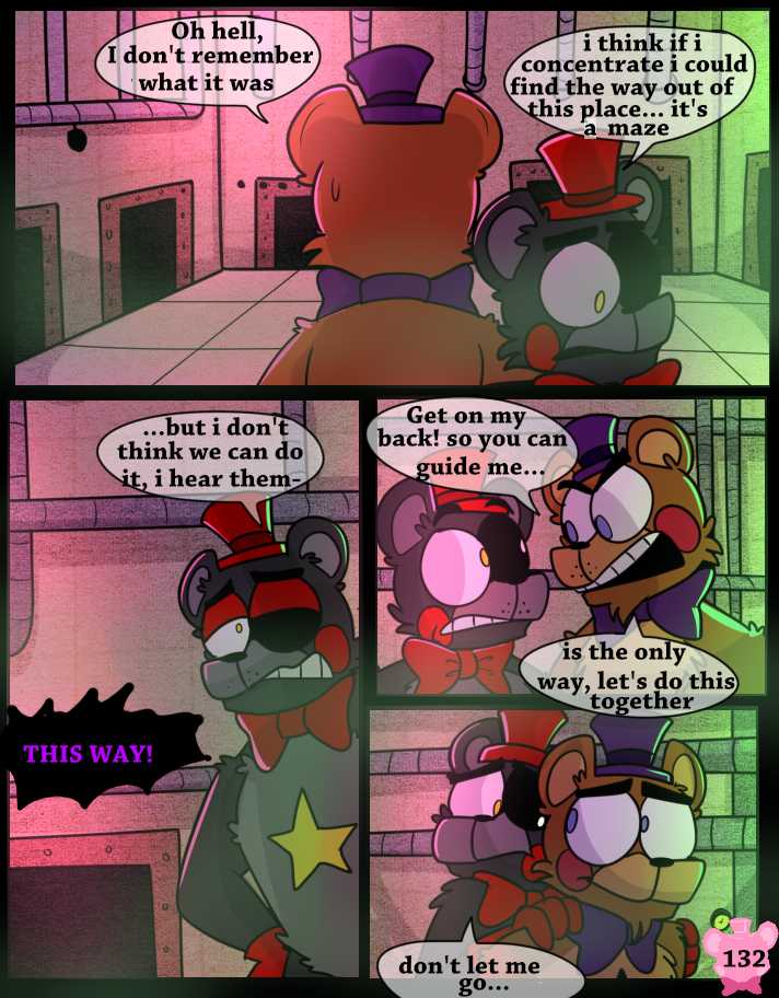 Something has possessed the Scraps, making them act like monsters. A lucky break allows Lefty and Rockstar Freddy to get out of the maze, but the place goes up in flames.