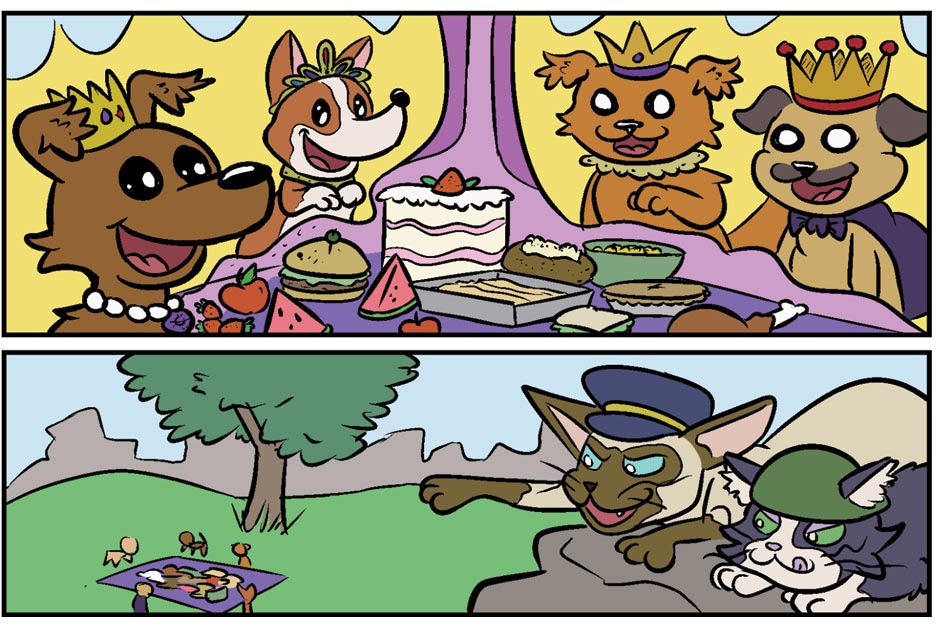Princess Pups know how to picnic with piles of proper snacks! But who are these cats?!?