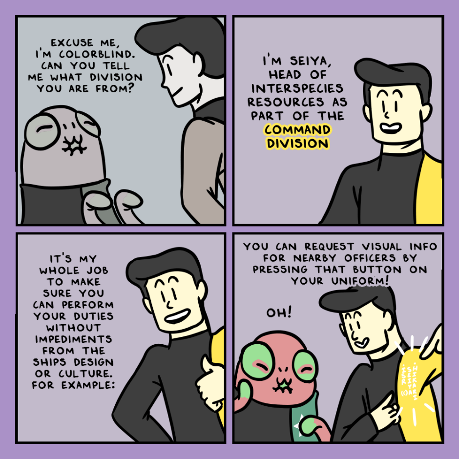 So yellow is the head division Red is security Blue is science Orange is engineering Green is health White is kitchen I think that's all of them?