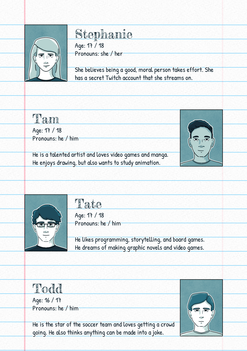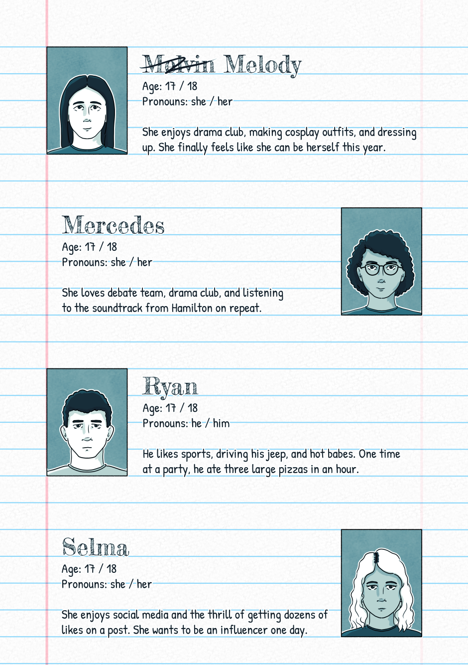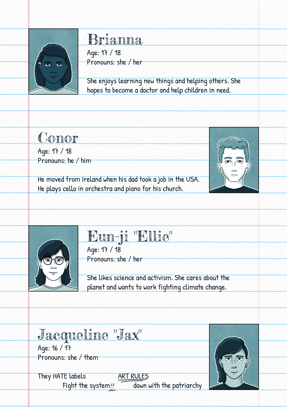 Edit: Moved the character bios for chapter one to after a bit of the prologue. The rollout of characters is a bit slow for Wear Your Heart Out, and when characters show up they will not always be named. Some characters may seem rather minor at first and be explored in more detail at later points in the story. This list basically represents characters that all attend school with Alex and show up at some point in the first chapter. Additional characters may show up in future chapters, and characters outside of school will get their own introductions in the future.