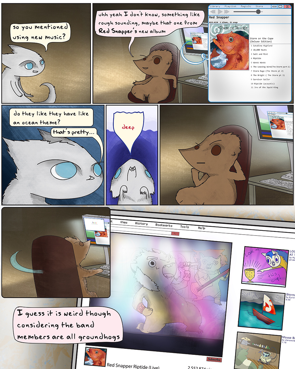You saw it here first folks! The first usage of iTunes and YouTube in a fantasy comic with talking animals! Also, kudos to anyone who zooms way in on these comics to see the dumb little things I put on the computer screens