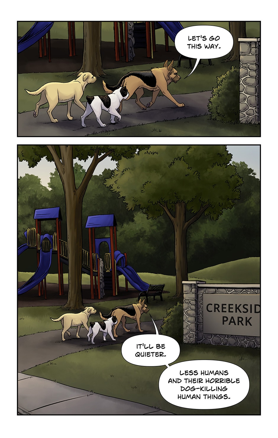 I decided to insert a second page into this part to show the transition between locations and make it a bit more clear where the dogs were on the following page, that they didn't leave town to end up in a forest. They're still in town, just in a city park.
