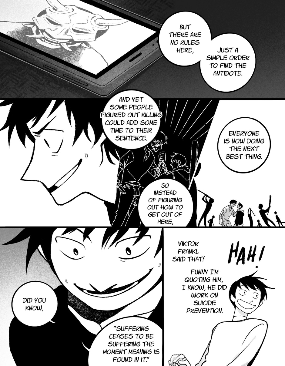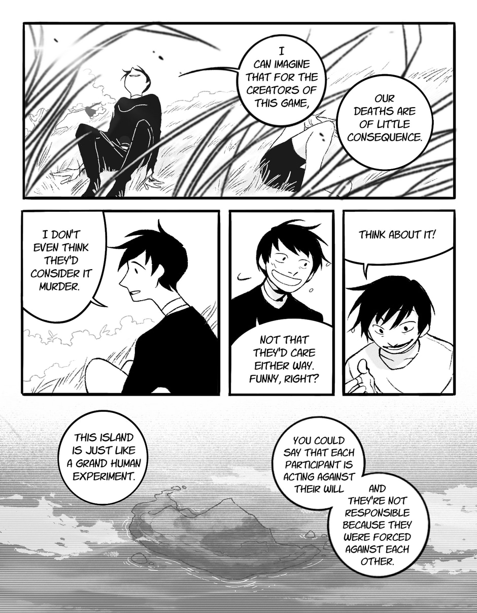 “Attached to your neck is a collar that will inject a poison into your jugular vein two days from now. Forcibly removing the device will also trigger the poison. Somewhere on this island is the antidote. Live or die. Make your choice.”