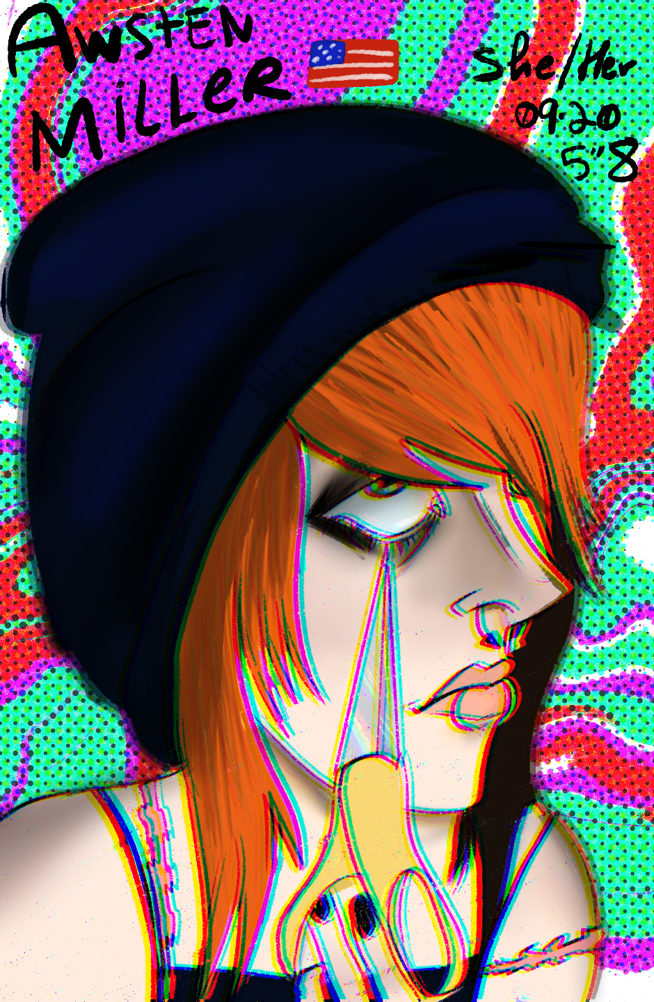 Alright! Our second character, and slight love interest, is Awsten Miller! With the amount of chaotic energy she exudes she would be a total wreck; surprisingly her life is actually balanced with only the tiniest help of her roommate and friend.