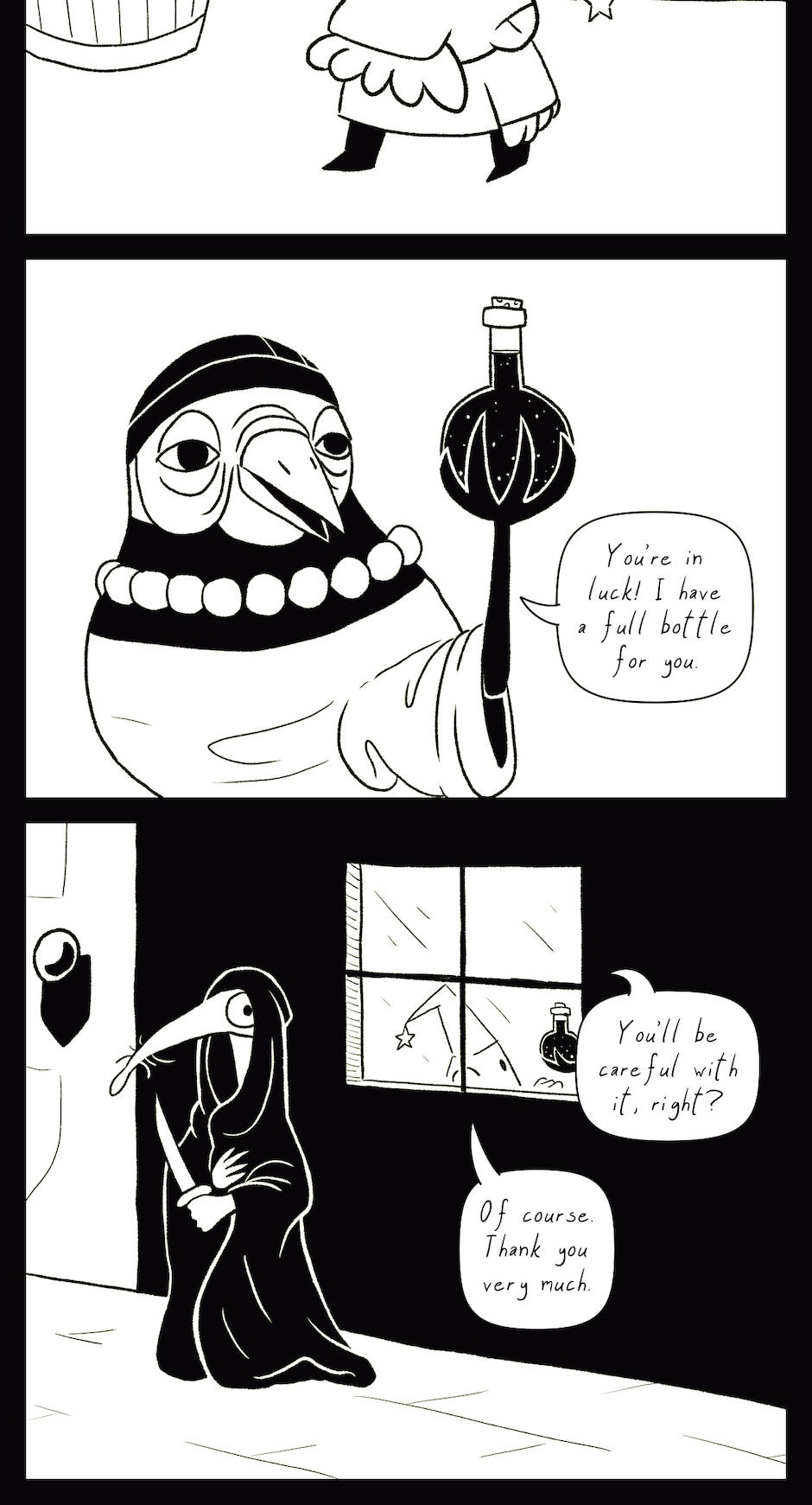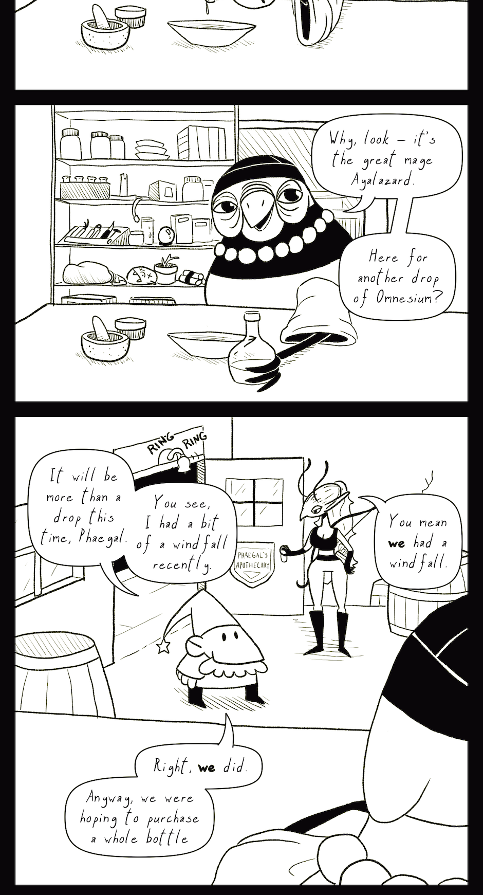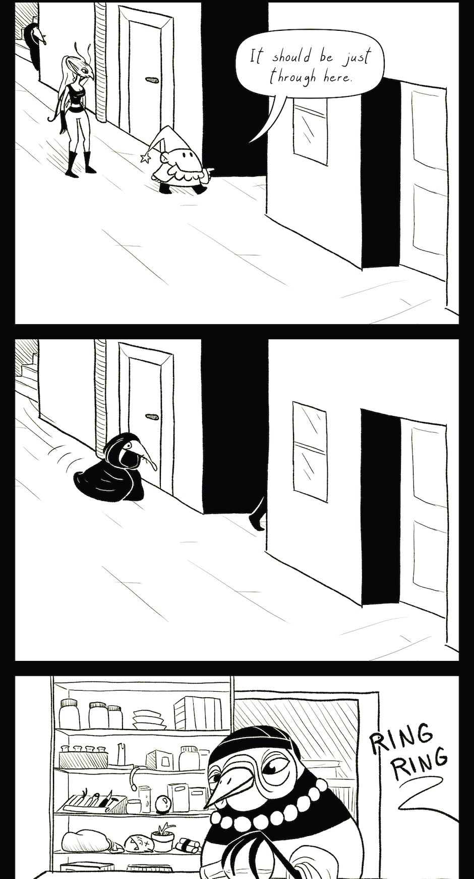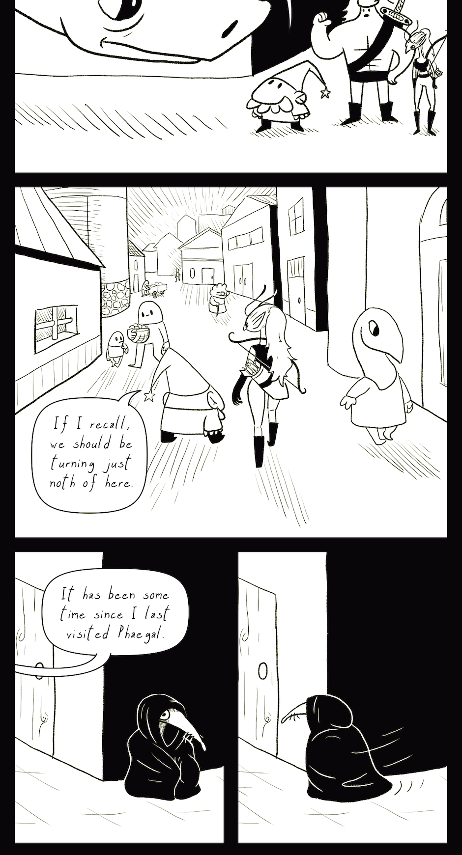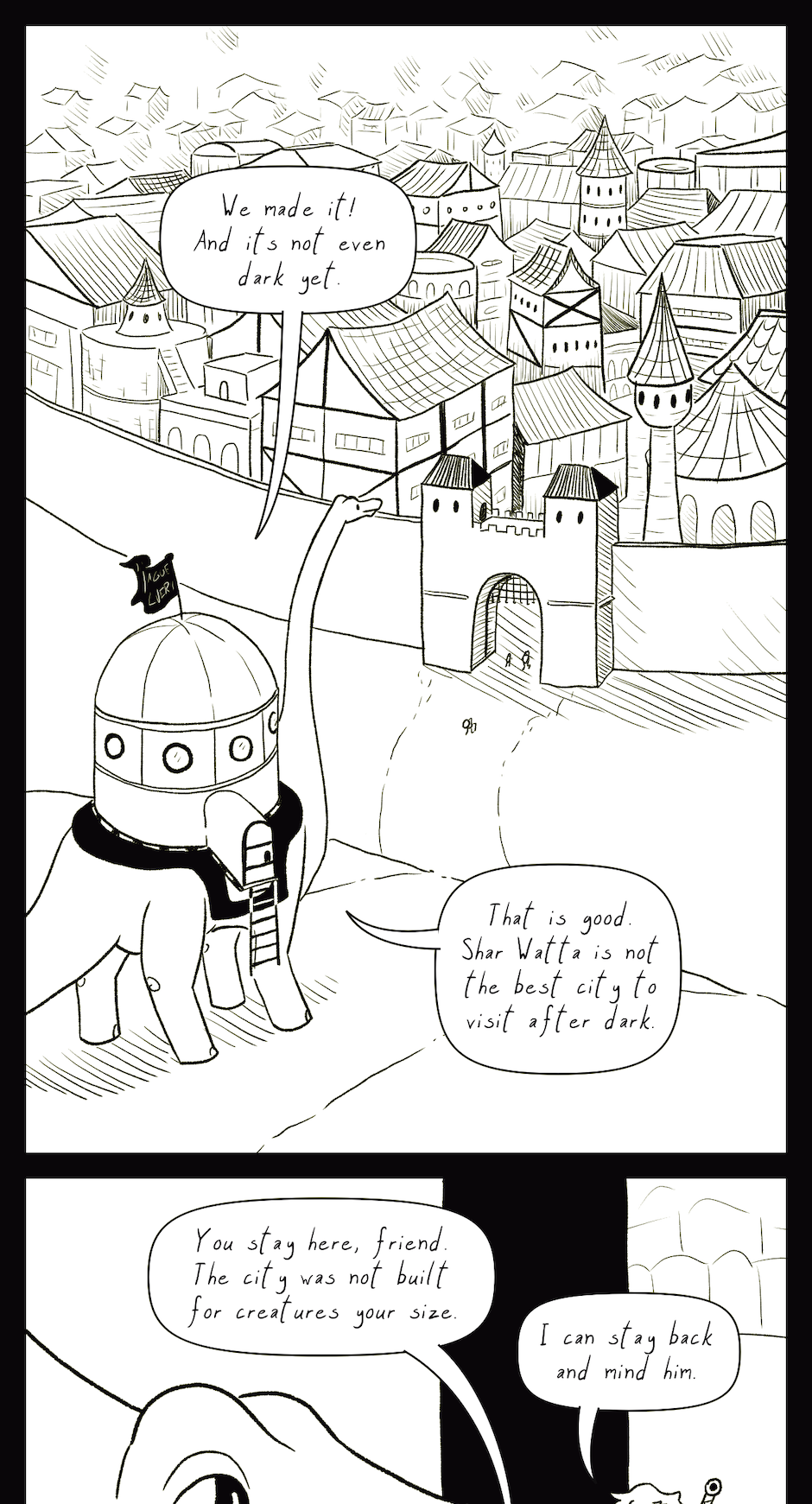 Behind the Scenes: This was my second attempt at the cityscape in the first panel. In the original version, the camera was zoomed further back and there were even more tiny little buildings to draw. It took forever, but I hated it, so I threw it away and redrew it. That's what art is like sometimes.