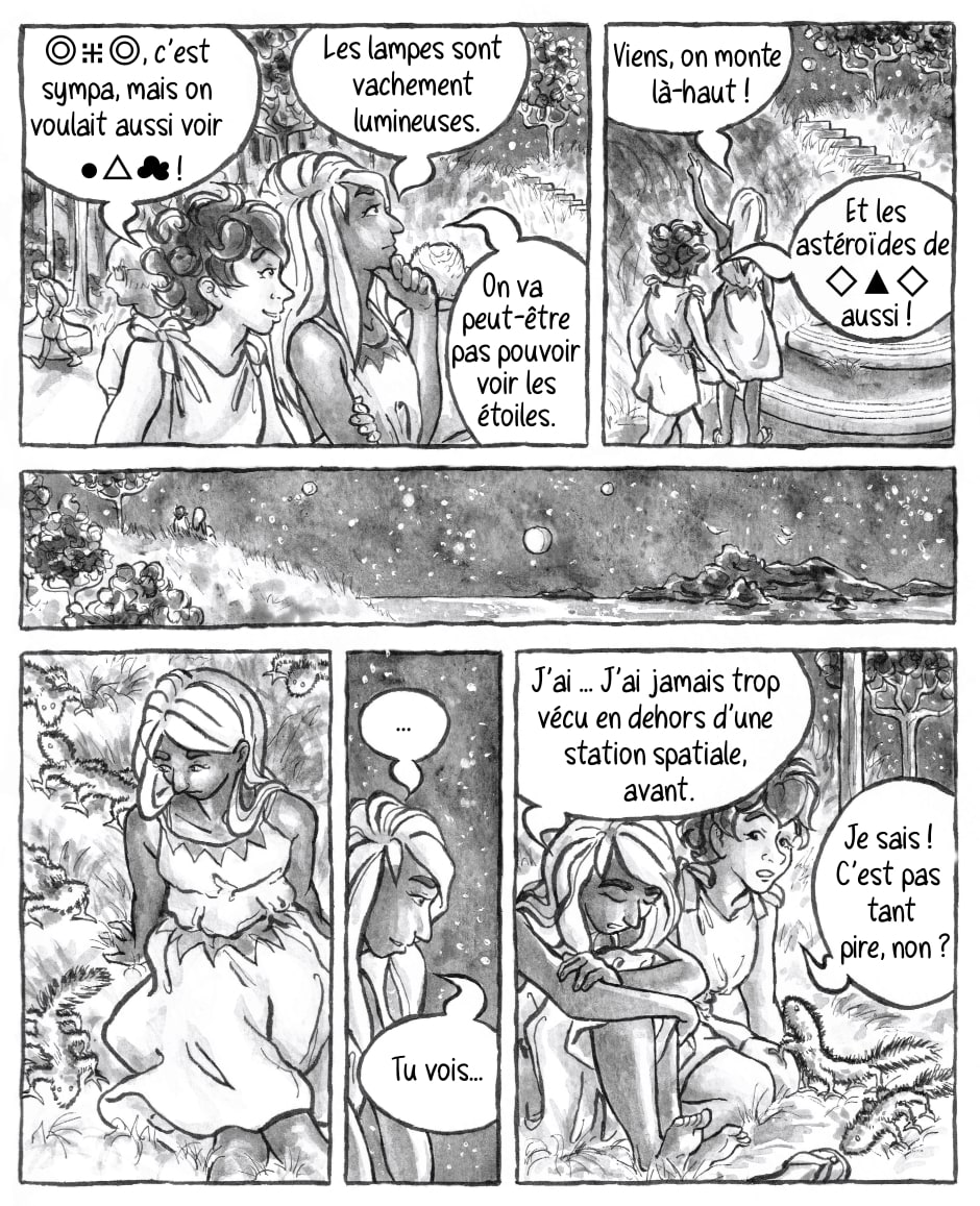 Anisha et Brune campent sur une petite planète sympa, pas loin d’un secteur touristique. Elles profitent de leurs vacances dans la galaxie ⨳⁜⁕, explorent et passent du temps ensemble avant de reprendre le travail.