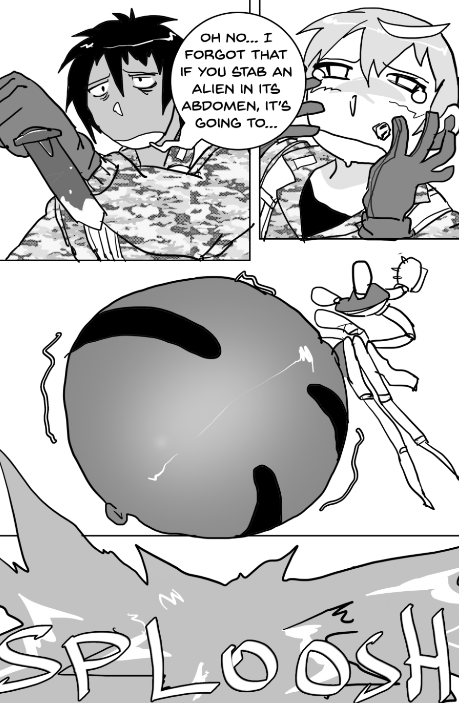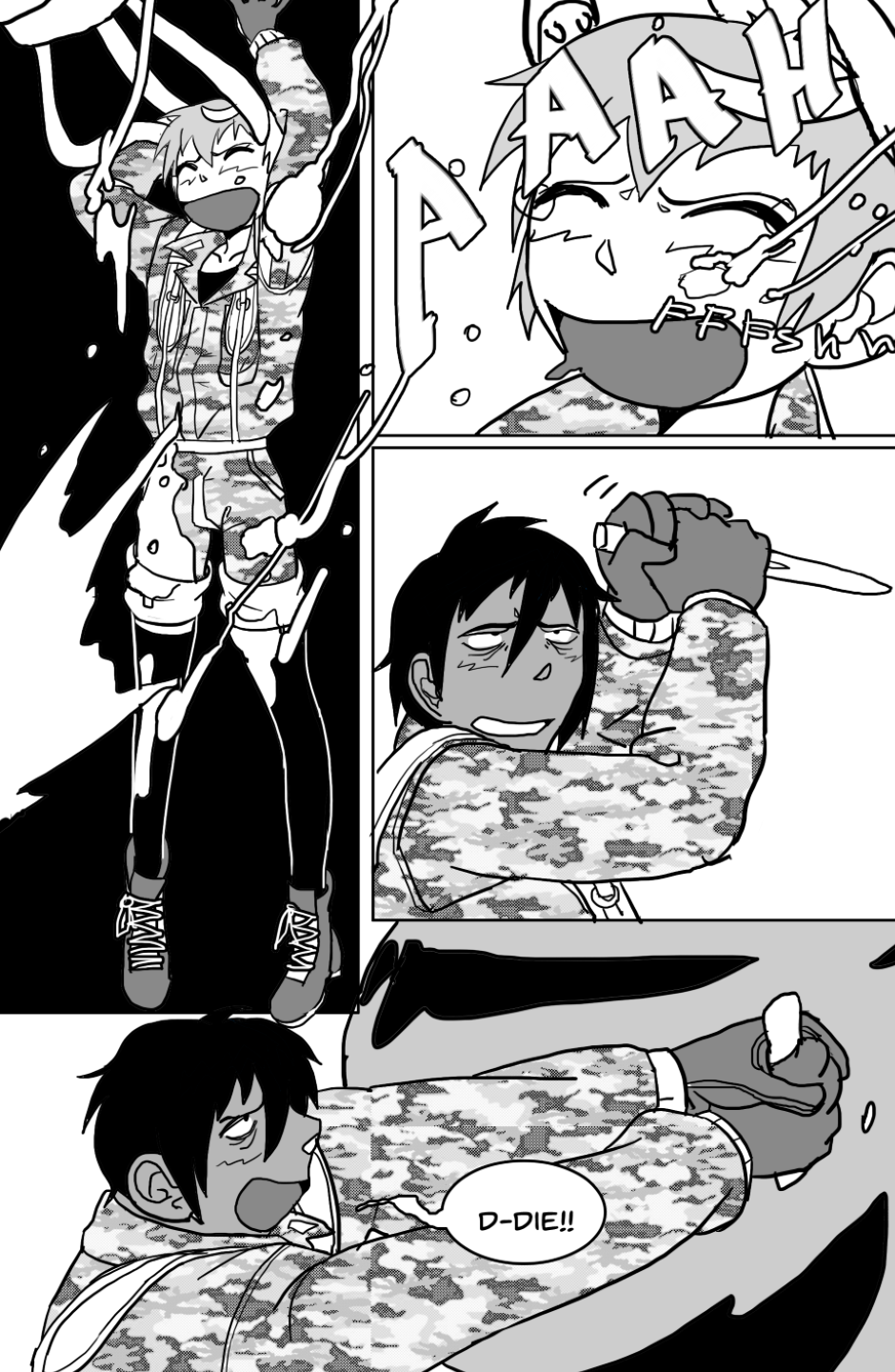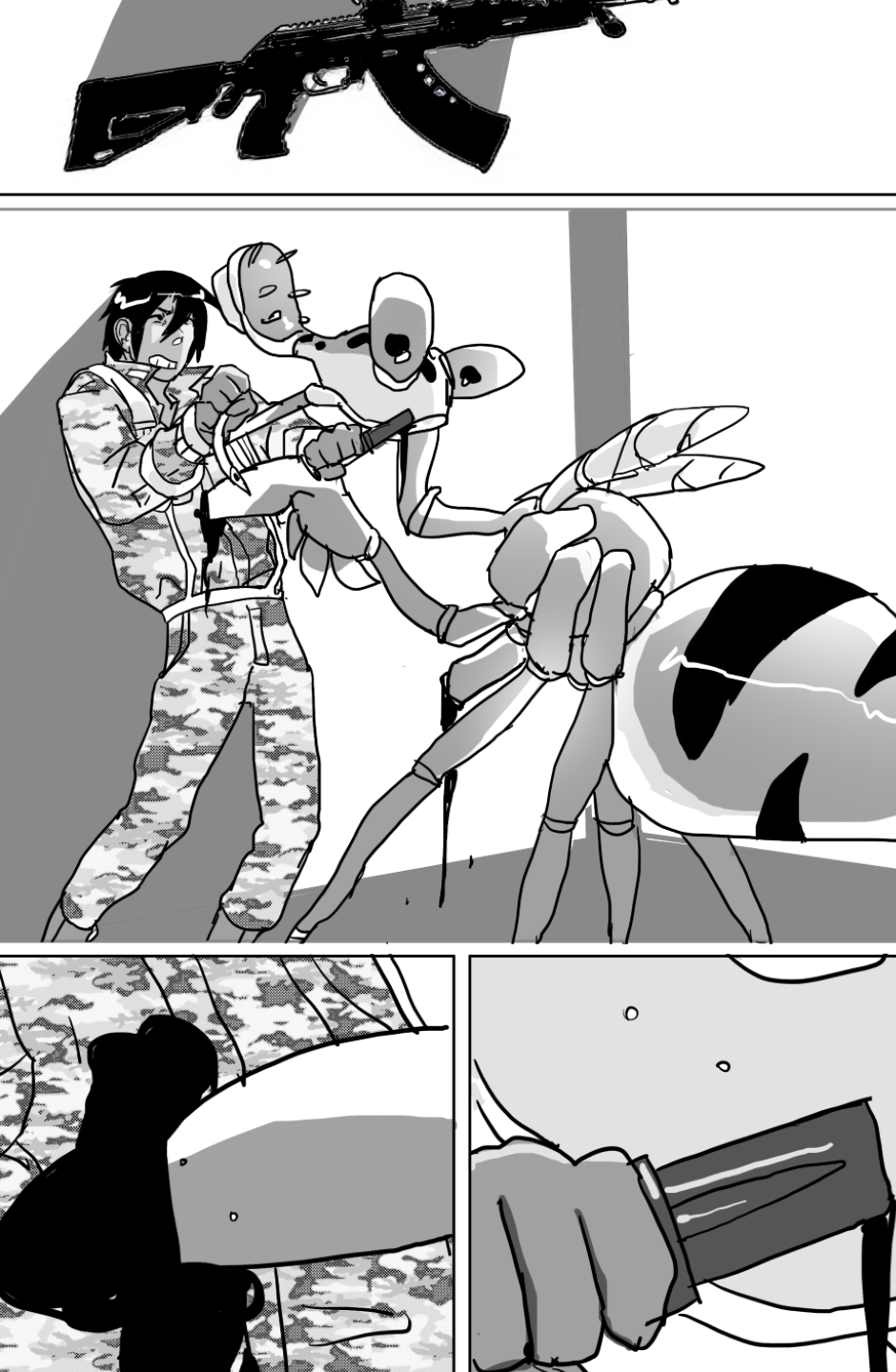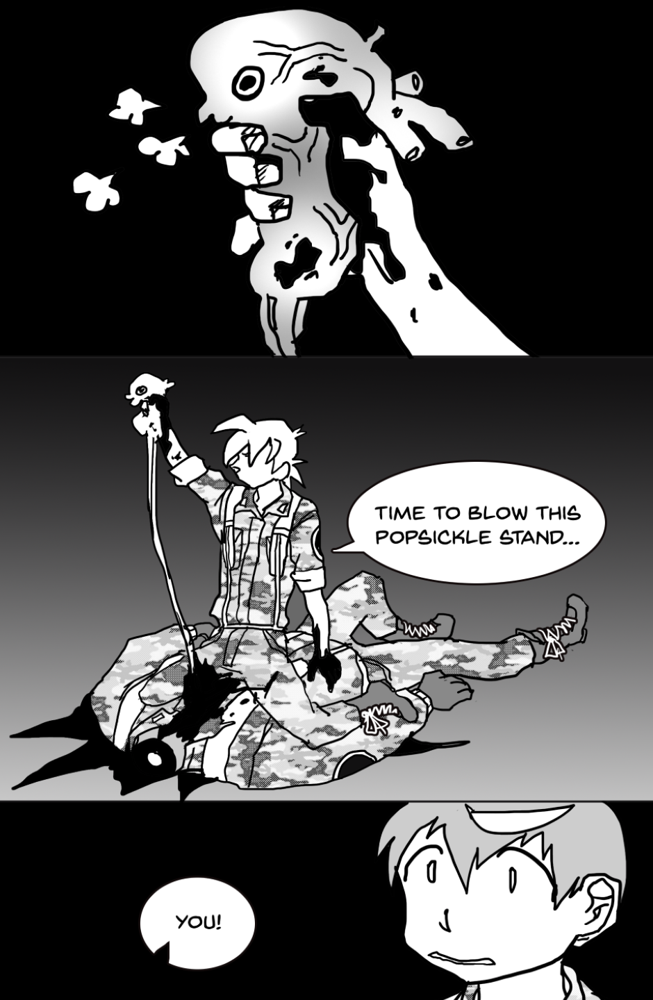 She covers in fear as she's facing off aliens and mutants, who ravage the Earth after a great catastrophe drove the population into the hidden corners of the world, leaving the hope to the kids with guns to defend.