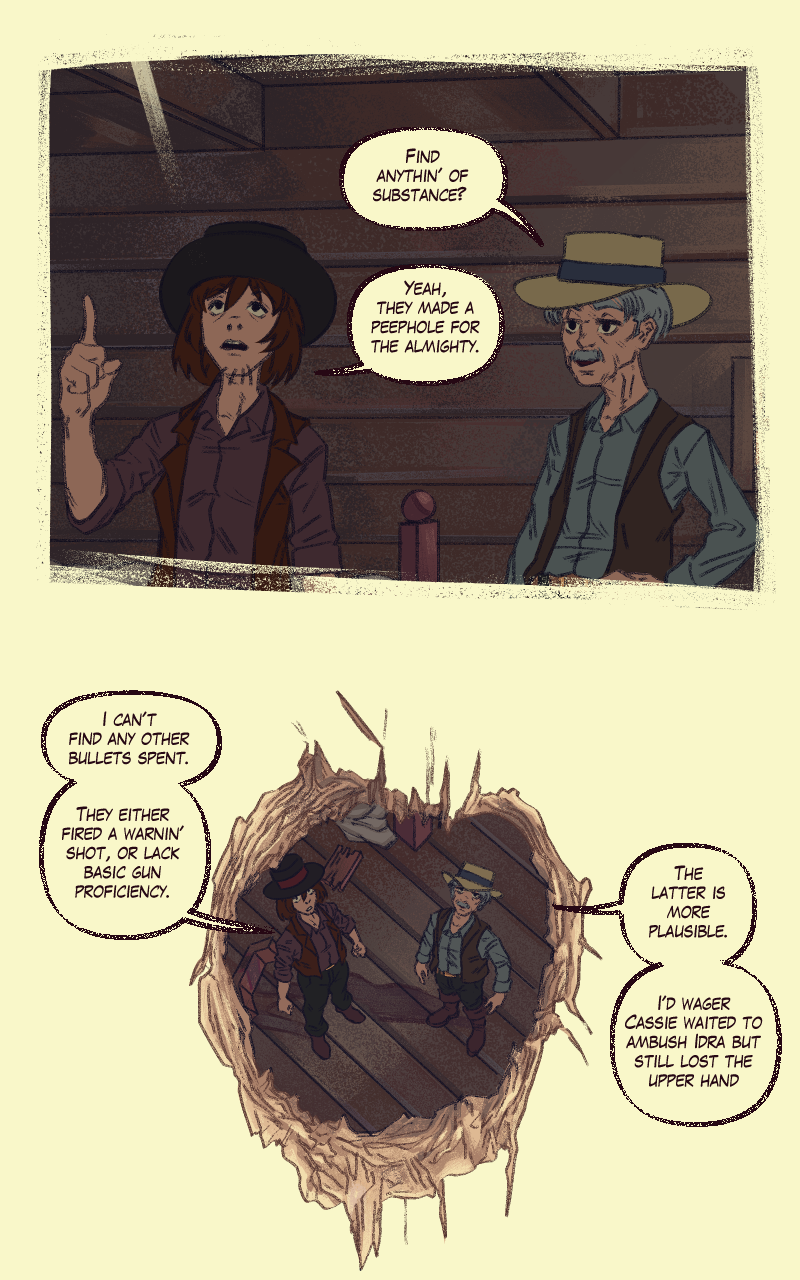 The Southern Wilds is an unforgiving environment. The heat will cook you, the animals are ravenous, and even the plant life is untrustworthy. Cassie is an unseasoned outlaw caught in the difficult position of either hunting down her former gang members to hang or being hanged herself. Her choices lead her on a path that takes her all across The Wilds. Whether choosing to do the right thing or playing for the bad guys to survive, it's often said trying to travel two paths at once gets you nowhere...