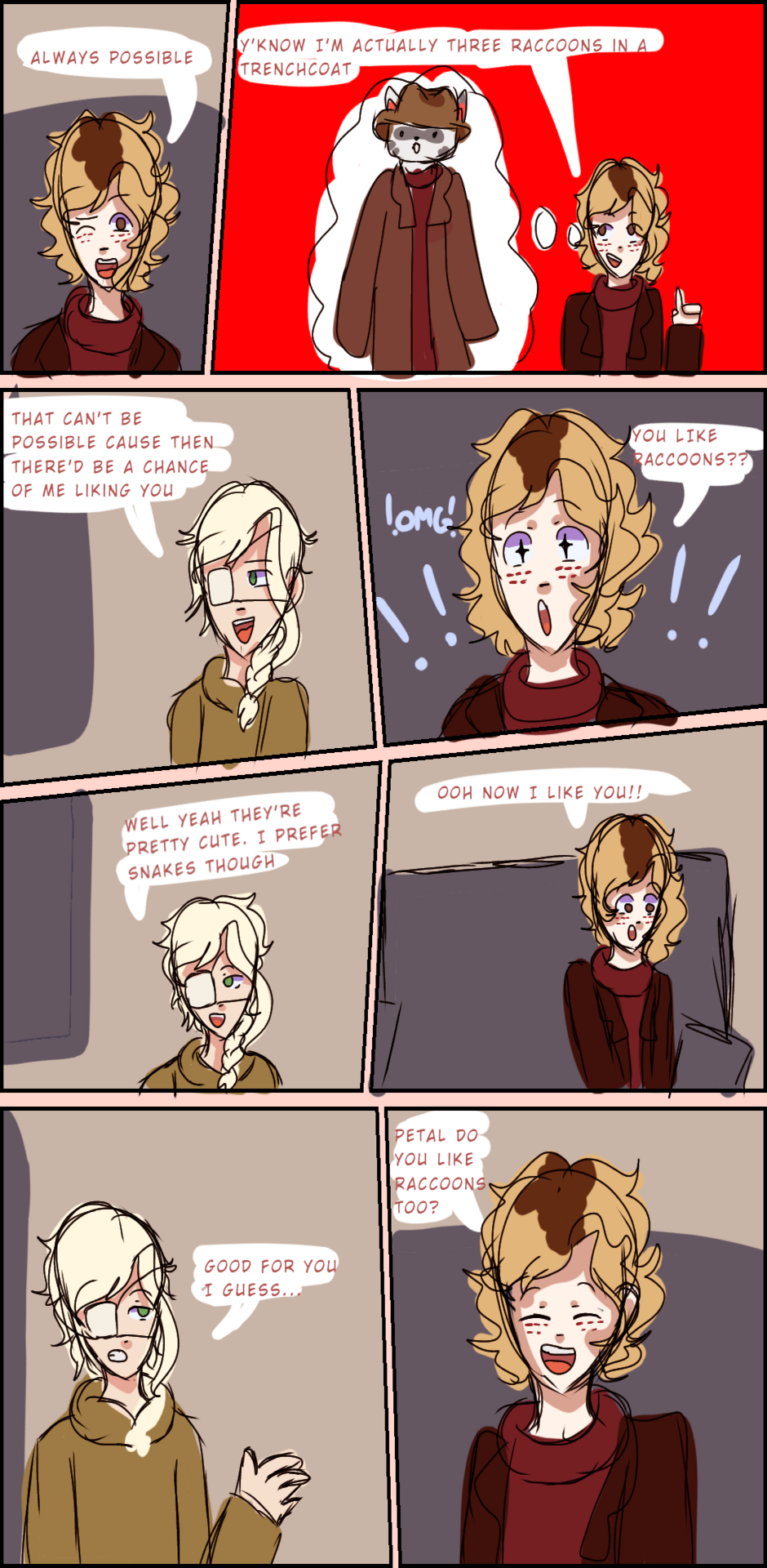 Three raccoons in a trench coat