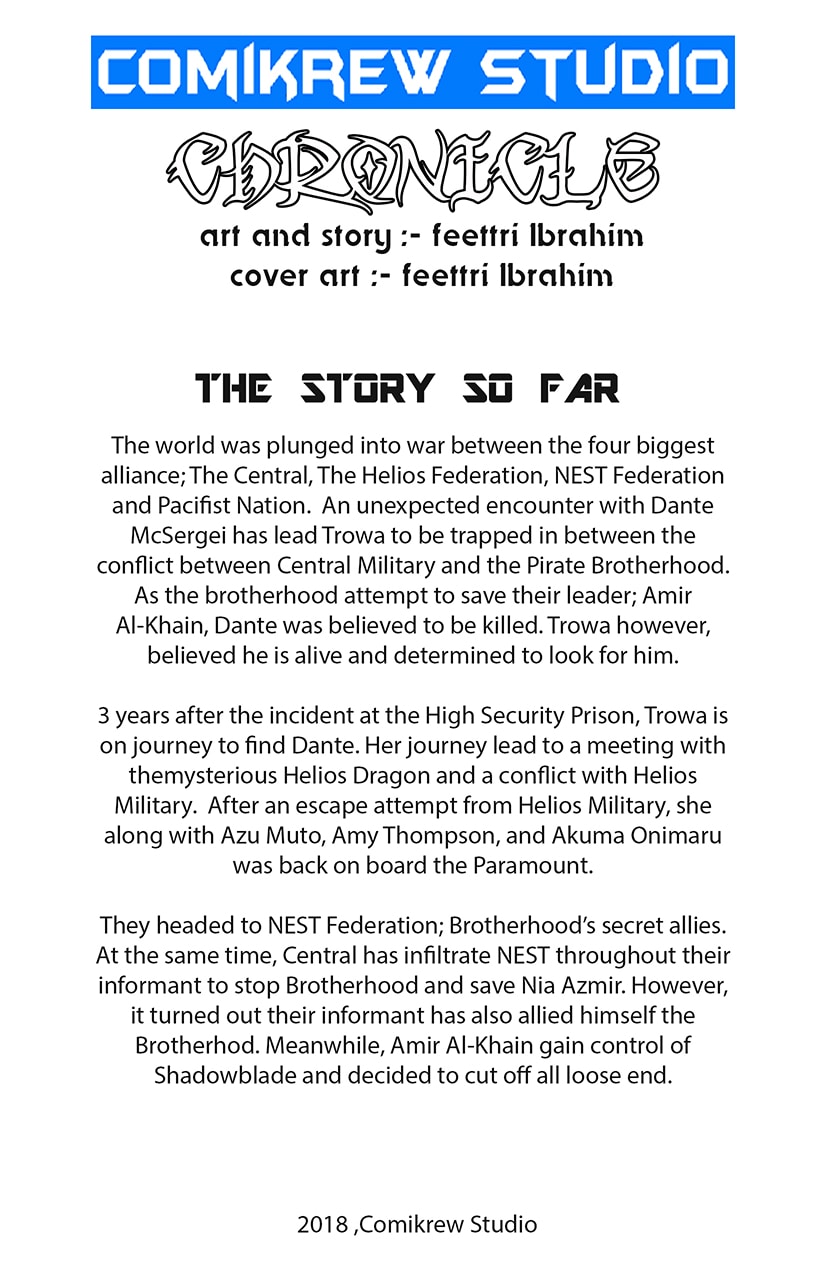 Chronicle is back !! In this continuation of the Earth Union arc, Pirate Brotherhood is now in full force to prove they are the strongest among everyone in the world. Nia Azmir with the help of Danzo Inamura are doing their best to escape from The Paramount but, can they survive the Brotherhood's secret weapon; Shanti ?