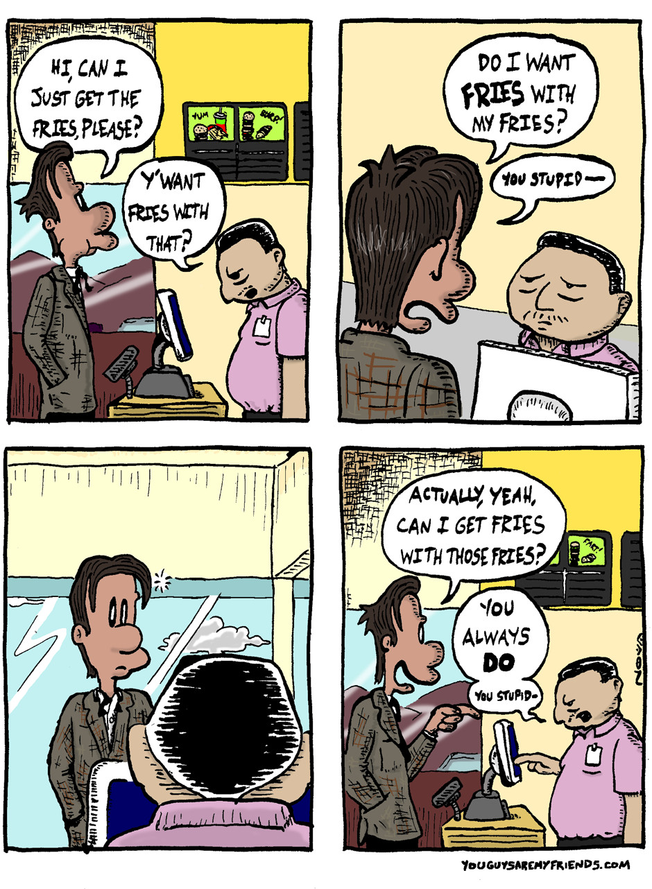 Fast food, we've all been there. Food so far removed from the soul it's been formulated to release braincell eating parasites upon ingestion! To make things worse, these parasites then coerce the host to return to the fast food restaurant to consume even more parasites, slowly trapping the host organism in a quicksand of parasites & mental cesspools.