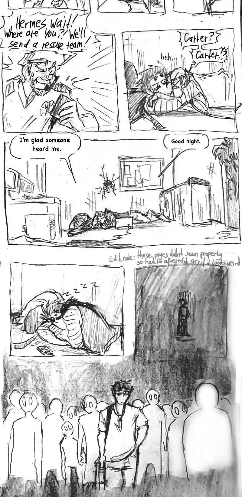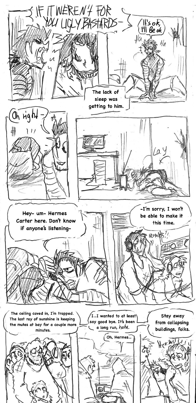 (this is such a shitpost comic lol) Three years ago, when the infection started, he came out of nowhere, wandering the empty streets, sleeping under the stars and pushing himself to inhuman distances just to help other living beings. Name's Hermes Carter. He's one of few brave (or insane) humans, that dare live in the wilderness among the undead and the mutated, constantly on the run from those gore-ish forces. Eventually, a dead end in a collapsed mall leaves him desperate. What now?