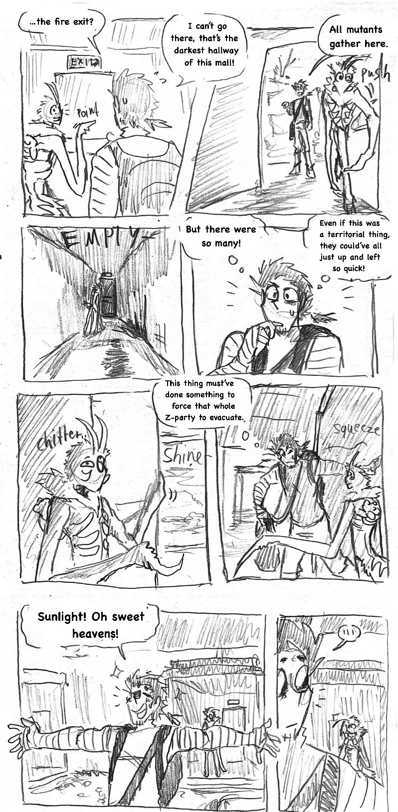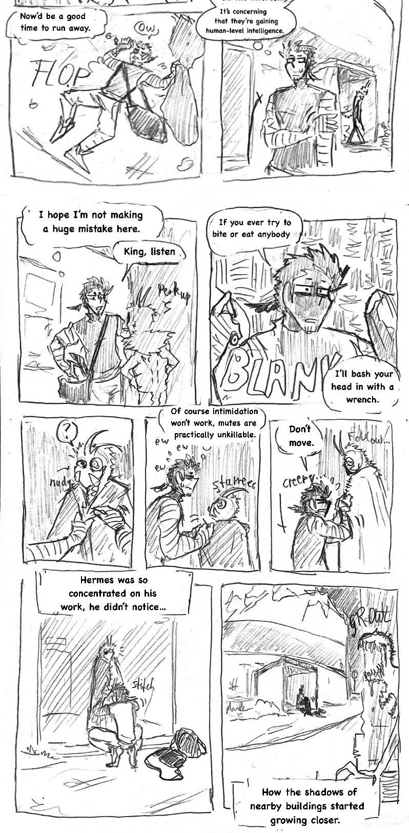 (this is such a shitpost comic lol) Three years ago, when the infection started, he came out of nowhere, wandering the empty streets, sleeping under the stars and pushing himself to inhuman distances just to help other living beings. Name's Hermes Carter. He's one of few brave (or insane) humans, that dare live in the wilderness among the undead and the mutated, constantly on the run from those gore-ish forces. Eventually, a dead end in a collapsed mall leaves him desperate. What now?