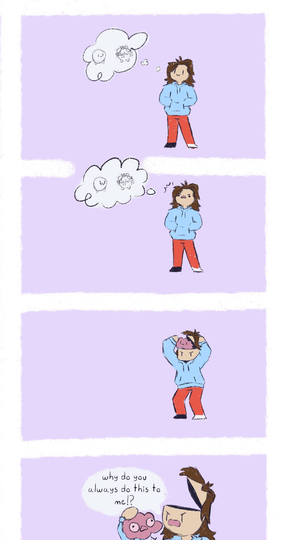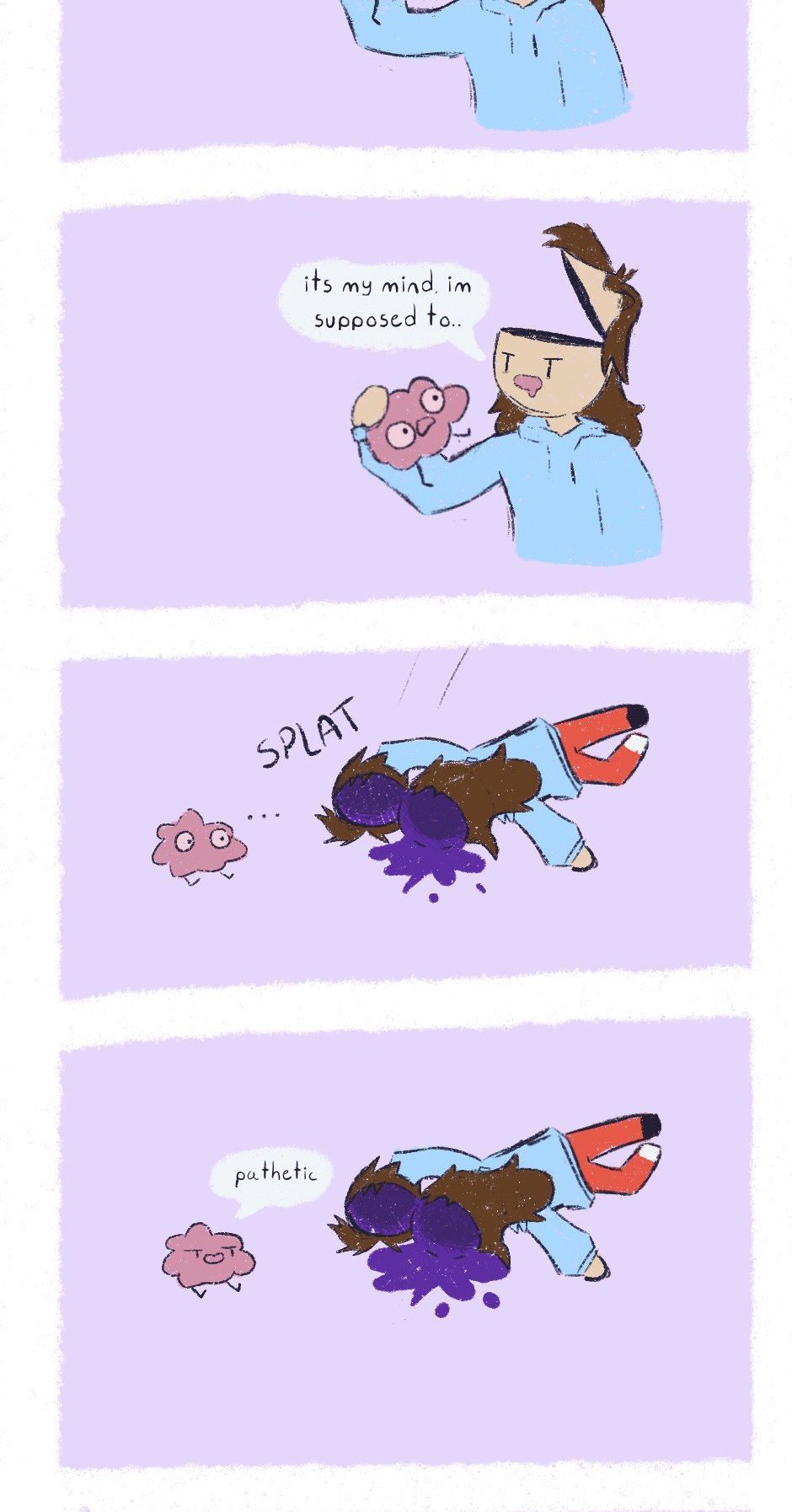 The first two panels of the comic make a lot more sence in my head, it was supposed to be like she’s imagining an argument with someone and then she lost.