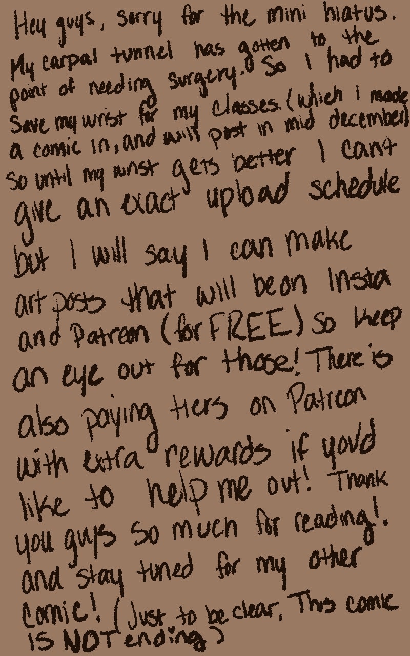 So sorry I’ve been gone guys! But it’s been a bit tough this semester! So I’m done making promises because with my wrist I can’t do so. But I will try my absolute best to get comics out to you guys in a timely manner (I’ve also improved a lot in my art from my classes so I’ll apply that to the comics in the future. Don’t forget to look out for the announcement about my college comic “Again” coming out mid December. I love you all and thank you so much!